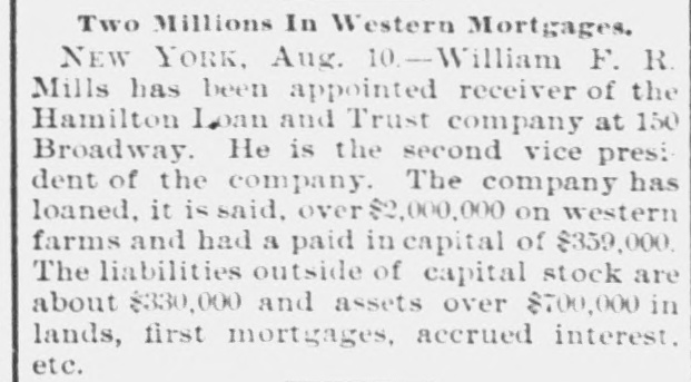 Two Millions In Western Mortgages. NEW YORK, Aug. 10.-William F. R. Mills has been appointed receiver of the Hamilton Loan and Trust company at 150 Broadway. He is the second vice presi dent of the company. The company has loaned, it is said, over $2,000,000 on western farms and had a paid in capital of $359,000. The liabilities outside of capital stock are about $330,000 and assets over $700,000 in lands, first mortgages, accrued interest. etc.