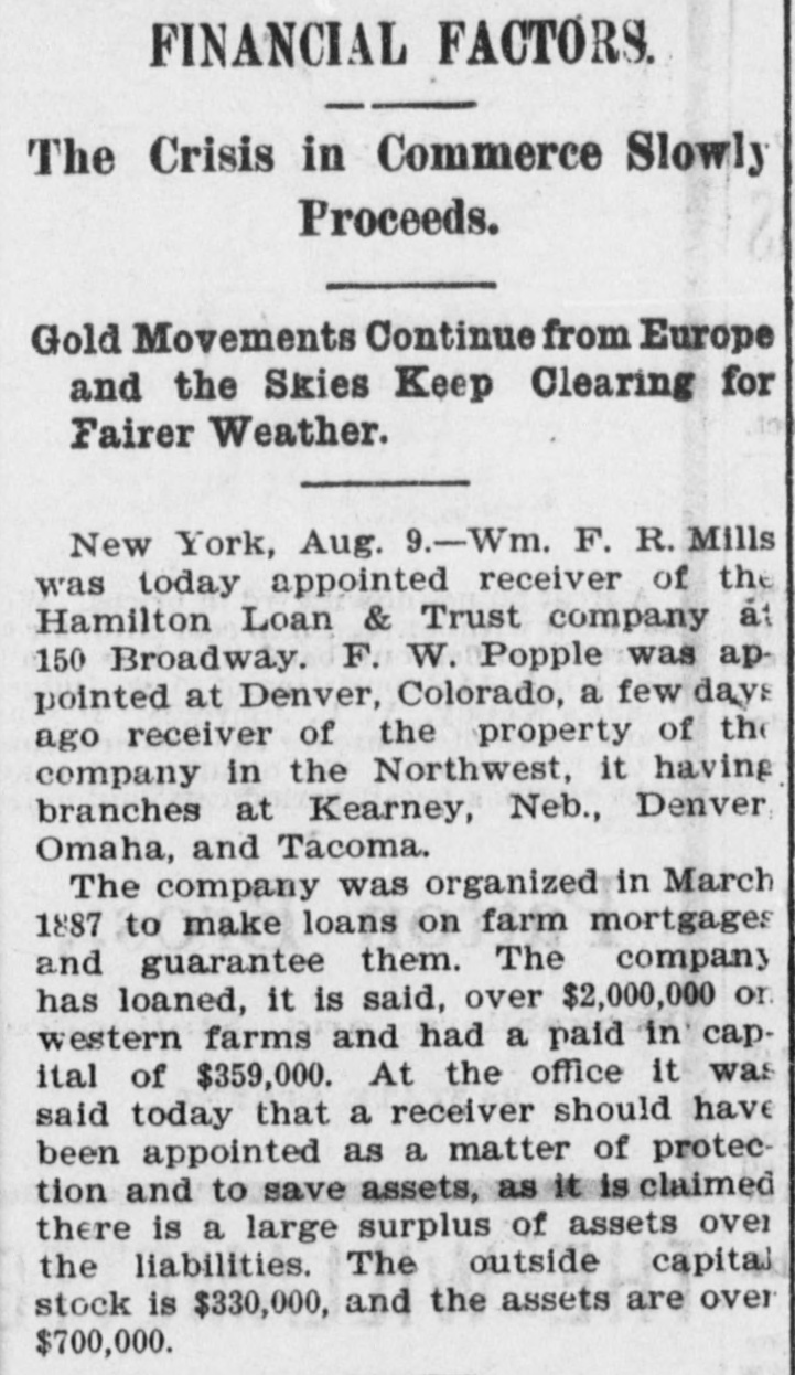 FINANCIAL FACTORS. The Crisis in Commerce Slowly Proceeds. Gold Movements Continue from Europe and the Skies Keep Clearing for Fairer Weather. New York, Aug. 9.-Wm. F. R. Mills was today appointed receiver of the Hamilton Loan & Trust company at 150 Broadway. F. W. Popple was appointed at Denver, Colorado, a few days ago receiver of the property of the company in the Northwest, it having branches at Kearney, Neb., Denver Omaha, and Tacoma. The company was organized in March 1887 to make loans on farm mortgages and guarantee them. The company has loaned, it is said, over $2,000,000 or western farms and had a paid in capital of $359,000. At the office it was said today that a receiver should have been appointed as a matter of protection and to save assets, as it is claimed there is a large surplus of assets over the liabilities. The outside capital stock is $330,000, and the assets are over $700,000.