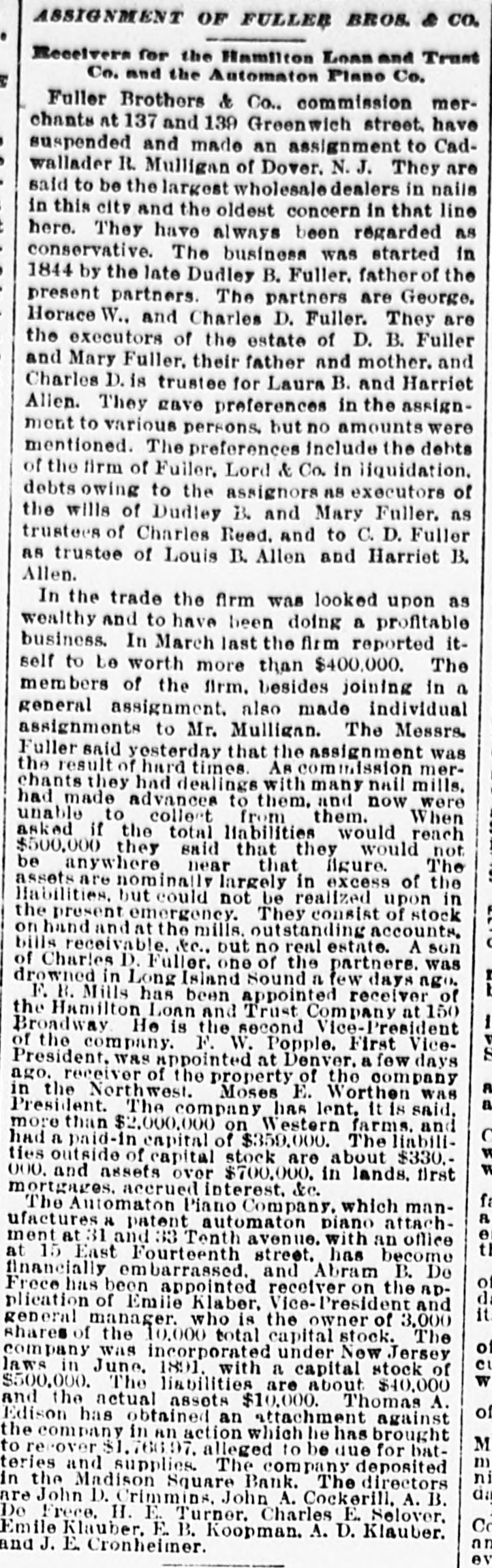 ASSIGNMENT OF FULLER BROS. d CO. Receivers for the Hamilton Loan and Trust Co. and the Automaton Plano Co. Fuller Brothers & Co.. commission merchants at 137 and 139 Greenwich street. have suspended and made an assignment to Cadwallader R. Mulligan of Dover. N. J. They are said to be the largest wholesale dealers in nails in this city and the oldest concern in that line here. They have always been regarded as conservative. The business was started in 1844 by the late Dudley B. Fuller. father of the present partners. The partners are George. Horace W., and Charles D. Fuller. They are the executors of the estate of D. B. Fuller and Mary Fuller, their father and mother. and Charles D. is trustee for Laura B. and Harriet Allen. They gave preferences in the assignment to various persons. but no amounts were mentioned. The preferences include the debts of the firm of Fuller. Lord & Co. in liquidation. debts owing to the assignors AS executors of the wills of Dudley B. and Mary Fuller. as trustees of Charles Reed. and to C. D. Fuller as trustee of Louis B. Allen and Harriet B. Allen. In the trade the firm was looked upon as wealthy and to have been doing a profitable business. In March last the firm reported itself to be worth more than $400,000. The members of the firm. besides joining in a general assignment. also made individual assignments to Mr. Mulligan. The Messrs. Fuller said yesterday that the assignment was the result of hard times. As commission merchants they had dealings with many nail mills, had made advances to them. and now were unable to collect from them. When asked if the total liabilities would reach $500,000 they said that they would not be anywhere near that figure. The assets are nominally largely in excess of the Habilities. but could not be realized upon in the present emergency. They consist of stock on hand and at the mills. outstanding accounts. bills receivable. &c., out no real estate. A son of Charles D. Fuller. one of the partners. was drowned in Long Island Sound a few days ago. F. B. Mills has been appointed receiver of the Hamilton Loan and Trust Company at 150 Broadway He is the second Vice-President of the company. F. W. Popple. First VicePresident. was appointed at Denver. a few days ago. receiver of the property of the company in the Northwest. Moses E. Worthen was President. The company has lent. it is said, more than $2,000,000 on Western farms. and had a paid-in capital of $359,000. The liabilities outside of capital stock are about $330.000. and assets over $700.000. in lands. first mortgages. accrued interest. &c. The Automaton Piano Company. which mana ufactures H. patent automaton piano attachment at 31 and 33 Tenth avenue. with an office at 15 East Fourteenth street. has become financially embarrassed. and Abram B. De Frece has been appointed receiver on the apd plication of Emile Klaber, e-President and general manager. who is the owner of 3,000 shares of the 10.000 total capital stock. The company was incorporated under New Jersey laws in June. 1891. with a capital stock of $500.000. The liabilities are about $40,000 and the actual assets $10,000. Thomas A. of Edison has obtained an attachment against the company in An action which he has brought M to recover $1. 766.97. alleged to be due for batteries and supplies. The company deposited ni in the Madison Square Bank. The directors da are John D. Crimmins. John A. Cockerill, A. B. Do Frece. H. E. Turner. Charles E. Selover. Co Emile Klauber. E. B. Koopman. A. D. Klauber. Crenh on