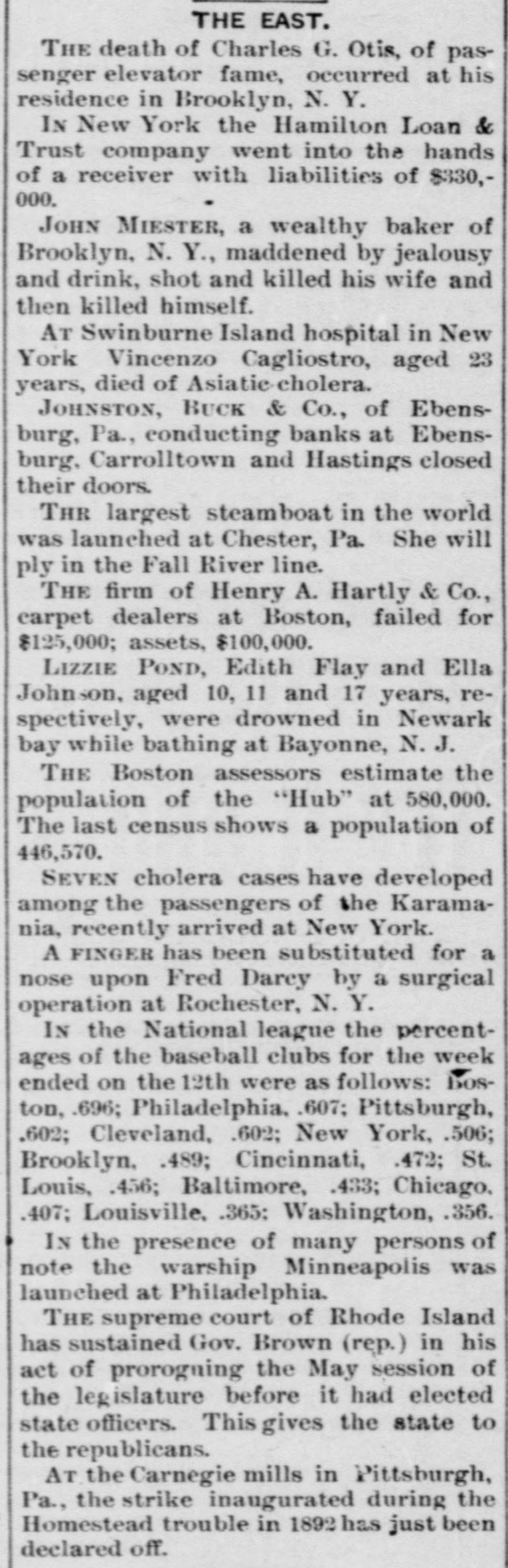 THE EAST. THE death of Charles G. Otis, of passenger elevator fame, occurred at his residence in Brooklyn, N. Y. IN New York the Hamilton Loan & Trust company went into the hands of a receiver with liabilities of $330,000. JOHN MIESTER, a wealthy baker of Brooklyn, N. Y., maddened by jealousy and drink, shot and killed his wife and then killed himself. AT Swinburne Island hospital in New York Vincenzo Cagliostro, aged 23 years, died of Asiatic-cholera. JOHNSTON, BUCK & Co., of Ebensburg, Pa., conducting banks at Ebensburg, Carrolltown and Hastings closed their doors. THR largest steamboat in the world was launched at Chester, Pa. She will ply in the Fall River line. THE firm of Henry A. Hartly & Co., carpet dealers at Boston, failed for $125,000; assets, $100,000. LIZZIE POND, Edith Flay and Ella Johnson, aged 10, 11 and 17 years, respectively, were drowned in Newark bay while bathing at Bayonne, N. J. THE Boston assessors estimate the population of the "Hub" at 580,000. The last census shows a population of 446,570. SEVEN cholera cases have developed among the passengers of the Karamania, recently arrived at New York. A FINGER has been substituted for a nose upon Fred Darcy by a surgical operation at Rochester, N. Y. IN the National league the percentages of the baseball clubs for the week ended on the 12th were as follows: boston, .696; Philadelphia, .607; Pittsburgh, .602; Cleveland, .602; New York, .506; Brooklyn, .489; Cincinnati, .472; St. Louis, .456; Baltimore, .433; Chicago. .407; Louisville, .365: Washington, .356. IN the presence of many persons of note the warship Minneapolis was launched at Philadelphia. THE supreme court of Rhode Island has sustained Gov. Brown (rep.) in his act of prorogning the May session of the legislature before it had elected state officers. This gives the state to the republicans. AT the Carnegie mills in Pittsburgh, Pa., the strike inaugurated during the Homestead trouble in 1892 has just been declared off.
