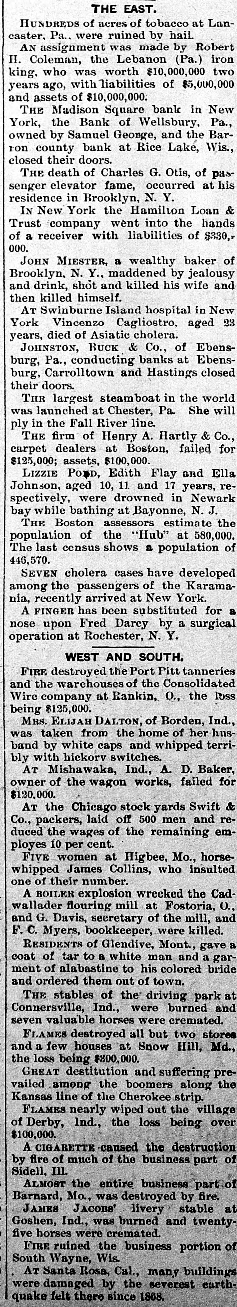 HUNDREDS of acres of tobacco at Lancaster, Pa., were ruined by hail. AN assignment was made by Robert H. Coleman, the Lebanon (Pa.) iron king, who was worth $10,000,000 two years ago, with liabilities of $5,000,000 and assets of $10,000,000. THE Madison Square bank in New York, the Bank of Wellsbury, Pa., owned by Samuel George, and the Barron county bank at Rice Lake, Wis., closed their doors. THE death of Charles G. Otis, of passenger elevator fame, occurred at his residence in Brooklyn, N. Y. IN New York the Hamilton Loan & Trust company went into the hands of a receiver with liabilities of $330,000. JOHN MIESTER, a wealthy baker of Brooklyn, N. Y., maddened by jealousy and drink, shot and killed his wife and then killed himself. AT Swinburne Island hospital in New York Vincenzo Cagliostro, aged 23 years, died of Asiatic cholera. JOHNSTON, BUCK & Co., of Ebensburg, Pa., conducting banks at Ebensburg, Carrolltown and Hastings closed their doors. THR largest steamboat in the world was launched at Chester, Pa. She will ply in the Fall River line. THE firm of Henry A. Hartly & Co., carpet dealers at Boston, failed for $125,000; assets, $100,000. LIZZIE POLD, Edith Flay and Ella Johnson, aged 10, 11 and 17 years, respectively, were drowned in Newark bay while bathing at Bayonne, N. J. THE Boston assessors estimate the population of the "Hub" at 580,000. The last census shows a population of 446,570. SEVEN cholera cases have developed among the passengers of the Karamania, recently arrived at New York. A FINGER has been substituted for a nose upon Fred Darcy by a surgical operation at Rochester, N. Y. WEST AND SOUTH. FIRE destroyed the Port Pitt tanneries and the warehouses of the Consolidated Wire company at Rankin, O., the loss being $125,000. MRS. ELIJAH DALTON, of Borden, Ind., was taken from the home of her husband by white caps and whipped terribly with hickorv switches. AT Mishawaka, Ind., A. D. Baker, owner of the wagon works, failed for $120,000. AT the Chicago stock yards Swift & Co., packers, laid off 500 men and reduced the wages of the remaining employes 10 per cent. FIVE women at Higbee, Mo., horsewhipped James Collins, who insulted one of their number. A BOILER explosion wrecked the Cadwallader flouring mill at Fostoria, o., and G. Davis, secretary of the mill, and F.C. Myers, bookkeeper, were killed. RESIDENTS of Glendive, Mont., gave a coat of tar to a white man and a garment of alabastine to his colored bride and ordered them out of town. THE stables of the driving park at Connersville, Ind., were burned and seven valuable horses were cremated. FLAMES destroyed all but two stores and a few houses at Snow Hill, Md., the loss being $300,000. GREAT destitution and suffering prevailed among the boomers along the Kansas line of the Cherokee strip. FLAMES nearly wiped out the village of Derby, Ind., the loss being over $100,000. A CIGARETTE caused the destruction by fire of much of the business part of Sidell, III. ALMOST the entire business part of Barnard, Mo., was destroyed by fire. JAMES JACOBS' livery stable at Goshen, Ind., was burned and twentyfive horses were cremated. FIRE ruined the business portion of South Wayne, Wis.