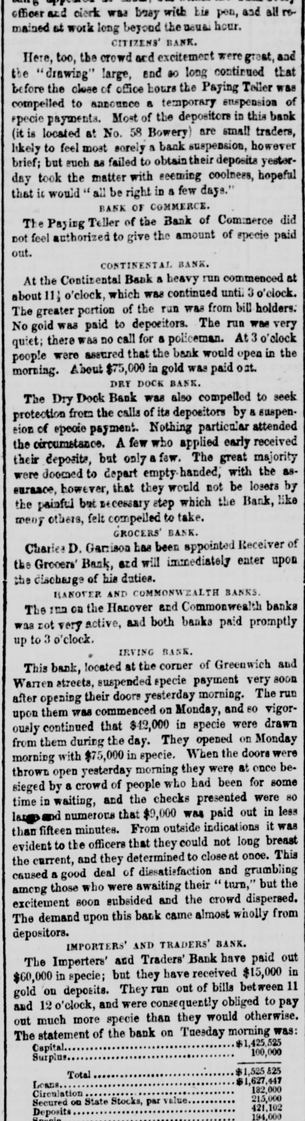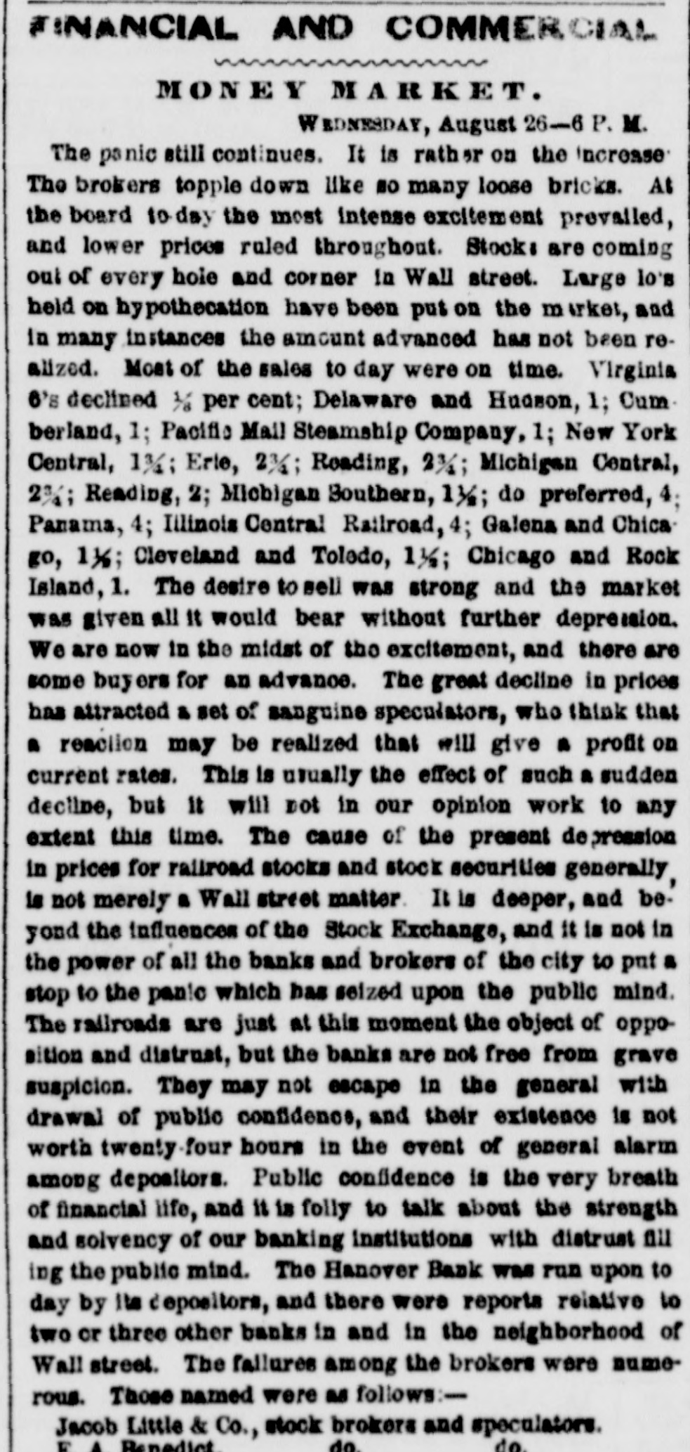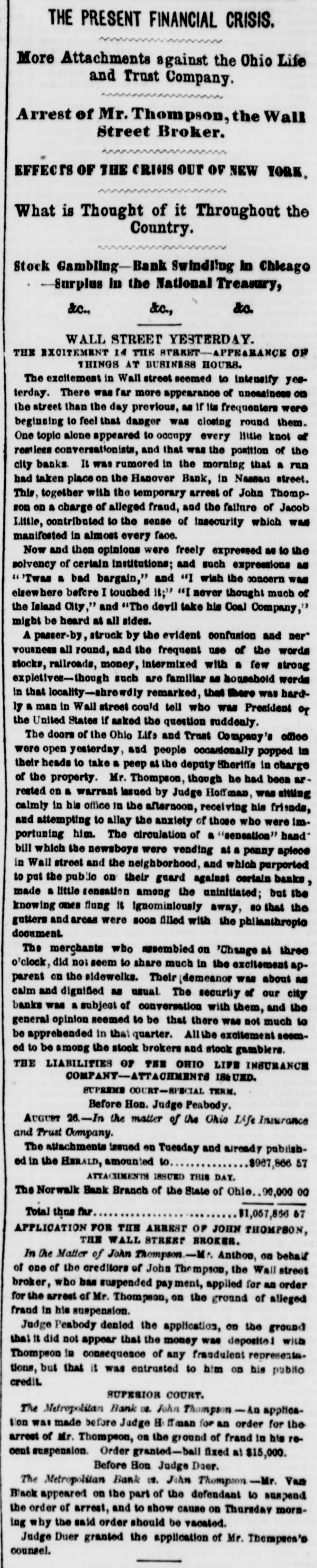 THE PRESENT FINANCIAL CRISIS. More Attachments against the Ohio Life and Trust Company. Arrest of Mr. Thompson, the Wall Street Broker. EFFECTS OF THE CRICIS our OF NEW YORK, What is Thought of it Throughout the Country. Stock Gambling-Bank Swindling in Chieago Surplus in the National Treasury, do. &c., &c., WALL STREET YESTERDAY. THE EXCITEMENT IN THE STREET-APPEARANCE OF THINGS AT BUSINESS HOURS. The excitement in Wall street seemed to intensify yesterday. There was far more appearance of uneasiness on the street than the day previous, as If its frequenters were beginning to feel that danger was closing round them. One topic alone appeared to occupy every little knot of resuless conversationists, and that was the position of the city banks. It was rumored in the morning that a run had taken place on the Hanover Bank, in Nassau street. This, together with the temporary arrest of John Thompson on a charge of alleged fraud, and the failure of Jacob Little, contributed to the sense of insecurity which was manifested in almost every face. Now and then opinions were freely expressed as to the solvency of certain institutions; and such expressions MI 'Twas a bad bargain," and "I wish the concern was elsewhere before I touched it;" "I never thought much of the Island City," and "The devil take his Coal Company," might be heard at all sides. A passer-by, struck by the evident confusion and ner" vousness all round, and the frequent use of the words stocks, railroads, money, intermixed with a few strong expletives-though such are familiar as household words in that locality-shrewdly remarked, that there was hardly a man in Wall street could tell who was President or the United States if asked the question suddenly. The doors of the Ohio Life and Trust Company's office were open yesterday, and people occasionally popped in their heads to take a peep at the deputy Sheriffs in charge of the property. Mr. Thompson, though he had been arrested on a warrant issued by Judge Hoffman, was sitting calmly in his office in the afternoon, receiving his friends, and attempting to allay the anxiety of those who were Importuning him. The circulation of a "sensation" handbill which the newsboys were vending at a penny aplece in Wall street and the neighborhood, and which purported to put the public on their guard against certain banks, made a little sensation among the uninitiated; but the knowing ones flung It Ignominiously away, so that the gutters and areas were soon filled with the philanthropic document. The merchants who assembled on 'Change at three o'clock, did not seem to share much in the excitement apparent on the sidewelks. Their [demeanor was about as calm and dignified as usual. The security of our city banks was a subject of conversation with them, and the general opinion seemed to be that there was not much to be apprehended in that quarter. Allihe excitement seemed to be among the stock brokers and stock gamblers. THE LIABILITIES OF TEE OHIO LIFE INSURANCE COMPANY-ATTACHMENTS IS&UED. SUPREME COURT-SPECIAL TERM. Before Hon. Judge Peabody. AUGUST 26.-In the matter of the Ohio Life Insurance and Trust Company. The attachments issued en Tuesday and already published in the HERALD, amounted to $987,866.57 ATTACHMENTS ISSUED THIS DAY. The Norwalk Bank Branch of the State of Ohio 90,000 00 Total thus far $1,057,866 67 APPLICATION FOR THE ARREST OF JOHN THOMPSON, THE WALL STREET BROKER. In the Matter of John Thompson.-M. Anthon, on behalf of one of the creditors of John Thompson, the Wall street broker, who bas suspended payment, applied for an order for the arrest of Mr. Thompson, on the ground of alleged fraud in his suspension. Judge Peabody denied the application, on the ground that it did not appear that the money was deposite with Thompson in consequence of any fraudulent representstions, but that it was entrusted to him on his public credit. SUPERIOR COURT. The Metropolitan Bank us. John Thompson.-An application was made before Judge H ffman for an order for the arrest of Mr. Thompson, on the ground of frand in his recent suspension. Order granted-ball fixed at $15,000. Before Hon Judge Duer. The Metropolitan Bank US. John Thompson.-Mr. Van Black appeared on the part of the defendant to suspend the order of arrest, and to show cause on Thursday morning why the said order should be vacated. Judge Duer granted the application of Mr. Thempson's counsel.