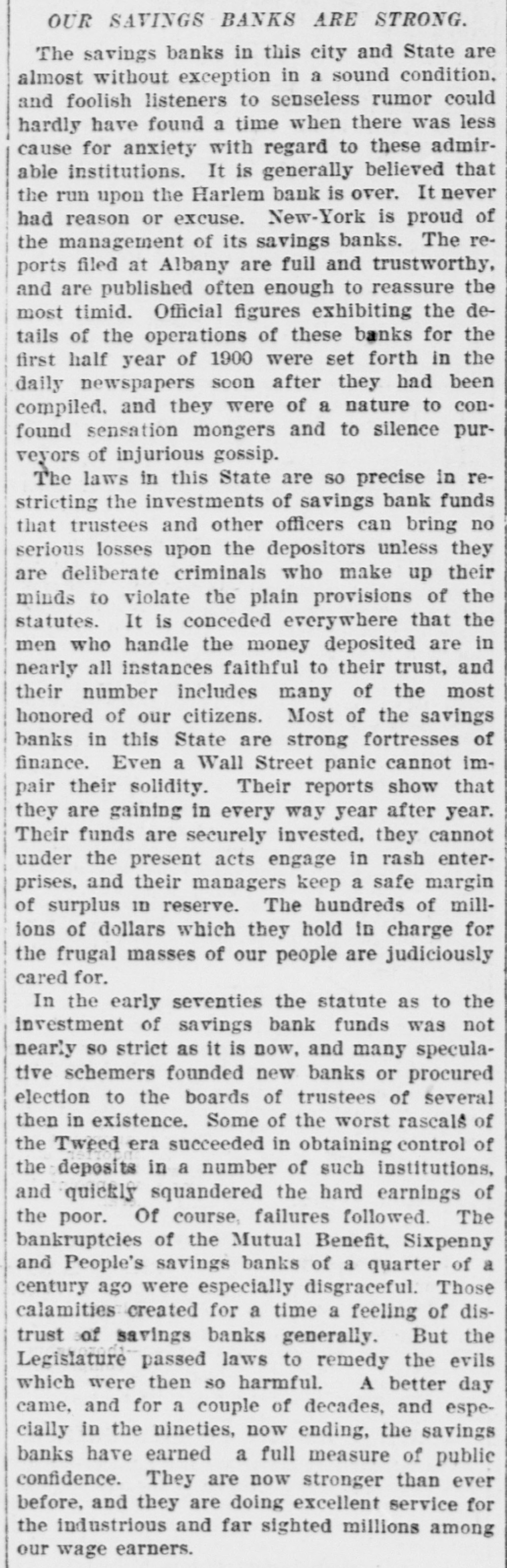 OUR SAVINGS BANKS ARE STRONG. The savings banks in this city and State are almost without exception in a sound condition. and foolish listeners to senseless rumor could hardly have found a time when there was less cause for anxiety with regard to these admirable institutions. It is generally believed that the run upon the Harlem bank is over. It never had reason or excuse. New-York is proud of the management of its savings banks. The reports filed at Albany are full and trustworthy. and are published often enough to reassure the most timid. Official figures exhibiting the details of the operations of these banks for the first half year of 1900 were set forth in the daily newspapers soon after they had been compiled. and they were of a nature to confound sensation mongers and to silence purveyors of injurious gossip. The laws in this State are so precise in restricting the investments of savings bank funds that trustees and other officers can bring no serious losses upon the depositors unless they are deliberate criminals who make up their minds to violate the plain provisions of the statutes. It is conceded everywhere that the men who handle the money deposited are in nearly all instances faithful to their trust, and their number includes many of the most honored of our citizens. Most of the savings banks in this State are strong fortresses of finance. Even a Wall Street panic cannot impair their solidity. Their reports show that they are gaining in every way year after year. Their funds are securely invested. they cannot under the present acts engage in rash enterprises, and their managers keep a safe margin of surplus ID reserve. The hundreds of millions of dollars which they hold in charge for the frugal masses of our people are judiciously cared for. In the early seventies the statute as to the investment of savings bank funds was not nearly so striet as it is now, and many speculative schemers founded new banks or procured election to the boards of trustees of several then in existence. Some of the worst rascals of the Tweed era succeeded in obtaining control of the deposits in a number of such institutions, and quickly squandered the hard earnings of the poor. Of course, failures followed. The bankruptcies of the Mutual Benefit, Sixpenny and People's savings banks of a quarter of a century ago were especially disgraceful. Those calamities created for a time a feeling of distrust of savings banks generally. But the Legislature passed laws to remedy the evils which were then so harmful. A better day came, and for a couple of decades, and especially in the nineties, now ending, the savings banks have earned a full measure of public confidence. They are now stronger than ever before, and they are doing excellent service for the industrious and far sighted millions among our wage earners.