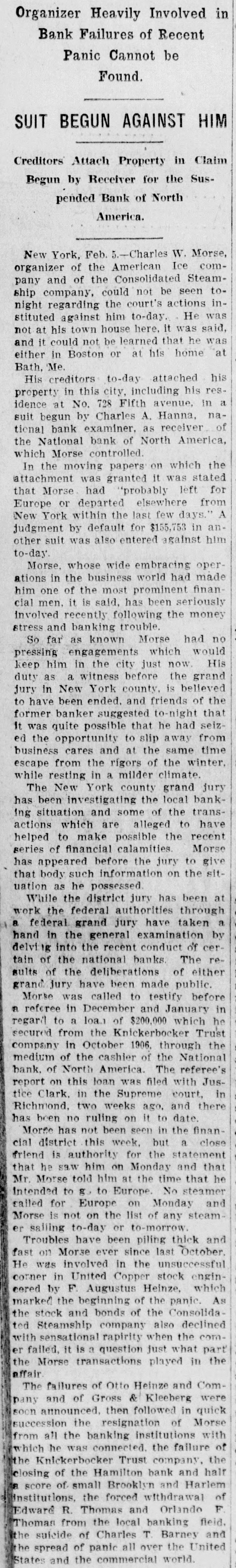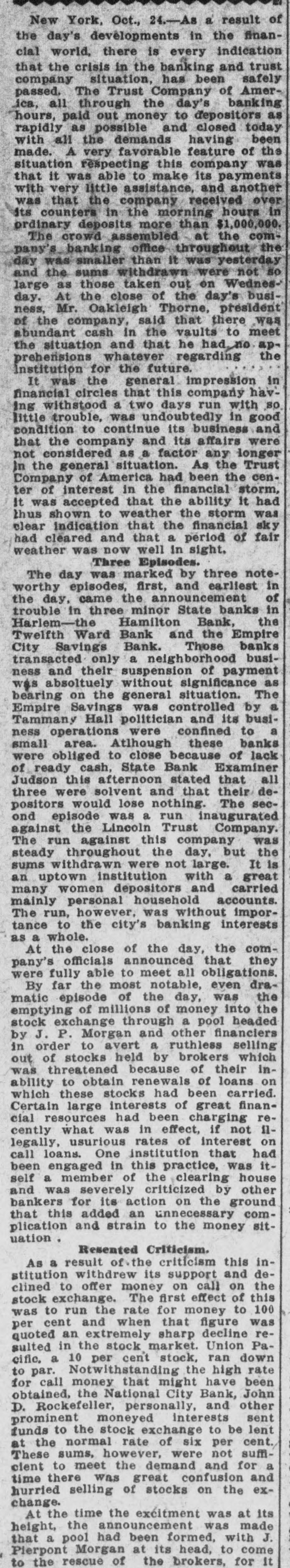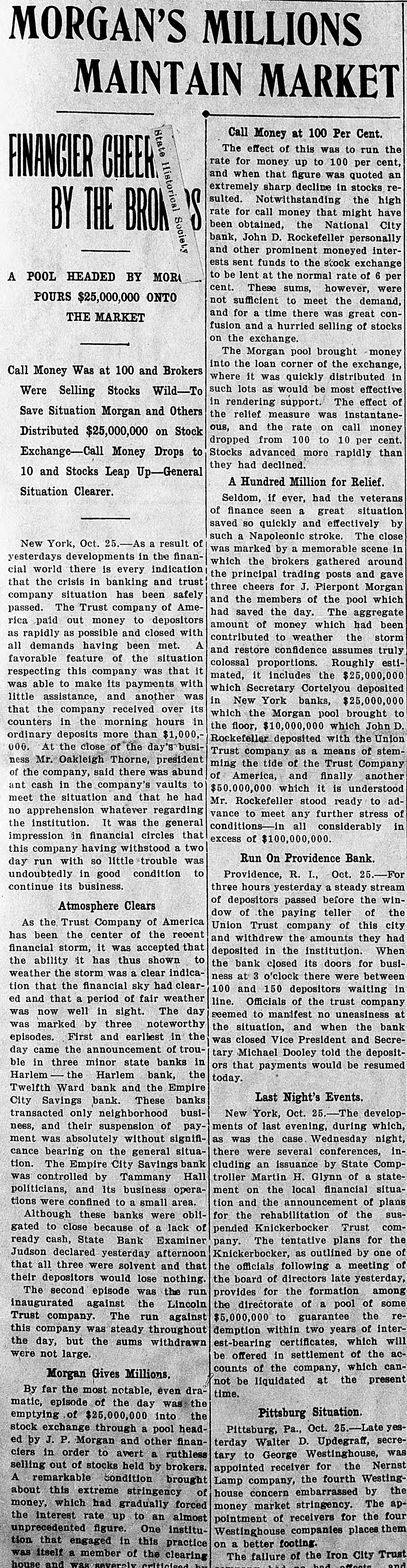 e MAINTAIN MARKET Call Money at 100 Per Cent. The effect of this was to run the rate for money up to 100 per cent, FINANCIER CHEEK and when that figure was quoted an extremely sharp decline in stocks resulted. Notwithstanding the high rate for call money that might have been obtained, the National City BY THE BRON bank, John D. Rockefeller personally and other prominent moneyed interests sent funds to the stock exchange to be lent at the normal rate of 6 per A POOL HEADED BY MORA cent. These sums, however, were POURS $25,000,000 ONTO not sufficient to meet the demand, and for a time there was great conTHE MARKET fusion and a hurried selling of stocks on the exchange. The Morgan pool brought money into the loan corner of the exchange, Call Money Was at 100 and Brokers where it was quickly distributed in such lots as would be most effective Were Selling Stocks Wild-To in rendering support. The effect of Save Situation Morgan and Others the relief measure was instantaneous, and the rate on call money Distributed $25,000,000 on Stock dropped from 100 to 10 per cent. Stocks advanced more rapidly than Exchange-Call Money Drops to they had declined. 10 and Stocks Leap Up-General A Hundred Million for Relief. Situation Clearer. Seldom, if ever, had the veterans of finance seen a great situation saved so quickly and effectively by such a Napoleonic stroke. The close New York, Oct. 25.-As a result of was marked by a memorable scene in yesterdays developments in the finanwhich the brokers gathered around cial world there is every indication the principal trading posts and gave that the crisis in banking and trust three cheers for J. Pierpont Morgan company situation has been safely and the members of the pool which passed. The Trust company of Amehad saved the day. The aggregate rica paid out money to depositors amount of money which had been as rapidly as possible and closed with contributed to weather the storm A all demands having been met. and restore confidence assumes truly favorable feature of the situation colossa) proportions. Roughly estirespecting this company was that it mated, it includes the $25,000,000 was able to make its payments with which Secretary Cortelyou deposited little assistance, and another was in New York banks, $25,000,000 that the company received over its which the Morgan pool brought to counters in the morning hours in the floor, $10,000,000 which John D. ordinary deposits more than $1,000, Rockefeller deposited with the Union 000. At the close of the day's busiTrust company as a means of stemness Mr. Oakleigh Thorne, president ming the tide of the Trust Company of the company, said there was abund of America, and finally another ant cash in the company's vaults to $50,000,000 which it is understood meet the situation and that he had Mr. Rockefeller stood ready to adno apprehension whatever regarding vance to meet any further stress of the institution. It was the general conditions-in all considerably in impression in financial circles that excess of $100,000,000. this company having withstood a two Run On Providence Bank. day run with so little trouble was undoubtedly in good condition to Providence, R. I., Oct. 25.-For continue its business. three hours yesterday a steady stream of depositors passed before the winAtmosphere Clears dow of the paying teller of the As the Trust Company of America Union Trust company of this city has been the center of the recent and withdrew the amounts they had financial storm, it was accepted that deposited in the institution. When the ability it has thus shown to the bank closed its doors for busiweather the storm was a clear indicaness at 3 o'clock there were between tion that the financial sky had clear100 and 150 depositors waiting in ed and that a period of fair weather line. Officials of the trust company was now well in sight. The day seemed to manifest no uneasiness at was marked by three noteworthy the situation, and when the bank episodes. First and earliest in the was closed Vice President and Secreday came the announcement of troutary Michael Dooley told the depositble in three minor state banks in ors that payments would be resumed Harlem-the Harlem bank, the today. Twelfth Ward bank and the Empire Last Night's Events. City Savings bank. These banks transacted only neighborhood busiNew York, Oct. 5.-The developness, and their suspension of payments of last evening, during which, as was the case Wednesday night, ment was absolutely without signifithere were several conferences, incance bearing on the general situation. The Empire City Savings bank cluding an issuance by State Comptroller Martin H. Glynn of a statewas controlled by Tammany Hall ment on the local financial situapoliticians, and its business operations were confined to a small area. tion and the announcement of plans Although these banks were oblifor the rehabilitation of the susgated to close because of a lack of pended Knickerbocker Trust comready cash, State Bank Examiner pany. The tentative plans for the Judson declared yesterday afternoon Knickerbocker, as outlined by one of that all three were solvent and that the officials following a meeting of the board of directors late yesterday, their depositors would lose nothing The second episode was the run provides for the formation among inaugurated against the Lincoln the directorate of a pool of some Trust company. The run against $5,000,000 to guarantee the rethis company was steady throughout demption within two years of interthe day, but the sums withdrawn est-bearing certificates, which will were not large. be offered in settlement of the accounts of the company, which canMorgan Gives Millions. not be liquidated at the present By far the most notable, even dratime. matic, episode of the day was the Pittsburg Situation. emptying of $25,000,000 into the stock exchange through a pool headPittsburg, Pa., Oct. 25.-Late yesed by J. P. Morgan and other finanterday Walter D. Updegraff, secreciers in order to