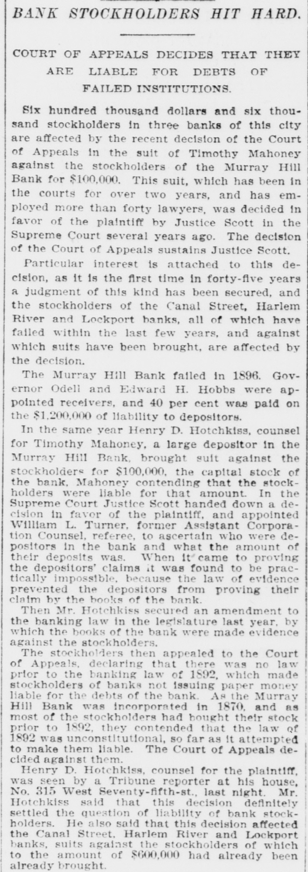 BANK STOCKHOLDERS HIT HARD. COURT OF APPEALS DECIDES THAT THEY ARE LIABLE FOR DEBTS OF FAILED INSTITUTIONS. Six hundred thousand dollars and six thousand stockholders in three banks of this city are affected by the recent decision of the Court of Appeals in the suit of Timothy Mahoney against the stockholders of the Murray Hill Bank for $100,000. This suit, which has been in the courts for over two years, and has employed more than forty lawyers, was decided in favor of the plaintiff by Justice Scott in the Supreme Court several years ago. The decision of the Court of Appeals sustains Justice Scott. Particular interest is attached to this decision, as it is the first time in forty-five years a judgment of this kind has been secured, and the stockholders of the Canal Street, Harlem River and Lockport banks, all of which have failed within the last few years, and against which suits have been brought, are affected by the decision. The Murray Hill Bank failed in 1896. Governor Odell and Edward H. Hobbs were appointed receivers, and 40 per cent was paid on the $1,200,000 of liability to depositors. In the same year Henry D. Hotchkiss, counsel for Timothy Mahoney, a large depositor in the Murray Hill Bank, brought suit against the stockholders for $100,000, the capital stock of the bank, Mahoney contending that the stockholders were liable for that amount. In the Supreme Court Justice Scott handed down a decision in favor of the plaintiff, and appointed William L. Turner, former Assistant Corporation Counsel, referee, to ascertain who were depositors in the bank and what the amount of their deposits was. When it came to proving the depositors' claims it was found to be practically impossible, because the law of evidence prevented the depositors from proving their claim by the books of the bank. Then Mr. Hotchkiss secured an amendment to the banking law in the legislature last year. by which the books of the bank were made evidence against the stockholders. The stockholders then appealed to the Court of Appeals, declaring that there was no law prior to the banking law of 1892, which made stockholders of banks not issuing paper money liable for the debts of the bank. As the Murray Hill Bank was Incorporated in 1870, and as most of the stockholders had bought their stock prior to 1892, they contended that the law of 1892 was unconstitutional, so far as it attempted to make them liable. The Court of Appeals decided against them. Henry D. Hotchkiss, counsel for the plaintiff, was seen by a Tribune reporter at his house, No. 315 West Seventy-fifth-st., last night. Mr. Hotchkiss said that this decision definitely settled the question of liability of bank stockholders. He also said that this decision affected the Canal Street, Harlem River and Lockport banks, suits against the stockholders of which to the amount of $600,000 had already been already brought.