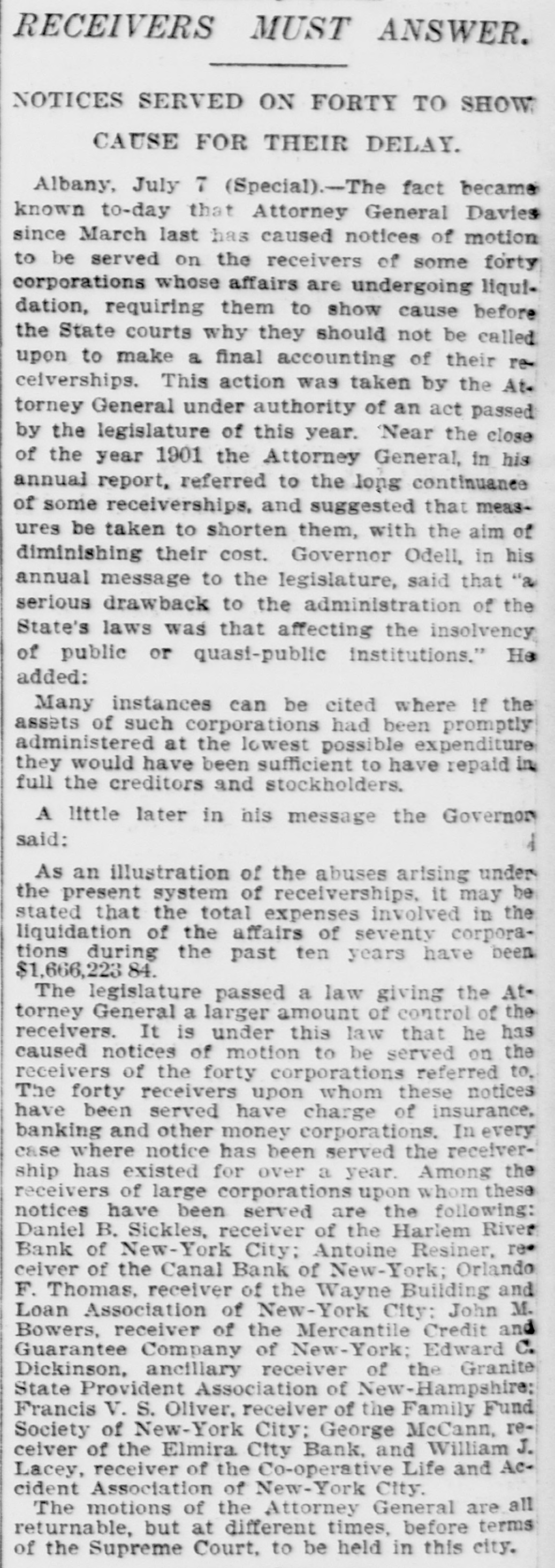RECEIVERS MUST ANSWER. NOTICES SERVED ON FORTY TO SHOW CAUSE FOR THEIR DELAY. Albany, July 7 (Special).-The fact became known to-day that Attorney General Davies since March last has caused notices of motion to be served on the receivers of some forty corporations whose affairs are undergoing liquidation, requiring them to show cause before the State courts why they should not be called upon to make a final accounting of their receiverships. This action was taken by the At. torney General under authority of an act passed by the legislature of this year. 'Near the close of the year 1901 the Attorney General, in his annual report, referred to the long continuance of some receiverships, and suggested that measures be taken to shorten them, with the aim of diminishing their cost. Governor Odell, in his annual message to the legislature, said that "a serious drawback to the administration of the State's laws was that affecting the insolvency of public or quasi-public institutions." He added: Many instances can be cited where If the assets of such corporations had been promptly administered at the lowest possible expenditure they would have been sufficient to have repaid in full the creditors and stockholders. A little later in his message the Governor said: As an illustration of the abuses arising under the present system of receiverships, it may be stated that the total expenses involved in the liquidation of the affairs of seventy corporations during the past ten years have been $1,666,223.84 The legislature passed a law giving the Attorney General a larger amount of control of the receivers. It is under this law that he has caused notices of motion to be served on the receivers of the forty corporations referred to. The forty receivers upon whom these notices have been served have charge of insurance, banking and other money corporations. In every case where notice has been served the receivership has existed for over a year. Among the receivers of large corporations upon whom these notices have been served are the following: Daniel B. Sickles, receiver of the Harlem River Bank of New-York City: Antoine Resiner, re. ceiver of the Canal Bank of New-York; Orlando F. Thomas, receiver of the Wayne Building and Loan Association of New-York City: John M. Bowers, receiver of the Mercantile Credit and Guarantee Company of New-York: Edward C. Dickinson, ancillary receiver of the Granite State Provident Association of New-Hampshire; Francis V. S. Oliver, receiver of the Family Fund Society of New-York City: George McCann, receiver of the Elmira City Bank, and William J. Lacey, receiver of the Co-operative Life and Accident Association of New-York City. The motions of the Attorney General are all returnable, but at different times, before terms of the Supreme Court, to be held in this city.