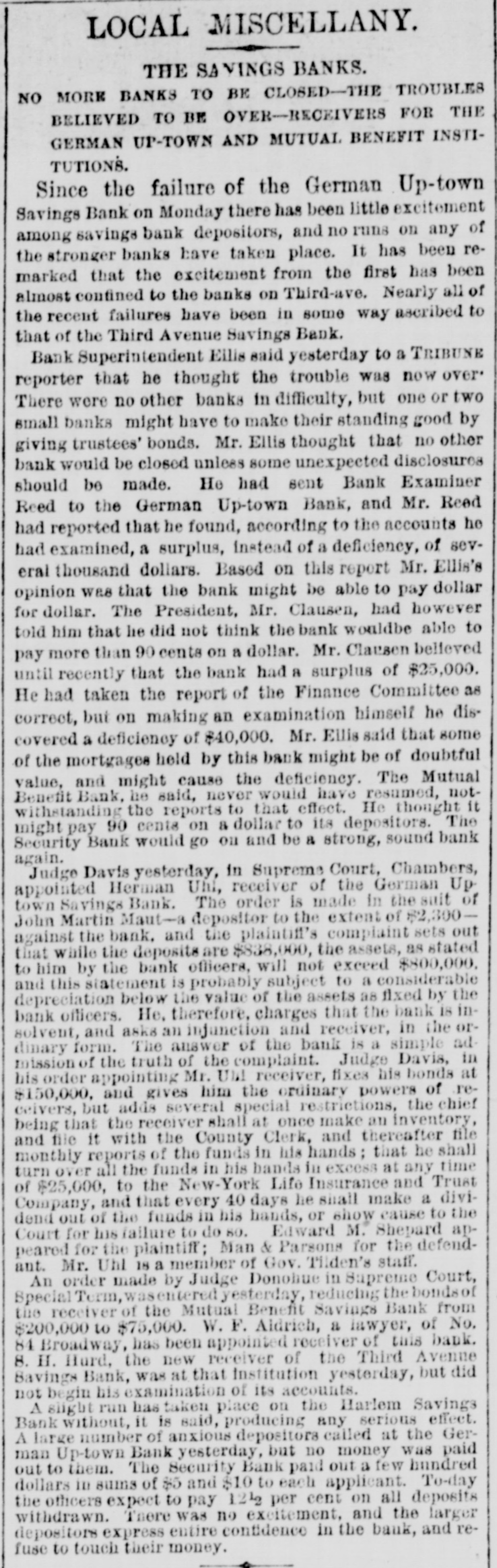 LOCAL MISCELLANY. THE SAVINGS BANKS. NO MORK BANKS TO BE CLOSED-THE TROUBLES BELIEVED TO BE OVER-RECEIVERS FOR THE GERMAN UP-TOWN AND MUTUAL BENEFIT INSTITUTIONS. Since the failure of the German Up-town Savings Bank on Monday there has been little excitement among savings bank depositors, and no runs on any of the stronger banks have taken place. It has been remarked that the excitement from the first has been almost contined to the banks on Third-ave. Nearly all of the recent failures have been in some way ascribed to that of the Third Avenue Savings Bank. Bank Superintendent Eills said yesterday to a TRIBUNE reporter that he thought the trouble was now over* There were no other banks in difficulty, but one or two small banks might have to make their standing good by giving trustees' bonds. Mr. Ellis thought that no other bank would be closed unless some unexpected disclosures should be made. He had sent Bank Examiner Reed to the German Up-town Bank, and Mr. Read had reported that he found, according to the accounts he had examined, a surplus, instead of a deficiency, of several thousand dollars. Based on this report Mr. Ellis's opinion was that the bank might be able to pay dollar for dollar. The President, Mr. Clausen, had however told him that he did not think the bank wouldbe able to pay more than 90 cents on a dollar. Mr. Clausen believed until recently that the bank had a surplus of $25,000. He had taken the report of the Finance Committee as correct, but on making an examination himself he discovered a deficiency of $40,000. Mr. Ellis said that some of the mortgages held by this bank might be of doubtful value, and might cause the deficiency. The Mutual Benefit Bank, he said, never would have resumed, notwithstanding the reports to that effect. He thought it might pay 90 cents on a dollar to its depositors. The Security Bank would go on and be a strong, sound bank again. Judge Davis yesterday, in Supreme Court, Chambers, appointed Herman Uhi, receiver of the German Uptown Savings Bank. The order is made in the suit of John Martin Maut-a depositor to the extent of $2,300against the bank. and the plaintiff's complaint sets out that while the deposits are $838,000, the assets, as stated to him by the bank officers, will not exceed $800,000. and this statement is probably subject to a considerable depreciation below the value of the assets as fixed by the bank officers. He, therefore, charges that the bank is insolvent, and asks an injunction and receiver, in the ordinary form. The answer of the bank is a simple ad mission of the truth of the complaint. Judge Davis, in his order appointing Mr. UM receiver, fixes his bonds at $150,000. and gives him the ordinary powers of receivers, but adds several special restrictions, the chief being that the receiver shall at once make an inventory, and file it with the County Clerk, and thereafter file monthly reports of the funds in his hands; that he shall turn over all the funds in his bands in excess at any time of $25,000, to the New-York Life Insurance and Trust Company, and that every 40 days he shall make a dividend out of the funds in his hands, or show cause to the Court for his failure to do so. Edward M. Shepard appeared for the plaintiff; Man & Parsons for the defendant. Mr. Uhl 18 a member of Gov. Tilden's staff. An order made by Judge Donohue in Supreme Court, Special Term, wasentered yesterday, reducing the bonds of the receiver of the Mutual Benefit Savings Bank from $200,000 to $75,000. W. F. Aidrich, a lawyer, of No. 84 Broadway, has been appointed receiver of this bank. 8. H. Hurd, the new receiver of the Third Avenue Bavings Bank, was at that Institution yesterday, but did not begin his examination of its accounts. A slight run has taken place on the Harlem Savings Bank without, it is said, producing any serious effect. A large number of anxious depositora called at the German Up-town Bank yesterday, but no money was paid out to them. The Security Bank paid out a few hundred dollars in sums of $5 and $10 to each applicant. To-day the officers expect to pay 121g per cent on all deposits withdrawn. There was no excitement, and the larger depositors express entire confidence in the bank, and refuse to touch their money.