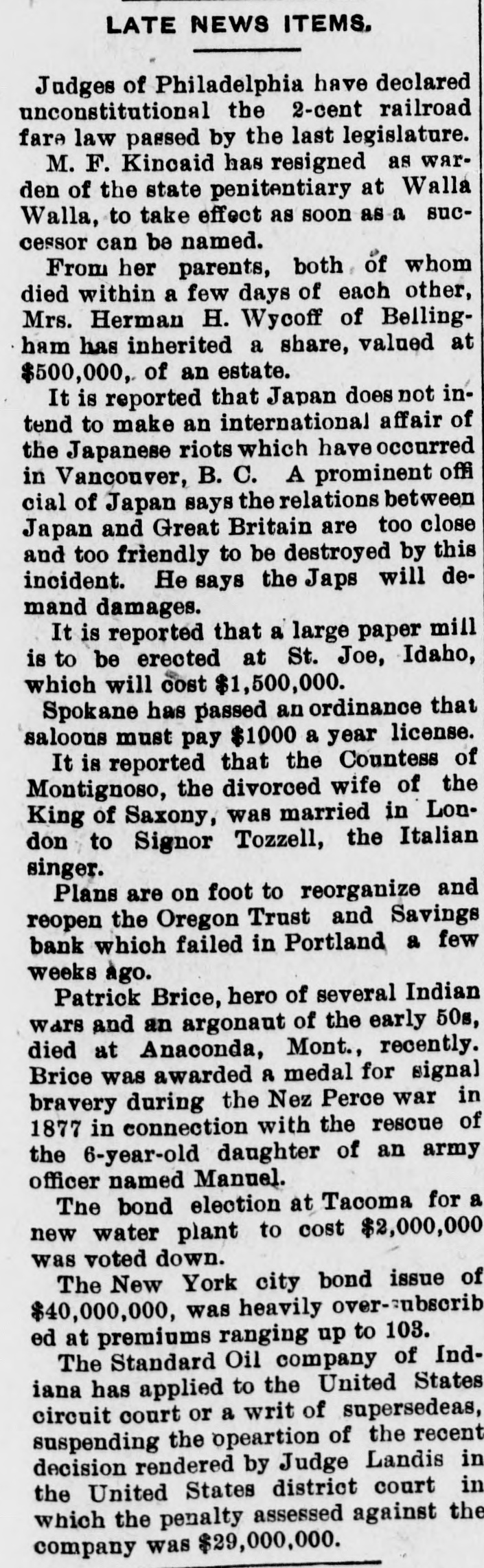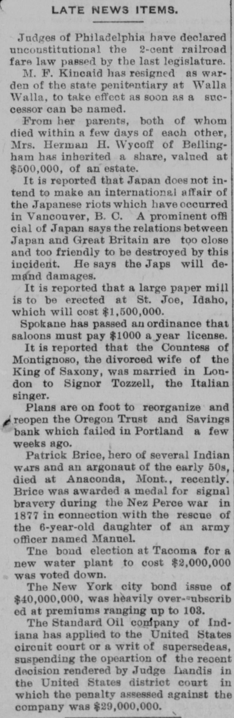 LATE NEWS ITEMS, Judges of Philadelphia have declared unconstitutional the 2-cent railroad fare law passed by the last legislature. M. F. Kincaid has resigned as warden of the state penitentiary at Walla Walla, to take effect as soon as a successor can be named. From her parents, both of whom died within a few days of each other, Mrs. Herman H. Wycoff of Bellingham has inherited a share, valued at $500,000, of an estate. It is reported that Japan doesnot intend to make an international affair of the Japanese riots which have occurred in Vancouver, B. C. A prominent offi cial of Japan says the relations between Japan and Great Britain are too close and too friendly to be destroyed by this incident. He says the Japs will demand damages. It is reported that a large paper mill is to be erected at St. Joe, Idaho, which will cost $1,500,000. Spokane has passed an ordinance that saloons must pay $1000 a year license. It is reported that the Countess of Montignoso, the divorced wife of the King of Saxony, was married in London to Signor Tozzell, the Italian singer. Plans are on foot to reorganize and reopen the Oregon Trust and Savings bank which failed in Portland a few weeks ago. Patrick Brice, hero of several Indian wars and an argonaut of the early 50s, died at Anaconda, Mont., recently. Brice was awarded a medal for signal bravery during the Nez Perce war in 1877 in connection with the rescue of the 6-year-old daughter of an army officer named Manuel. The bond election at Tacoma for a new water plant to cost $2,000,000 was voted down. The New York city bond issue of $40,000,000, was heavily over-ubscrib ed at premiums ranging up to 103. The Standard Oil company of Indiana has applied to the United States circuit court or a writ of supersedeas, suspending the opeartion of the recent decision rendered by Judge Landis in the United States district court in which the penalty assessed against the company was $29,000,000.