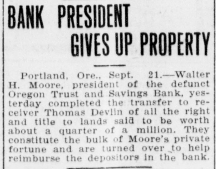 In his efforts to help reimburse the depositors of the defunct Oregon Trust and Savings bank, which recently failed in Portland, Walter H. Moore, president of the bank, with his wife, Mrs. Laura Moore, transferred to the receiver of the bank, Thomas Devlin, 7496 acres of rich farming lands in Multnomah, Morrow and Sherman counties, in Oregon, and in Franklin county, Washington, valued at $250,000.
