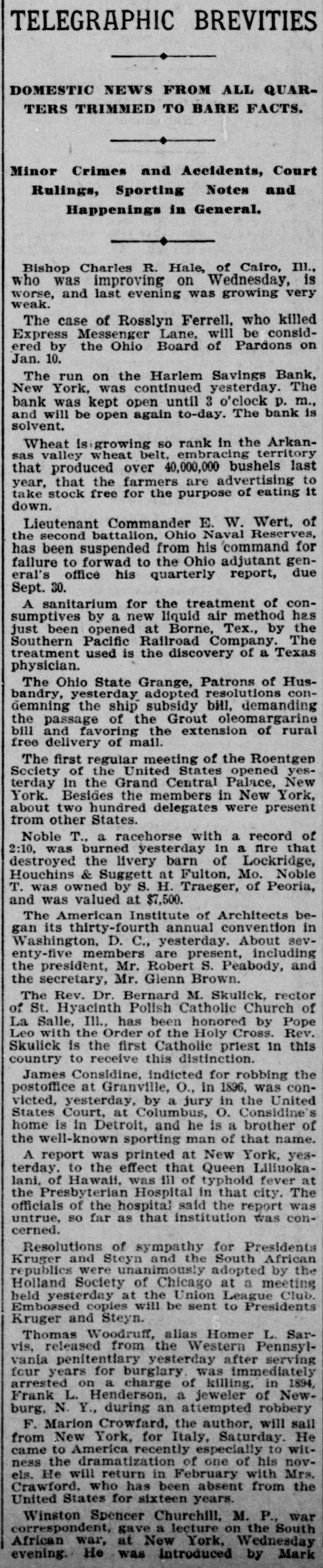 TELEGRAPHIC BREVITIES DOMESTIC NEWS FROM ALL QUARTERS TRIMMED TO BARE FACTS. Minor Crimes and Accidents, Court Rulings, Sporting Notes and Happenings in General. Bishop Charles R. Hale, of Cairo, Ill., who was improving on Wednesday, is worse, and last evening was growing very weak. The case of Rosslyn Ferrell, who killed Express Messenger Lane, will be considered by the Ohio Board of Pardons on Jan. 10. The run on the Harlem Savings Bank, New York, was continued yesterday. The bank was kept open until 3 o'clock p. m., and will be open again to-day. The bank is solvent. Wheat is growing so rank in the Arkansas valley wheat belt, embracing territory that produced over 40,000,000 bushels last year, that the farmers are advertising to take stock free for the purpose of eating it down. Lieutenant Commander E. W. Wert. of the second battalion, Ohio Naval Reserves, has been suspended from his command for failure to forwad to the Ohio adjutant general's office his quarterly report, due Sept. 30. A sanitarium for the treatment of consumptives by a new liquid air method has just been opened at Borne, Tex., by the Southern Pacific Railroad Company. The treatment used is the discovery of a Texas physician. The Ohio State Grange, Patrons of Husbandry, yesterday adopted resolutions condemning the ship subsidy bill, demanding the passage of the Grout oleomargarine bill and favoring the extension of rural free delivery of mail. The first regular meeting of the Roentgen Society of the United States opened yesterday in the Grand Central Palace, New York. Besides the members in New York, about two hundred delegates were present from other States. Noble T., a racehorse with a record of 2:10, was burned yesterday in a fire that destroyed the livery barn of Lockridge, Houchins & Suggett at Fulton, Mo. Noble T. was owned by S. H. Traeger, of Peoria, and was valued at $7,500. The American Institute of Architects began its thirty-fourth annual convention in Washington, D. C., yesterday. About seventy-five members are present, including the president, Mr. Robert S. Peabody, and the secretary, Mr. Glenn Brown. The Rev. Dr. Bernard M. Skulick, rector of St. Hyacinth Polish Catholic Church of La Salle, Ill., has been honored by Pope Leo with the Order of the Holy Cross. Rev. Skulick is the first Catholic priest in this country to receive this distinction. James Considine, indicted for robbing the postoffice at Granville, O., in 1896, was convicted, yesterday, by a jury in the United States Court, at Columbus, O. Considine's home is in Detroit, and he is a brother of the well-known sporting man of that name. A report was printed at New York, yesterday. to the effect that Queen Liliuokalani, of Hawaii, was ill of typhoid fever at the Presbyterian Hospital in that city. The officials of the hospital said the report was untrue, so far as that institution was concerned. Resolutions of sympathy for Presidents Kruger and Steyn and the South African republics were unanimously adopted by the Holland Society of Chicago at a meeting held yesterday at the Union League Club. Embossed copies will be sent to Presidents Kruger and Steyn. Thomas Woodruff, alias Homer L. Sarvis, released from the Western Pennsylvania penitentiary yesterday after serving four years for burglary. was immediately arrested on a charge of killing, in 1894, Frank L. Henderson, a jeweler of Newburg, N. Y., during an attempted robbery F. Marion Crowfard, the author, will sall from New York, for Italy, Saturday. He came to America recently especially to witness the dramatization of one of his novels. He will return in February with Mrs. Crawford, who has been absent from the United States for sixteen years. Winston Spencer Churchill, M. P., war correspondent, gave a lecture on the South African war, at New York, Wednesday evening. He was introduced by Mark
