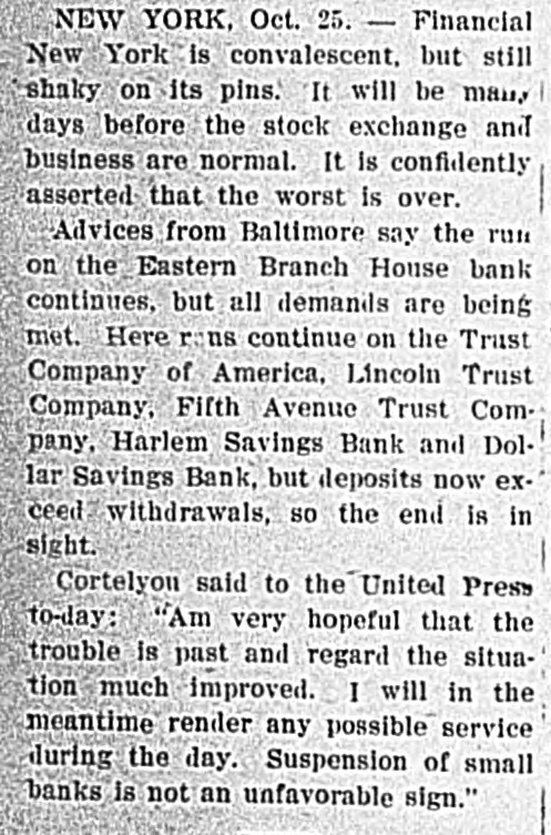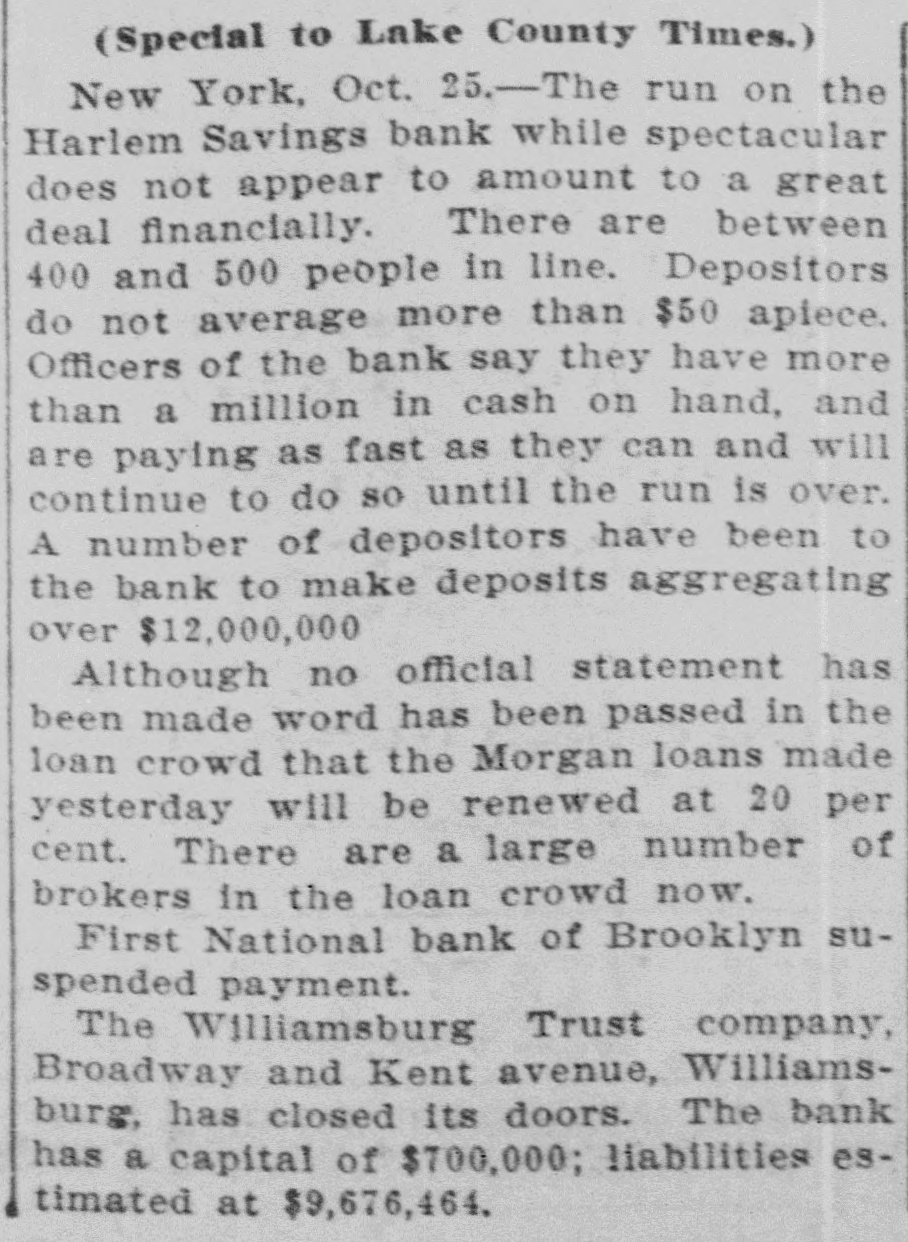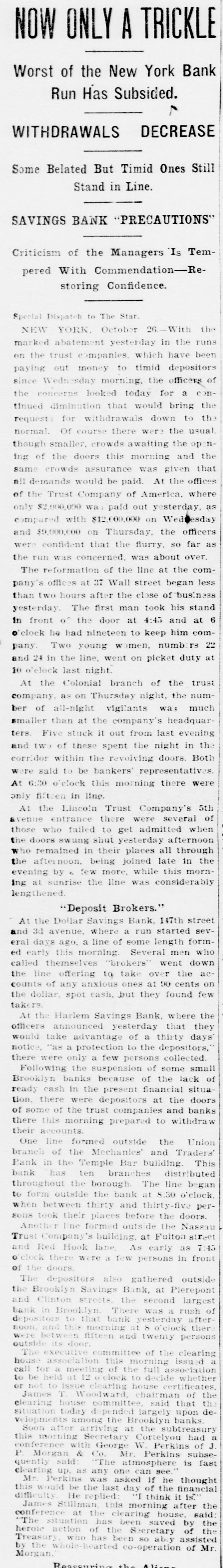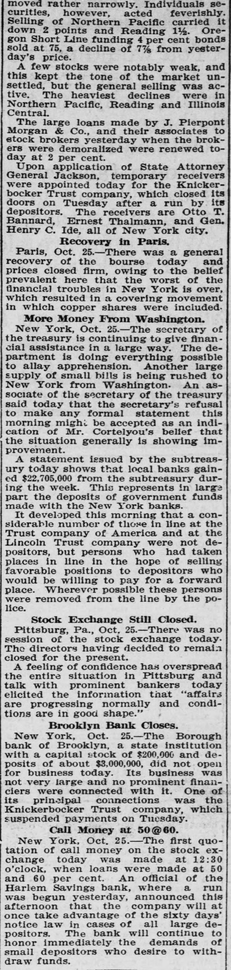 moved rather narrowly. Individuals securities, however, acted feverishly. Selling of Northern Pacific carried it down 2 points and Reading 11/2. Oregon Short Line funding per cent bonds sold at 75, a decline of 77 from yesterday's price. A few stocks were notably weak, and this kept the tone of the market unsettled, but the general selling was active. The heaviest declines were in Northern Pacific, Reading and Illinois Central. The large loans made by J. Pierpont Morgan & Co., and their associates to stock brokers yesterday when the brokers were demoralized were renewed today at 2 per cent. Upon application of State Attorney General Jackson, temporary receivers were appointed today for the Knickerbocker Trust company, which closed its doors on Tuesday after a run by its depositors. The receivers are Otto T. Bannard, Ernest Thalmann, and Gen. Henry C. Ide, all of New York city. Recovery in Paris. Paris, Oct. 25.-There was a general recovery of the bourse today and prices closed firm, owing to the belief prevalent here that the worst of the financial troubles in New York is over, which resulted in a covering movement in which copper shares were included. More Money From Washington. New York, Oct. 25.-The secretary of the treasury is continuing to give financial assistance in a large way. The department is doing everything possible to allay apprehension. Another large supply of small hills is being rushed to New York from Washington. An associate of the secretary of the treasury said today that the secretary's refusal to make any formal statement this morning might be accepted as an indication of Mr. Cortelyou's belief that the situation generally is showing improvement. A statement issued by the subtreasury today shows that local banks gained $22,705,000 from the subtreasury during the week. This represents in large part the deposits of government funds made with the New York banks. It developed this morning that a considerable number of those in line at the Trust company of America and at the Lincoln Trust company were not depositors, but persons who had taken places in line in the hope of selling favorable positions to depositors who would be willing to pay for a forward place. Wherever possible these persons were removed from the line by the police. Stock Exchange Still Closed. Pittsburg, Pa., Oct. 25.-There was no session of the stock exchange today. The directors having decided to remain closed for the present. A feeling of confidence has overspread the entire situation in Pittsburg and talk with prominent bankers today elicited the information that "affairs are progressing normally and conditions are in good shape." Brooklyn Bank Closes. New York, Oct. 25.-The Borough bank of Brooklyn, a state institution with a capital stock of $200,000 and deposits of about $3,000,000, did not open for business today. Its business was not very large and no prominent financiers were connected with it. One of its principal connections was the Knickerbocker Trust company, which suspended payments on Tuesday. Call Money at 50@60. New York, Oct. 25.-The first quotation of call money on the stock exchange today was made at 12:30 o'clock, when loans were made at 50 and 60 per cent. An official of the Harlem Savings bank, where a run was begun yesterday, announced this afternoon that the company will at once take advantage of the sixty days' notice law in cases of all large depositors. The bank will continue to honor immediately the demands of small depositors who desire to withdraw funds.