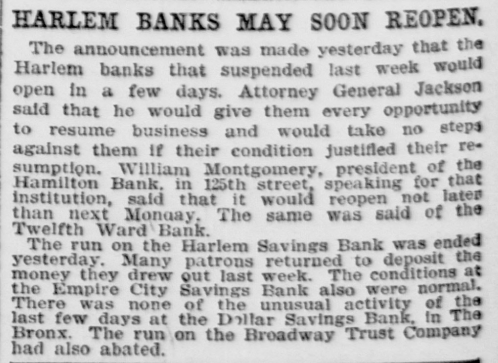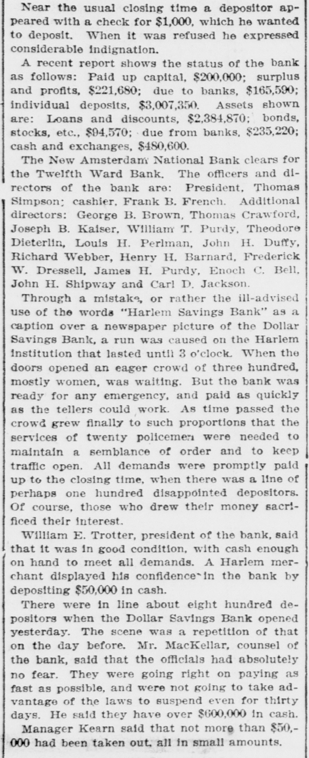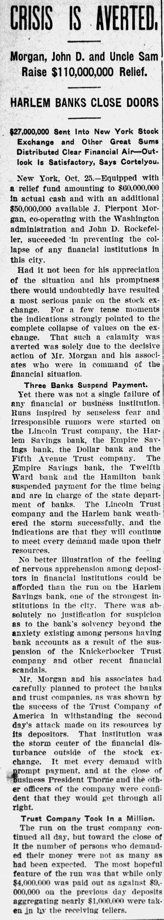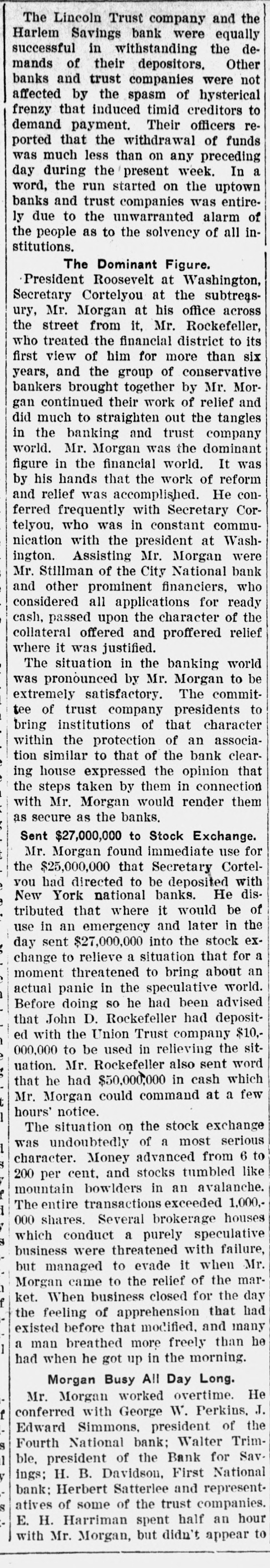 moved rather narrowly. Individuals securities, however, acted feverishly. Selling of Northern Pacific carried it down 2 points and Reading 11/2. Oregon Short Line funding per cent bonds sold at 75, a decline of 77 from yesterday's price. A few stocks were notably weak, and this kept the tone of the market unsettled, but the general selling was active. The heaviest declines were in Northern Pacific, Reading and Illinois Central. The large loans made by J. Pierpont Morgan & Co., and their associates to stock brokers yesterday when the brokers were demoralized were renewed today at 2 per cent. Upon application of State Attorney General Jackson, temporary receivers were appointed today for the Knickerbocker Trust company, which closed its doors on Tuesday after a run by its depositors. The receivers are Otto T. Bannard, Ernest Thalmann, and Gen. Henry C. Ide, all of New York city. Recovery in Paris. Paris, Oct. 25.-There was a general recovery of the bourse today and prices closed firm, owing to the belief prevalent here that the worst of the financial troubles in New York is over, which resulted in a covering movement in which copper shares were included. More Money From Washington. New York, Oct. 25.-The secretary of the treasury is continuing to give financial assistance in a large way. The department is doing everything possible to allay apprehension. Another large supply of small hills is being rushed to New York from Washington. An associate of the secretary of the treasury said today that the secretary's refusal to make any formal statement this morning might be accepted as an indication of Mr. Cortelyou's belief that the situation generally is showing improvement. A statement issued by the subtreasury today shows that local banks gained $22,705,000 from the subtreasury during the week. This represents in large part the deposits of government funds made with the New York banks. It developed this morning that a considerable number of those in line at the Trust company of America and at the Lincoln Trust company were not depositors, but persons who had taken places in line in the hope of selling favorable positions to depositors who would be willing to pay for a forward place. Wherever possible these persons were removed from the line by the police. Stock Exchange Still Closed. Pittsburg, Pa., Oct. 25.-There was no session of the stock exchange today. The directors having decided to remain closed for the present. A feeling of confidence has overspread the entire situation in Pittsburg and talk with prominent bankers today elicited the information that "affairs are progressing normally and conditions are in good shape." Brooklyn Bank Closes. New York, Oct. 25.-The Borough bank of Brooklyn, a state institution with a capital stock of $200,000 and deposits of about $3,000,000, did not open for business today. Its business was not very large and no prominent financiers were connected with it. One of its principal connections was the Knickerbocker Trust company, which suspended payments on Tuesday. Call Money at 50@60. New York, Oct. 25.-The first quotation of call money on the stock exchange today was made at 12:30 o'clock, when loans were made at 50 and 60 per cent. An official of the Harlem Savings bank, where a run was begun yesterday, announced this afternoon that the company will at once take advantage of the sixty days' notice law in cases of all large depositors. The bank will continue to honor immediately the demands of small depositors who desire to withdraw funds.