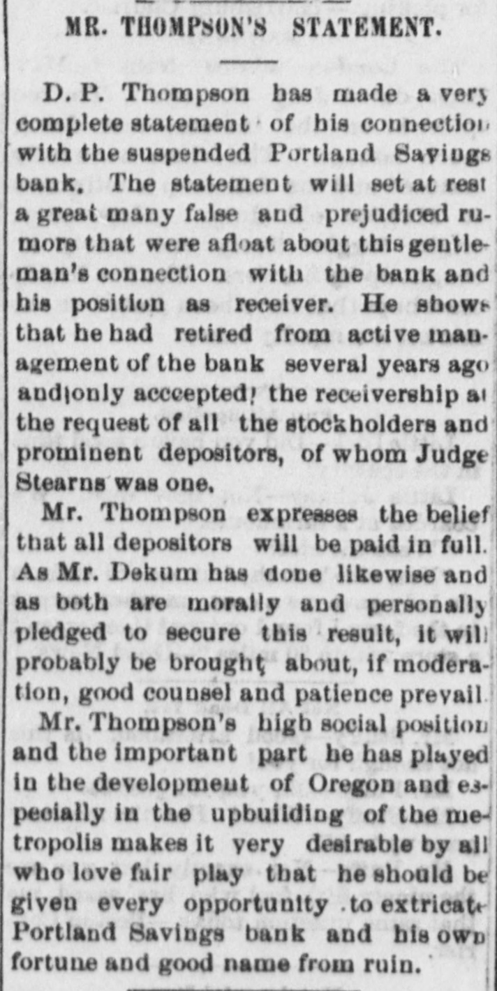 MR. THOMPSON'S STATEMENT. D.P. Thompson has made a very complete statement of his connection with the suspended Portland Savings bank, The statement will set at rest a great many false and prejudiced rumore that were afloat about this gentleman's connection with the bank and his position as receiver. He shows that he had retired from active management of the bank several years ago andjonly acceepted! the receivership at the request of all the stockholders and prominent depositors, of whom Judge Stearns was one, Mr. Thompson expresses the belief that all depositors will be paid in full. As Mr. Dekum has done likewise and as both are morally and personally pledged to secure this result, it will probably be brought about, if moderation, good counsel and patience prevail Mr. Thompson's high social position and the important part be has played in the development of Oregon and especially in the upbuilding of the metropolis makes it very desirable by all who love fair play that he should be given every opportunity to extricate Portland Savings bank and his OWD fortune and good name from ruin.
