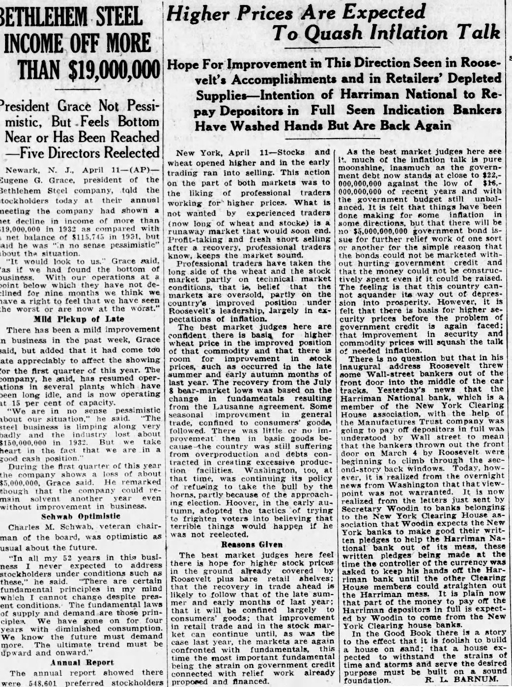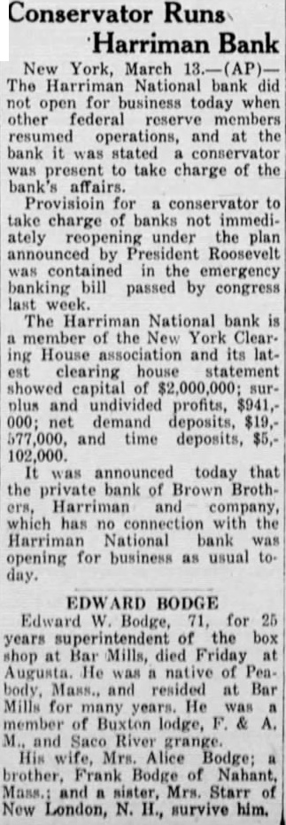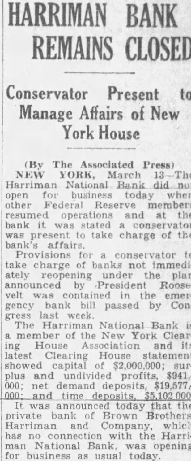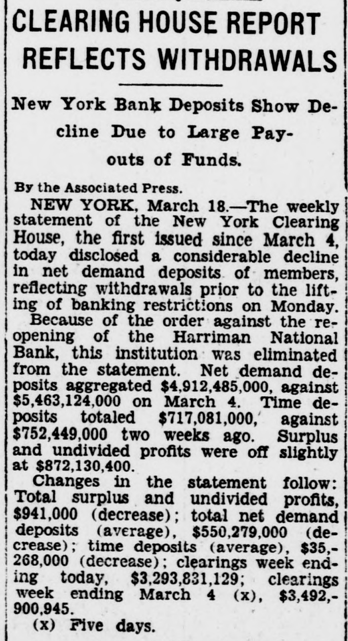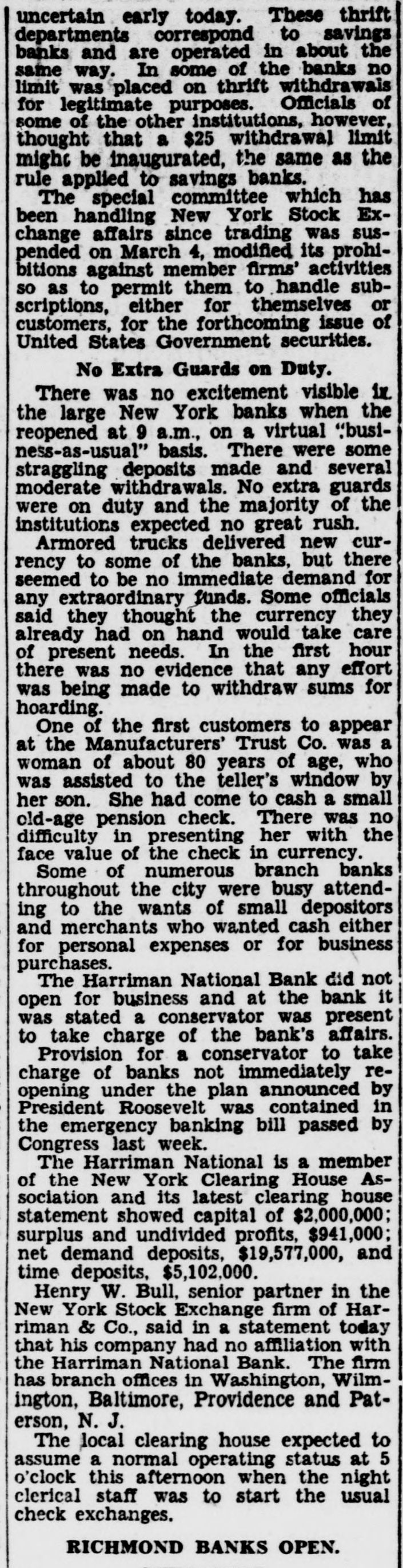 Unrest Normal Business Report52 Institutions in New York, Nation's ter Operation. IN 12 CITIES TODAY Others in 250 Cities With proved Clearing House ciations Will TuesReopen day. Roosevelt Calls for Courage and Confidence Financial System Be stored. New March ing the nation's financial capital resumed today when 52 of the local members of the federal system. quietly resumed bus!ness, together with state banks, private banks and metropolitan savings banks. The last named ordered state department of $25 weekly for depositor. The banks reported brisk busiin new deposits. Several banks found their receivtellers' windows ronized. Uptown institution were busy taking cash accumulated checks for assistance sent the main Withdrawsaid to be small foreign exchange dealings, under official limitations, found dollar strong in terms of pound European gold bankers said. degree confidence abroad to this bring gold the York federal reserve bank. Indications this afternoon Saturday's receipts would The Harriman National bank, federal reserve did not open for business and the bank stated present to take charge of the bank's affairs. of trading the New York stock exchange various markets held pending complete banking elsewhere system outlined President Roosevelt. trucks delivered new currency to some of the banks, but there seemed be immediate demand any extraordinary funds. Some officials said they thought the currency they already had hand would take care present needs. In the first hour there was no evidence that any fort was being made withdraw sums for hoarding. of the first customers to the Manufacturers Trust company, woman about who assisted teller's window her She cash pension check value the check in Some of banks throughout city were busy attending the wants small positors and who wanted cash either personal expenses business purchases. activThe said been about for Monday morning. The National bank the New York Clearing House association and its latest clearing house statement showed capital $2,000,000: surplus and net mand deposits. and time deposits, In 346 institutions in the 12 federal cities carried norbusiness during the first day the President's 3-day reopening Foreign markets resumed trading the dollar. The tone firm. New York stock pected to resume trading the within In addition to the institutions federal cities. banks Iowa open under the regulations of the of Boston banks outside the city proper also gold prohibited and hoarders had four days which return their metal to the federal reserve. Plenty of Currency March normal of money exchange order for America today the of President that have provided machinery restore our financial up to you to support and make told the nation. banks will take care of all Plenty currency based on was the tions permitted resume today the 12 federal banks he assured. "Confidence and courage the essentials success our President people must have faith: you must stampeded rumors Let us unite in banishing your problem no than mine. Together So under license of the banks the located the federal reserve nancial reservoirs had permission tinued the gold supply took all possible prevent by Explains