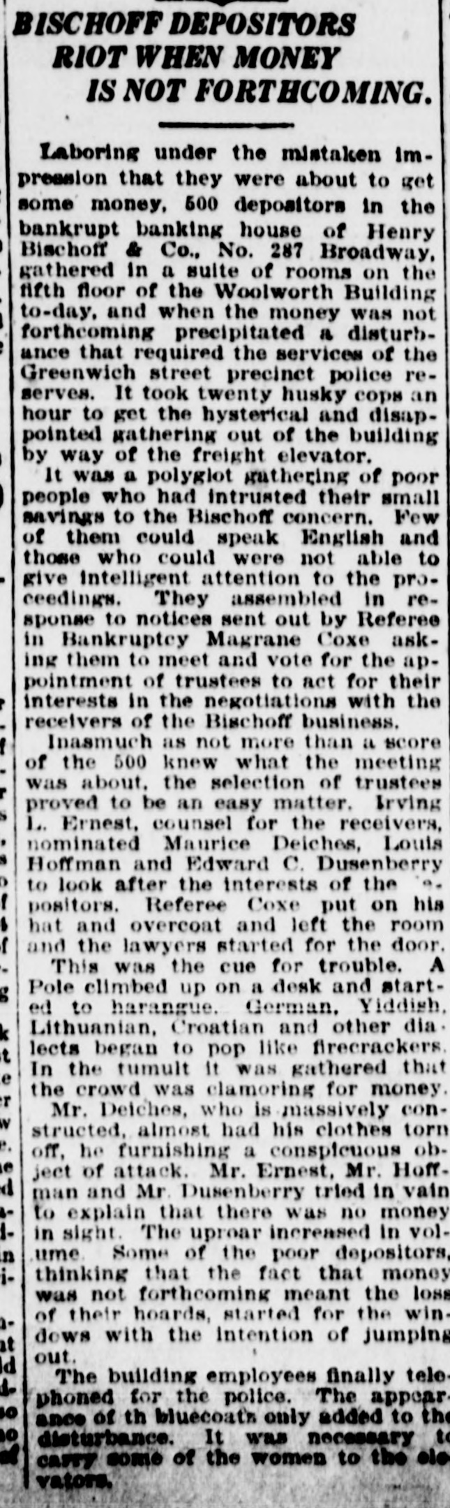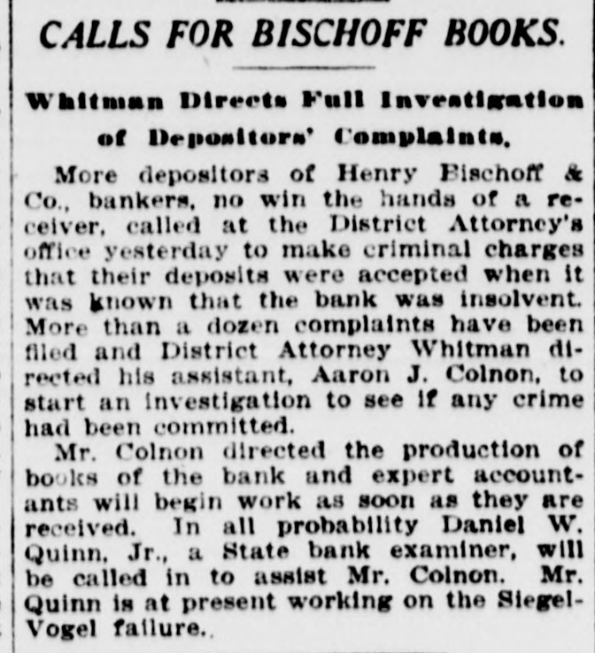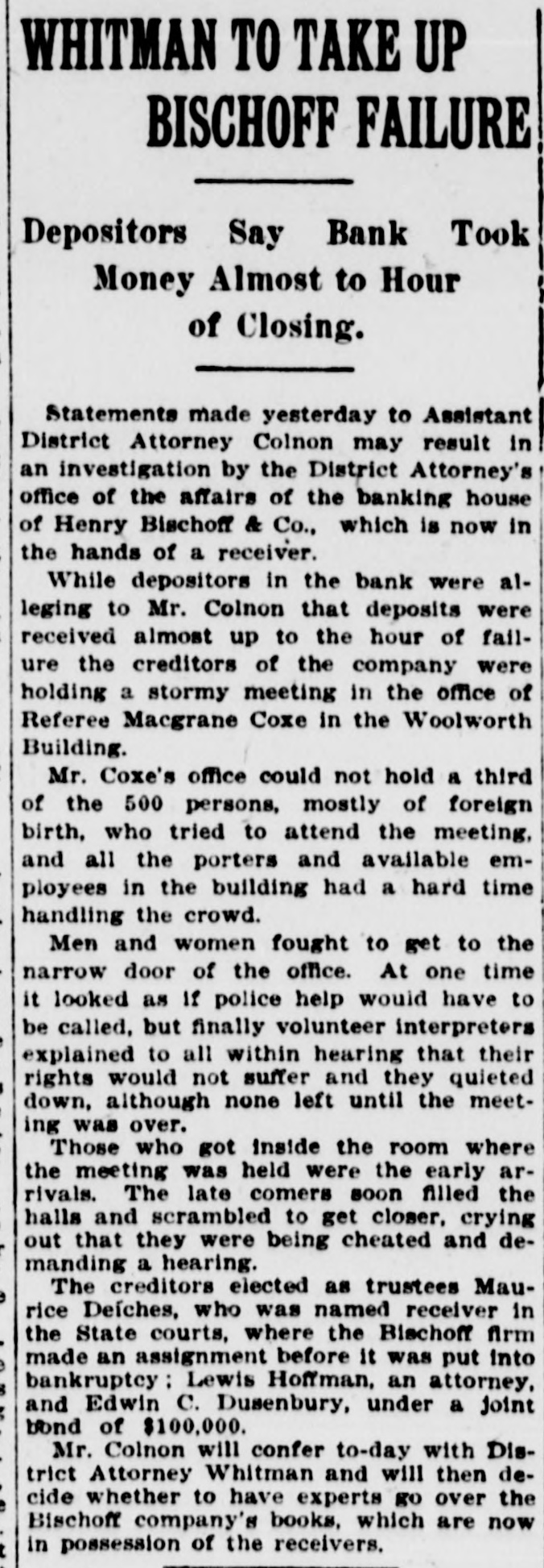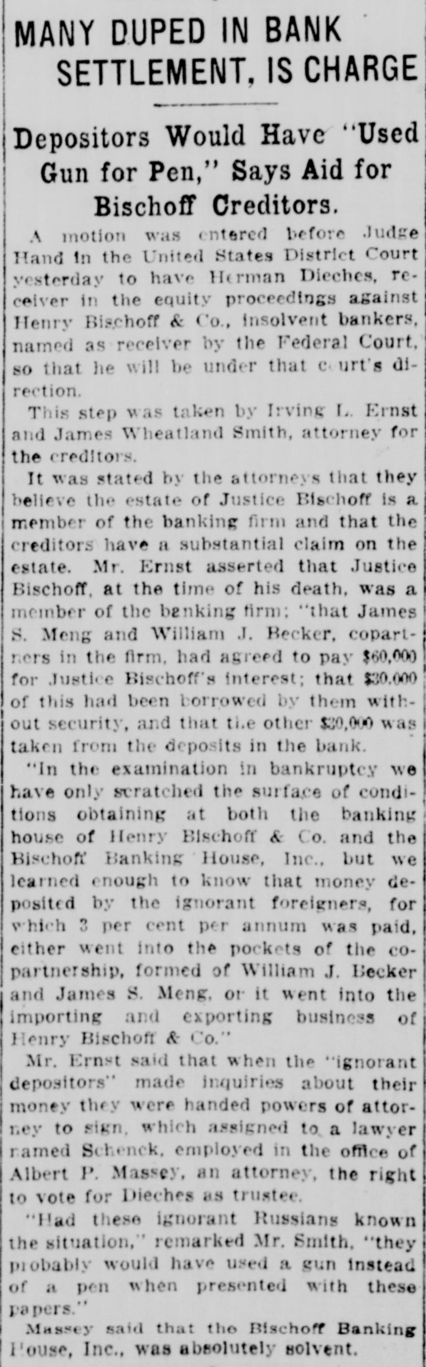 TRICKERY CHARGED IN BISCHOFF FAILURE Creditors' Lawyer Alleges Fraud in Receivership Proceedings. CALLS JUDGE PARTNER Claims. He Says. Will Be Made Against Estate of Dead Jurist. Irving L. Ernst. one of the attorneys for the creditors of Henry Bischoff & Co. and the Bischoff Banking House, Inc., told Judge Hand in the United States District Court yesterday that he was convinced his clients had a substantial claim against the estate of the late Supreme Court Justice Henry Bischoff and that they would attempt to levy the estate in order to satisfy their claims. Justice Bischoff fell down an elevator shaft last March and was killed instantly. It was supposed at the time that he had disposed of his interest in the Bischoff banking enterprise. AccordIng to Mr. Ernst the depositors had every reason to believe that the Justice was a member of the partnership up to the time of his death. Mr. Ernst told the court that the Bischoff bank never invested a. dollar of the money deposited with it in any good securities. All the money, he said, went Into the "pockets" of the importing and exporting business of Henry Bischoff & Co. Lawyer Accuses Becker. After Maurice Deiches was appointed geceiver in the State Supreme Court, WillSam J. Becker, one of the Bischoff partnera, drew his entire account of $400 from the National Park Bank, according to Mr. Ernst. Becker, he said, also oolSected rents from his property on Ninetysixth street, which he failed to turn over to the "receiver, although he afterwards turned over the property itself. Mr. Ernst accused Albert P. Massey, attorney for the Bischoff bank and also for Deiches. of arranging the suit brought by Carl Wittman, which resulted in the appointment of Deiches as receiver. Wittman was an employee of Henry Bischoff & Co. He sued for $500. According to Mr. Ernst, Wittman had no treat claim against the concern. Massey, Mr. Ernst said, told him that the suit was brought after a conference between the partners of the banking house and Wittman. Mr. Ernst asked that Deiches be made receiver in the bankruptcy proceedings. no that he would be liable to the Federal courts as well as to the State courts. Judge Hand denied this request. but orHered that all the books of the Bischoft enterprises be opened for inspection. He added that he didn't think that a receiver could, with propriety, issue powers of attorney calling for his appointment as trustee in bankruptcy. Able to Pay All, Says Massey, Albert P. Massey told Judge Hand that Henry Bischoff & Co. had cash assets amounting to $100,000 in excess of their debts. Becker, he said, had turned over $158,000 of his stock in the Bischoff Banking House. Inc. Deiches, he said, had asked Becker for his other assets. including the rents on the Ninety-sixth street property. "But," concluded Massey, "Becker is a hardheaded Dutchman." Attorney James Wheatland Smith, also representing the creditors, said that he had been quoted to the effect that the whole affair was a. rotten inside job. He said that he had looked the word "job" up in the dictionary and found that it meant an undertaking ostensibly for the public good. but in reality for one's own good. That characterized the proceedings against the Bischoff enterprises in the State courts, he said. Neither the public nor the depositors knew the truth about the business of Henry Bischoff & Co., he said.