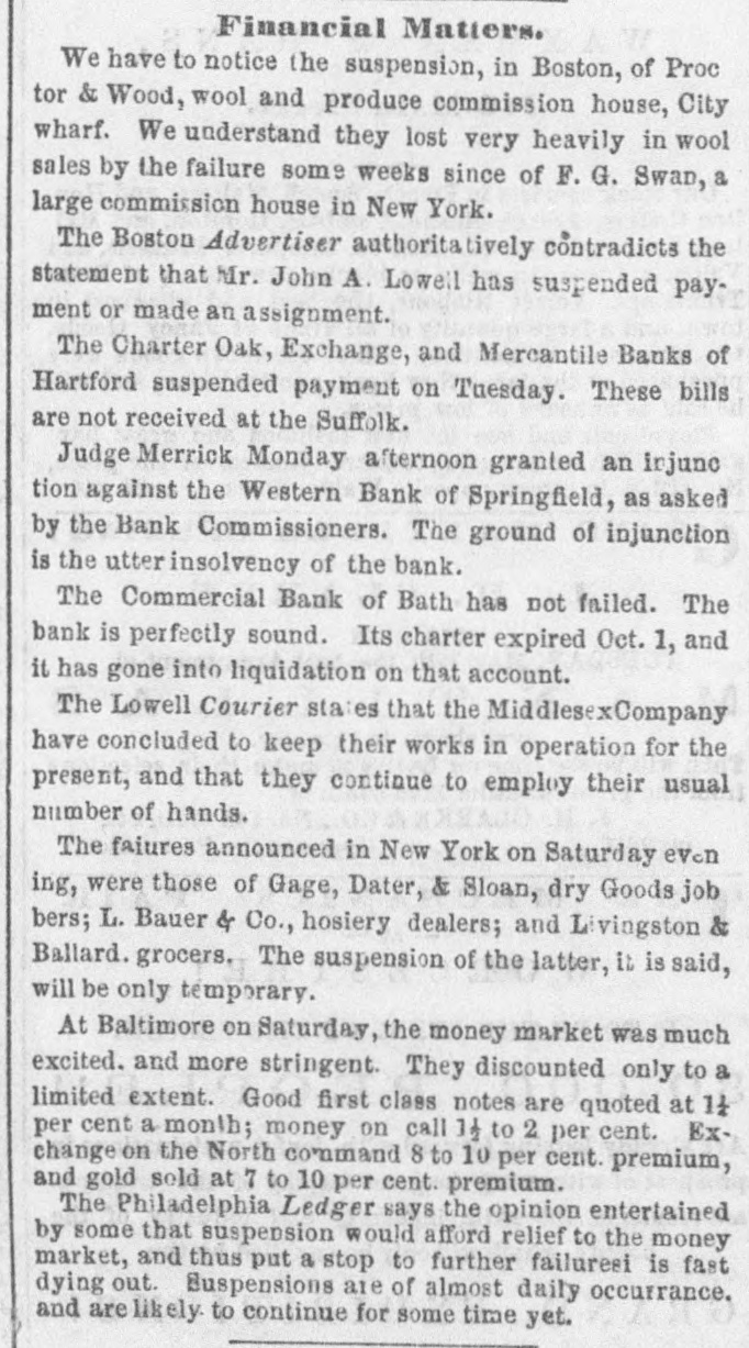Financial Matters. We have to notice the suspension, in Boston, of Proc tor & Wood, wool and produce commission house, City wharf. We understand they lost very heavily in wool sales by the failure some weeks since of F. G. Swan, a large commission house in New York. The Boston Advertiser authoritatively contradicts the statement that Mr. John A. Lowell has suspended payment or made an assignment. The Charter Oak, Exchange, and Mercantile Banks of Hartford suspended payment on Tuesday. These bills are not received at the Suffolk. Judge Merrick Monday afternoon granted an injune tion against the Western Bank of Springfield, as asked by the Bank Commissioners. The ground of injunction is the utter insolvency of the bank. The Commercial Bank of Bath has not failed. The bank is perfectly sound. Its charter expired Oct. 1, and it has gone into liquidation on that account. The Lowell Courier states that the MiddlesexCompany have concluded to keep their works in operation for the present, and that they continue to employ their usual number of hands. The faiures announced in New York on Saturday even ing, were those of Gage, Dater, & Sloan, dry Goods job bers; L. Bauer & Co., hosiery dealers; and Livingston & Ballard. grocers. The suspension of the latter, it is said, will be only temporary. At Baltimore on Saturday, the money market was much excited. and more stringent. They discounted only to a limited extent. Good first class notes are quoted at 11 per cent a month; money on call 11 to 2 per cent. Exchange on the North command 8 to 10 per cent. premium, and gold sold at 7 to 10 per cent. premium. The Philadelphia Ledger says the opinion entertained by some that suspension would afford relief to the money market, and thus put a stop to further failuresi is fast dying out. Suspensions are of almost daily occurrance. and arelikely. to continue for some time yet.
