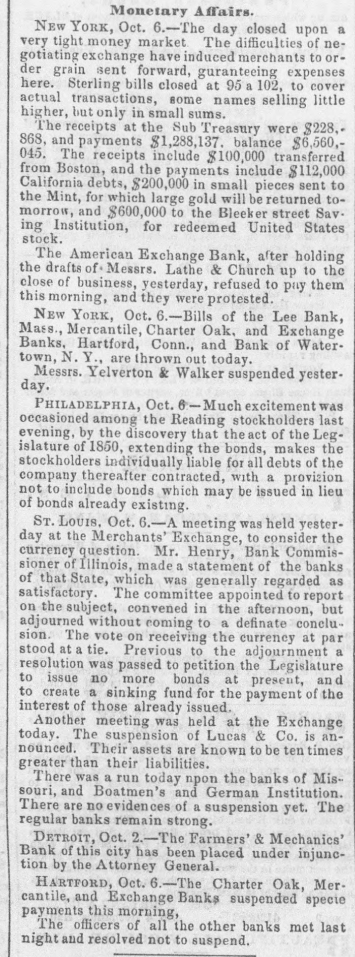 Monetary Affairs. NEW YORK, Oct. 6.-The day closed upon a very tight money market The difficulties of negotiating exchange have induced merchants to order grain sent forward, guranteeing expenses here. Sterling bills closed at 95 a 102, to cover actual transactions, some names selling little higher, but only in small sums. The receipts at the Sub Treasury were $228,868, and payments $1,288,137. balance $6,560,045. The receipts include $100,000 transferred from Boston, and the payments include $112,000 California debts, $200,000 in small pieces sent to the Mint, for which large gold will be returned tomorrow, and $600,000 to the Bleeker street Sav. ing Institution, for redeemed United States stock. The American Exchange Bank, after holding the drafts of Messrs. Lathe & Church up to the close of business, yesterday, refused to pay them this morning, and they were protested. NEW York, Oct. 6.-Bills of the Lee Bank, Mass., Mercantile, Charter Oak, and Exchange Banks, Hartford, Conn., and Bank of Watertown, N. Y., are thrown out today. Messrs. Yelverton & Walker suspended yesterday. PHILADELPHIA, Oct. 6- Much excitement was occasioned among the Reading stockholders last evening, by the discovery that the act of the Legislature of 1850, extending the bonds, makes the stockholders individually liable for all debts of the company thereafter contracted, with a provizion not to include bonds which may be issued in lieu of bonds already existing. ST. LOUIS, Oct. 6.-A meeting was held yesterday at the Merchants' Exchange, to consider the currency question. Mr. Henry, Bank Commissioner of Illinois, made a statement of the banks of that State, which was generally regarded as satisfactory. The committee appointed to report on the subject, convened in the afternoon, but adjourned without coming to a definate conclusion. The vote on receiving the currency at par stood at a tie. Previous to the adjournment a resolution was passed to petition the Legislature to issue no more bonds at present, and to create a sinking fund for the payment of the interest of those already issued. Another meeting was held at the Exchange today. The suspension of Lucas & Co. is announced. Their assets are known to be ten times greater than their liabilities. There was a run today npon the banks of Missouri, and Boatmen's and German Institution. There are no evidences of a suspension yet. The regular banks remain strong. DETROIT, Oct. 2.-The Farmers' & Mechanics' Bank of this city has been placed under injunction by the Attorney General. HARTFORD, Oct. 6.-The Charter Oak, Mercantile, and Exchange Banks suspended specie payments this morning, The officers of all the other banks met last night and resolved not to suspend.