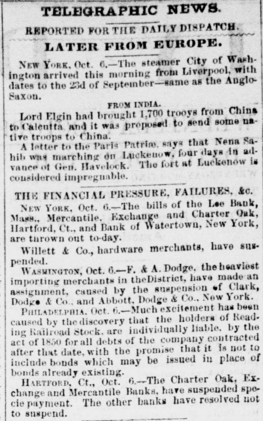 TELEGRAPHIC NEWS. REPORTED FOR THE DAILY DISPATCH. LATER FROM EUROPE. NEW YORK, Oct. 6,-The steamer City of Washington arrived this morning from Liverpool, with dates to the 23d of September-same as the AngloSaxon. FROM INDIA. Lord Elgin had brought 1,700 trooys from China to Calcutta and it was proposed to send some native troops to China. A letter to the Paris Patrim. says that Nena Sahib was marching on Luckenow, four days in advance of Gen. Havelock. The fort at Luckenow is considered impregnable. THE FINANCIAL PRESSURE, FAILURES, &c. NEW YORK, Oct. 6-The bills of the Lee Bank, Mass., Mercantile, Exchange and Charter Oak, Hartford, Ct., and Bank of Watertown, New York, are thrown out to-day. Willett & Co., hardware merchants, have suspended. WASMINGTON, Oct. 6.-F. & A. Dodge, the heaviest importing merchants in theDistrict, have made an assignment, caused by the suspension of Clark, Dodge & Co., and Abbott. Dodge & Co., New York. PHILADELPHIA. Oct. 6.-Much excitement has been caused by the discovery that the holders of Reading Railroad Stock. are individually liable. by the act of 1850 for all debts of the company contracted after that date, with the promise that it is not to include bonds which may be issued in place of bonds already existing. HARTFORD, Ct., Oct. 6.-The Charter Oak, Exchange and Mercantile Banks, have suspended specie payment. The other banks have resolved not to suspend.