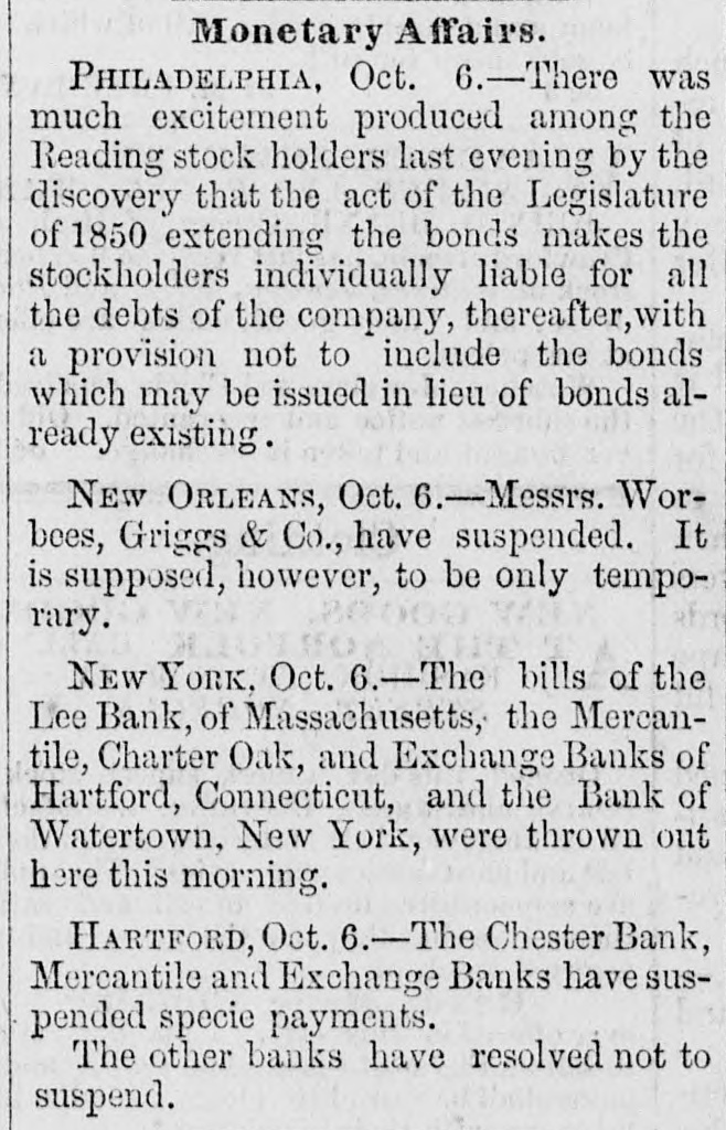 Monetary Affairs. PHILADELPHIA, Oct. 6.-There was much excitement produced among the Reading stock holders last evening by the discovery that the act of the Legislature of 1850 extending the bonds makes the stockholders individually liable for all the debts of the company, thereafter, with a provision not to include the bonds which may be issued in lieu of bonds already existing. NEW ORLEANS, Oct. 6.-Messrs. Worbees, Griggs & Co., have suspended. It is supposed, however, to be only temporary. NEW YORK, Oct. 6.-The bills of the Lee Bank, of Massachusetts, the Mercantile, Charter Oak, and Exchange Banks of Hartford, Connecticut, and the Bank of Watertown, New York, were thrown out here this morning. HARTFORD, Oct. 6.-The Chester Bank, Mercantile and Exchange Banks have suspended specie payments. The other banks have resolved not to suspend.