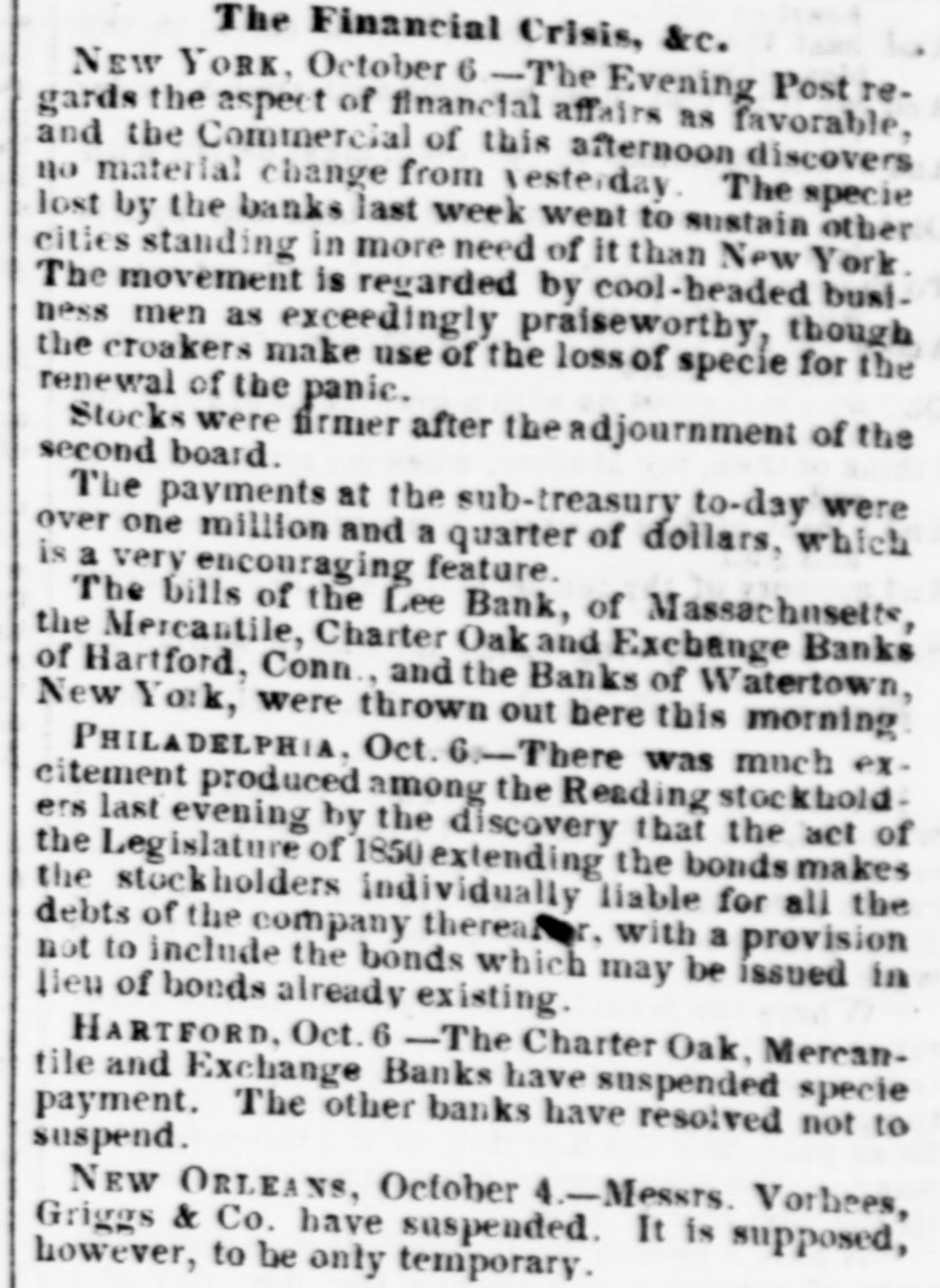 The Financial Crisis, &c. NEW YORK, October 6 -The Evening Post regards the aspect of financial affairs as favorable, and the Commercial of this afternoon discovers no material change from resterday. The specie lost by the banks last week went to sustain other cities standing in more need of it than New York. The movement is regarded by cool-headed business men as exceedingly praiseworthy, though the croakers make use of the loss of specie for the renewal of the panic. Stocks were firmer after the adjournment of the second board. The payments at the sub-treasury to-day were over one million and a quarter of dollars, which is a very encouraging feature. The bills of the Lee Bank, of Massachusetts, the Mercantile, Charter Oak and Exchange Banks of Hartford, Conn., and the Banks of Watertown, New York, were thrown out here this morning PHILADELPHIA, Oct. 6.-There was much excitement produced among the Reading stockholders last evening by the discovery that the act of the Legislature of 1850 extending the bonds makes the stockholders individually liable for all the debts of the company thereafor, with a provision not to include the bonds which may be issued in lieu of bonds already existing. HARTFORD, Oct. 6 -The Charter Oak, Mercantile and Exchange Banks have suspended specie payment. The other banks have resolved not to suspend. NEW ORLEANS, October 4.-Messrs. Vorhees, Griggs & Co. have suspended. It is supposed, however, to be only temporary.
