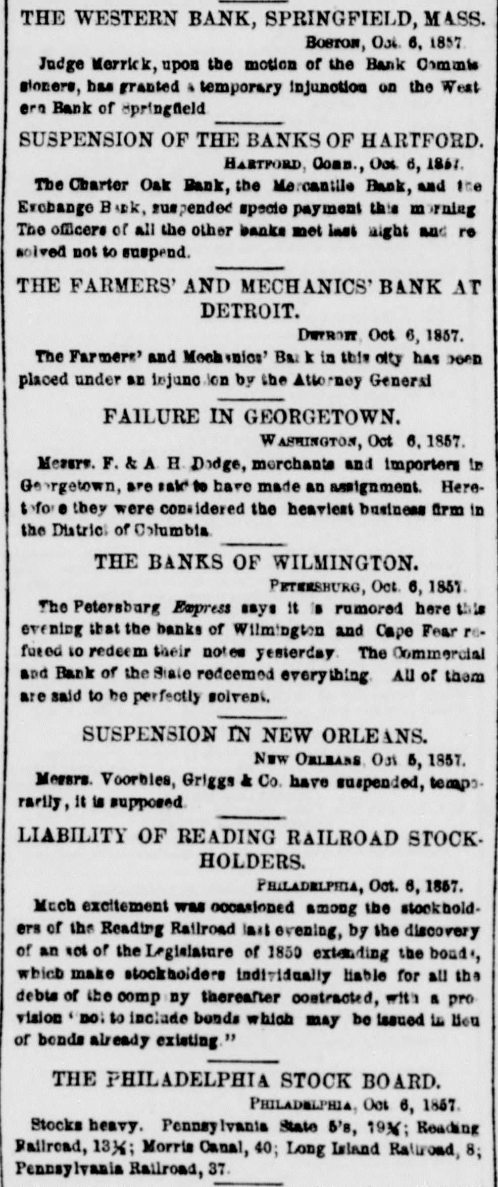 THE WESTERN BANK, SPRINGFIELD, MASS. BOSTON, Ost. 6, 1857 Judge Merrick, upon the motion of the Bank Commis sioners, has granted A temporary injunction on the West ern Bank of Springfield SUSPENSION OF THE BANKS OF HARTFORD. HARTFORD, Comn., Oct. 6, 1867. The Charter Oak Bank, the Mercantile Bank, and the Exchange Bank, suspended specie payment this morning The officers of all the other banks met last night and re solved not to suspend. THE FARMERS' AND MECHANICS' BANK AT DETROIT. DEPROIT, Oct 6, 1857. The Farmers' and Mechanion' Ba: k in this city has been placed under an injune lon by the Attorney General FAILURE IN GEORGETOWN. WASHINGTON, Oct 6, 1857. Messrs. F. & A H. Dodge, merchants and importers in Georgetown, are said to have made an assignment. Heretofore they were considered the heaviest business firm in the District of Columbia THE BANKS OF WILMINGTON. PETERSBURG, Oct. 6, 1857. The Petersburg Express says it is rumored here this evening that the banks of Wilmington and Cape Fear refueed to redeem their notes yesterday. The Commercial and Bank of the State redeemed everything All of them are said to be perfectly solvent. SUSPENSION IN NEW ORLEANS. New ORLEANS Ost 5, 1857. Messrs. Voorbies, Griggs & Co. have suspended, tempo. racily, it is supposed. LIABILITY OF READING RAILROAD STOCKHOLDERS. Philadelphia, Oct. 6, 1857. Much excitement was occasioned among the stockholders of the Reading Railroad last evening, by the discovery of an not of the Legislature of 1850 extending the bonds, which make stockholders individually liable for all the debts of the comp ny thereafter contracted, with a pro vision ' no: to include bonds which may be issued in Hou of bonds already existing." THE PHILADELPHIA STOCK BOARD. PHILADELPHIA, Oct 6, 1857. Stocks heavy. Pennsylvania State 5's, 19%; Reading Railroad, 13½; Morris Canal, 40; Long Island Railroad, 8; Pennsylvania Railroad, 37.