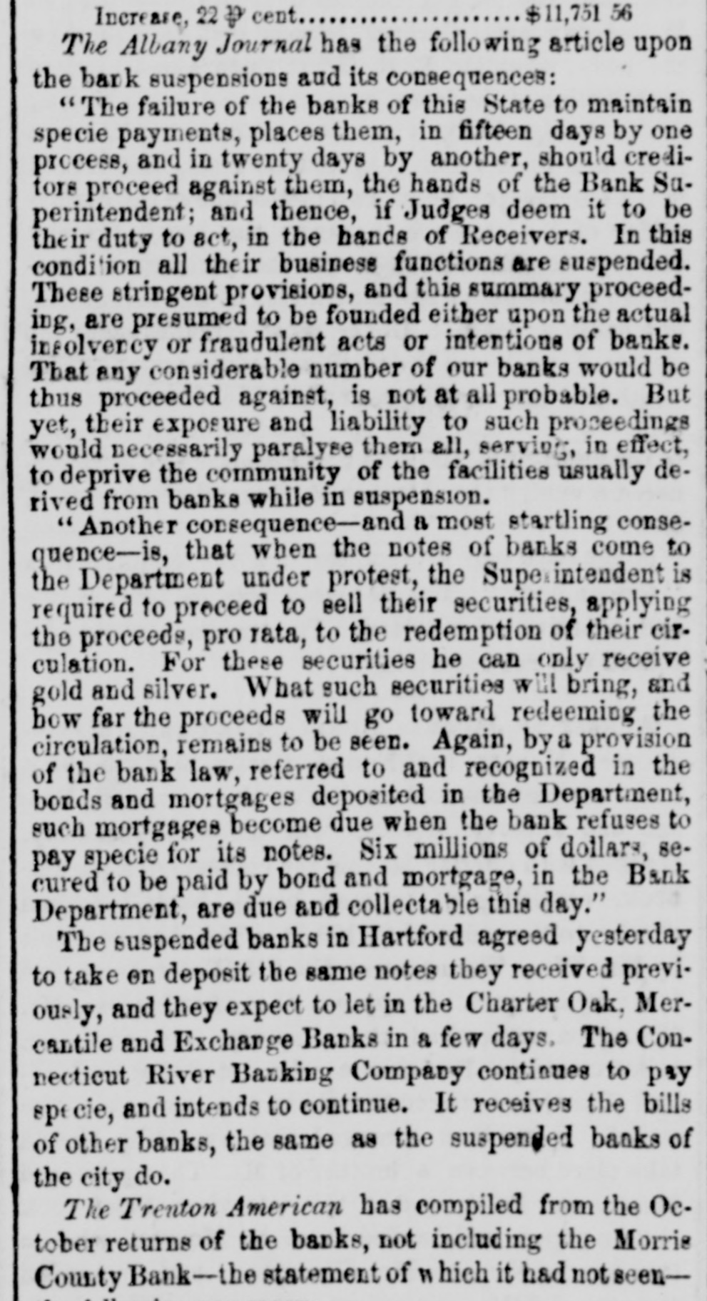 $11,751 Increase, 22 ₽ cent The Albany Journal has the following article upon the bank suspensions aud its consequences: "The failure of the banks of this State to maintain specie payments, places them, in fifteen days by one process, and in twenty days by another, should creditors proceed against them, the hands of the Bank Saperintendent; and thence, if Judges deem it to be their duty to act, in the hands of Receivers. In this condition all their business functions are suspended. These stringent provisions, and this summary proceeding, are presumed to be founded either upon the actual infolvercy or fraudulent acts or intentions of banks. That any considerable number of our banks would be thus proceeded against, is not at all probable. But yet, their exposure and liability to such proceedings would necessarily paralyse them all, serving, in effect, to deprive the community of the facilities usually derived from banks while in suspension. "Another consequence-and a most startling consequence-is, that when the notes of banks come to the Department under protest, the Supe.intendent is required to preceed to sell their securities, applying the proceeds, pro rata, to the redemption of their circulation. For these securities he can only receive gold and silver. What such securities will bring, and how far the proceeds will go toward redeeming the circulation, remains to be seen. Again, by a provision of the bank law, referred to and recognized in the bonds and mortgages deposited in the Department, such mortgages become due when the bank refuses to pay specie for its notes. Six millions of dollars, secured to be paid by bond and mortgage, in the Bank Department, are due and collectable this day." The suspended banks in Hartford agreed yesterday to take on deposit the same notes they received previously, and they expect to let in the Charter Oak, Mercantile and Exchange Banks in & few days, The Connecticut River Banking Company continues to pay specie, and intends to continue. It receives the bills of other banks, the same as the suspended banks of the city do. The Trenton American has compiled from the October returns of the banks, not including the Morris County Bank-- statement of " hich it had notseen-