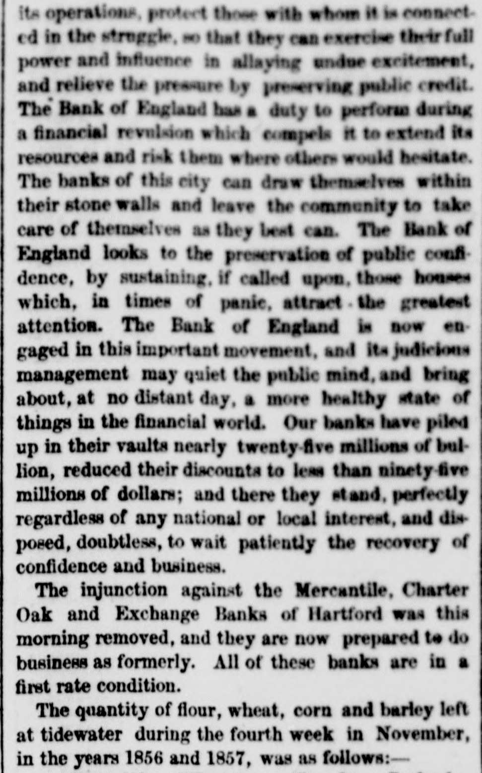 its operations, protect those with whom it in connected in the struggle, BO that they can exercise their full power and influence in allaying undue excitement, and relieve the pressure by preserving public credit. The Bank of England has a duty to perform during a financial revulsion which compels it to extend its resources and risk them where others would hesitate. The banks of this city can draw themselves within their stone walls and leave the community to take care of themselves as they best can. The Bank of England looks to the preservation of public confidence, by sustaining, if called upon, those houses which, in times of panie, attract the greatest attention. The Bank of England is now engaged in this important movement, and its judicious management may quiet the public mind, and bring about, at no distant day, a more healthy state of things in the financial world. Our banks have piled up in their vaults nearly twenty-five millions of bullion, reduced their discounts to less than ninety-five millions of dollars; and there they stand, perfectly regardless of any national or local interest, and disposed, doubtless, to wait patiently the recovery of confidence and business. The injunction against the Mercantile, Charter Oak and Exchange Banks of Hartford was this morning removed, and they are now prepared to do business as formerly. All of these banks are in a first rate condition. The quantity of flour, wheat, corn and barley left at tidewater during the fourth week in November, in the years 1856 and 1857, was as follows:-