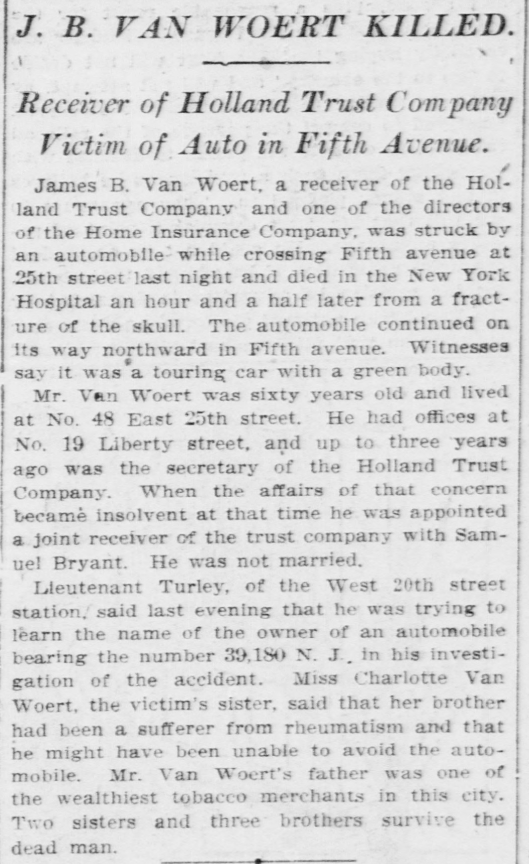 J. B. VAN WOERT KILLED. Receiver of Holland Trust Company Victim of Auto in Fifth Avenue. James B. Van Woert, a receiver of the Holland Trust Company and one of the directors of the Home Insurance Company, was struck by an automobile while crossing Fifth avenue at 25th street last night and died in the New York Hospital an hour and a half later from a fracture of the skull. The automobile continued on its way northward in Fifth avenue. Witnesses say it was a touring car with a green body. Mr. Van Woert was sixty years old and lived at No. 48 East 25th street. He had offices at No. 19 Liberty street, and up to three years ago was the secretary of the Holland Trust Company. When the affairs of that concern became insolvent at that time he was appointed a joint receiver of the trust company with Samuel Bryant. He was not married. Lleutenant Turley, of the West 20th street station, said last evening that he was trying to learn the name of the owner of an automobile bearing the number 39,180 N. J. in his investigation of the accident. Miss Charlotte Van Woert, the victim's sister, said that her brother had been a sufferer from rheumatism and that he might have been unable to avoid the automobile. Mr. Van Woert's father was one of the wealthiest tobacco merchants in this city. Two sisters and three brothers survive the dead man.