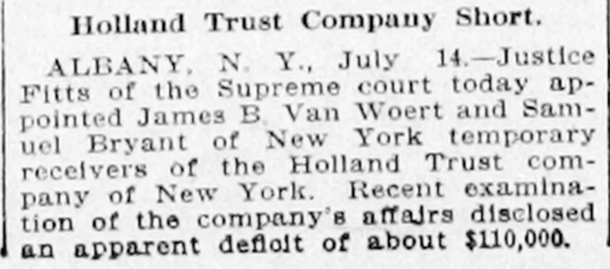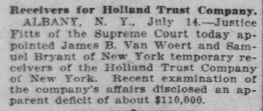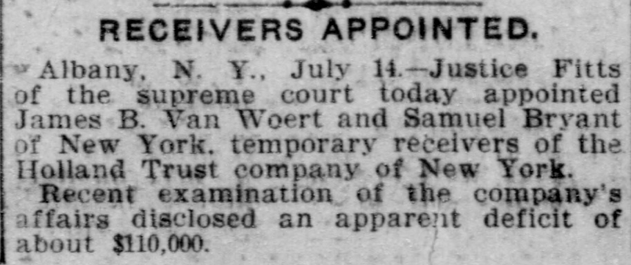 Receivers for Holland Trust Company. ALBANY, N. Y., July 14.-Justice Fitts of the Supreme Court today appointed James B. Van Woert and Samuel Bryant of New York temporary receivers of the Holland Trust Company of New York. Recent examination of the company's affairs disclosed an apparent deficit of about $110,000.