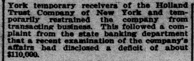 York temporary receivers of the Holland Trust Company of New York and temporarily restrained the company from transacting business. This followed a complaint from the state banking department that a recent examination of the company's affairs had disclosed a deficit of about $110,000.