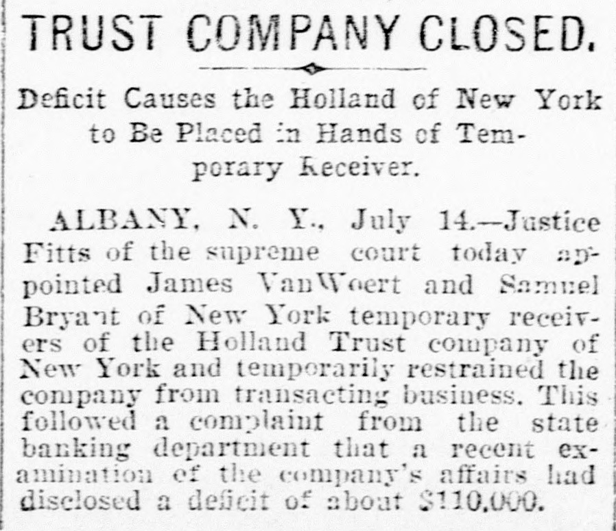 TRUST COMPANY CLOSED. Deficit Causes the Holland of New York to Be Placed in Hands of Temporary Receiver. ALBANY, N. Y., July 14.-Justice Fitts of the supreme court today anpointed James VanWoert and Samuel Bryant of New York temporary receivers of the Holland Trust company of New York and temporarily restrained the company from transacting business. This followed a complaint from the state banking department that a recent examination of the company's affairs had disclosed a deficit of about $110,000.