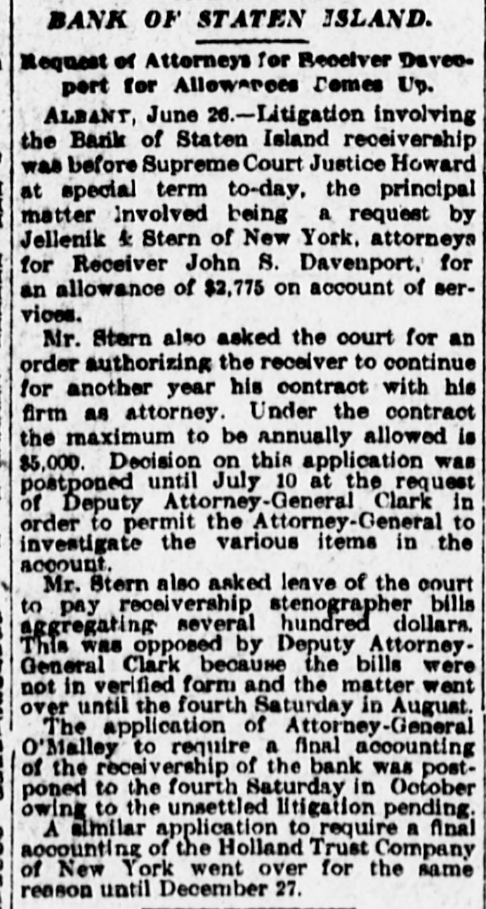 BANK OF STATEN ISLAND. Request of Attorneys for Receiver Davenpert for Allowerees Comes Up. ALBANT, June 26.-Litigation involving the Bank of Staten Island receivership was before Supreme Court Justice Howard at special term to-day, the principal matter Involved being a request by Jellenik & Stern of New York, attorneys for Receiver John S. Davenport, for an allowance of $2,775 on account of services. Mr. Stern also asked the court for an order authorizing the receiver to continue for another year his contract with his firm as attorney. Under the contract the maximum to be annually allowed is $5,000. Decision on this application was postponed until July 10 at the request of Deputy Attorney-General Clark in order to permit the Attorney-General to investigate the various items in the account. Mr. Stern also asked leave of the court to pay receivership stenographer bills aggregating several hundred dollars. This was opposed by Deputy AttorneyGeneral Clark because the bills were not in verified form and the matter went over until the fourth Saturday in August. The application of Attorney-General O'Malley to require a final accounting of the receivership of the bank was postponed to the fourth Saturday in October owing to the unsettled litigation pending. A similar application to require a final accounting of the Holland Trust Company of New York went over for the same reason until December 27.