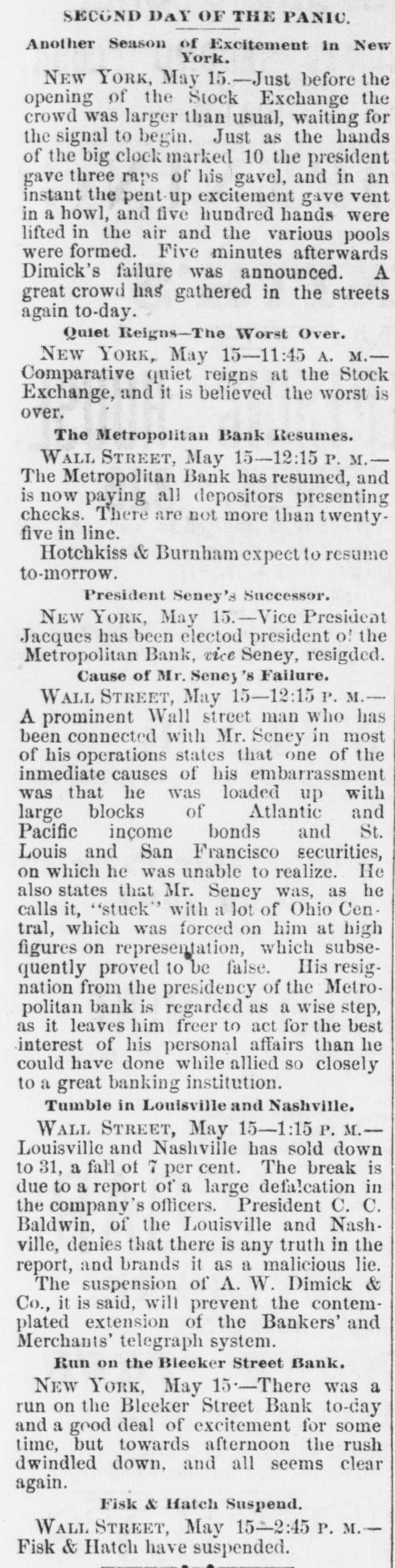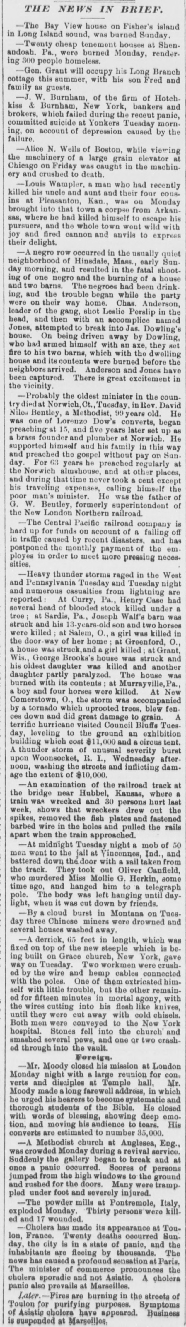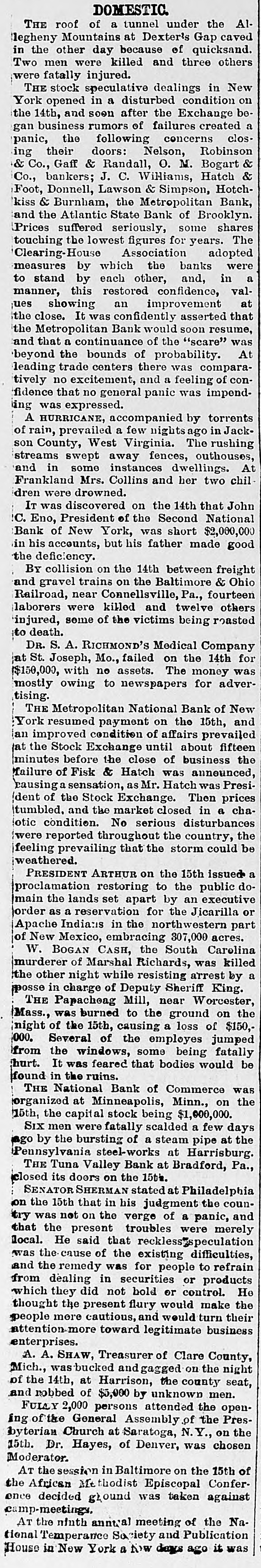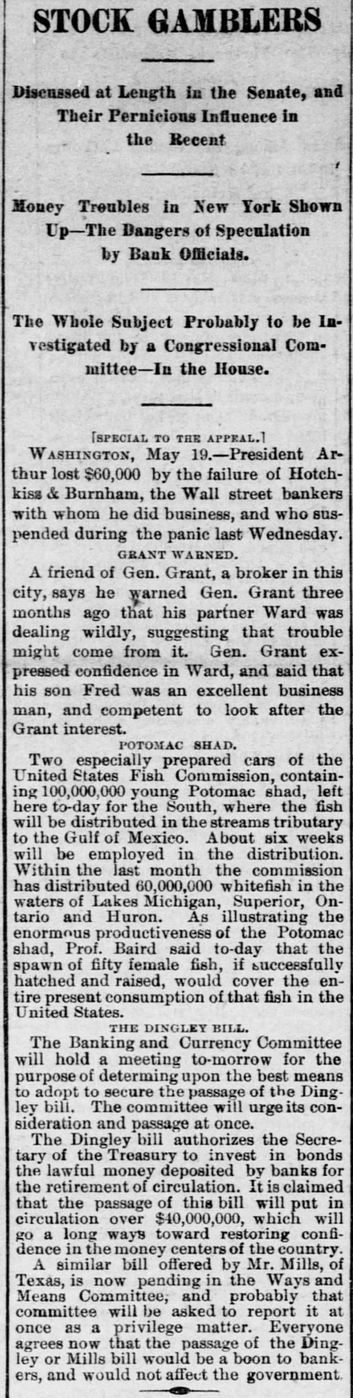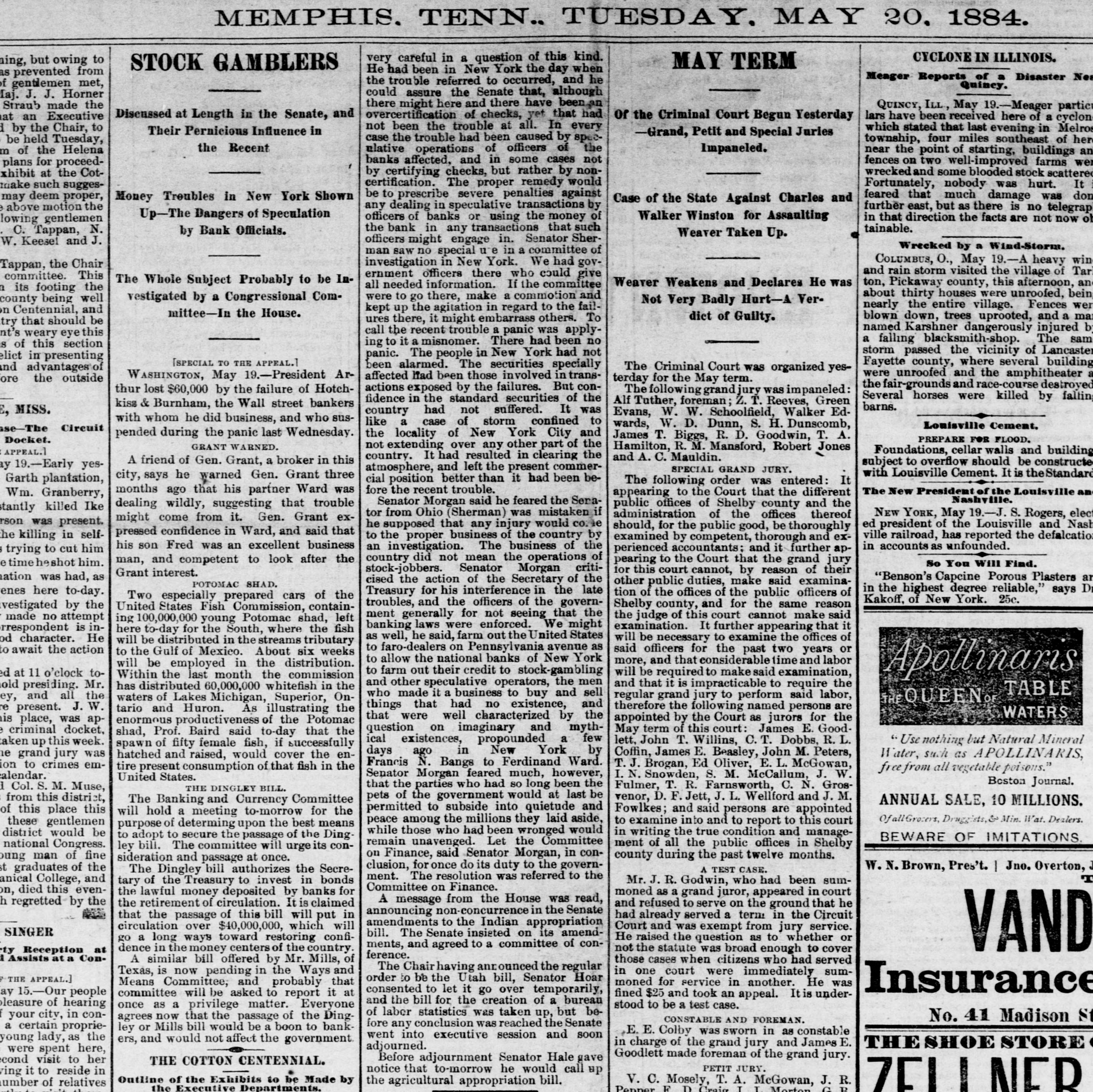 MEMPHIS. TENN. TUESDAY. MAY 20. 1884. CYCLONE IN ILLINOIS. very careful in a question of this kind. ning, but owing to MAY TERM STOCK GAMBLERS He had been in New York the day when as prevented from Meager Reports of a Disaster Ne the trouble referred to occurred, and he of gentlemen met, Quincy. could assure the Senate that, although Iaj. J. J. Horner there might here and there have been an Straub made the QUINCY, ILL, May 19.-Meager particular overcertification of checks, yet that had Discussed at Length in the Senate, and at an Executive or the Criminal Court Begun Yesterday lars have been received here of a cyclon not been the trouble at all. In every I by the Chair, to which stated that last evening in Melro Their Pernicious Influence in -Grand, Petit and Special Juries case the trouble had been caused by spectownship, four miles southeast of her be held Tuesday, the Recent Impaneled. ulative operations of officers of the m of the Helena near the point of starting, buildings an banks affected. and in some cases not fences on two well-improved farms we plans for proceedby certifying checks, but rather by nonxhibit at the Cotwrecked and some blooded stock scattered certification. The proper remedy would Fortunately, nobody was hurt. It I make such suggesbe to prescribe severe penalties against feared that much damage was don may deem proper, Money Troubles in New York Shown Case of the State Against Charles and any dealing in speculative transactions by above motion the further east, but as there is no telegrap Up-The Dangers of Speculation Walker Winston for Assaulting officers of banks or using the money of in that direction the facts are not now ol lowing gentlemen tainable. the bank in any transactions that such C. Tappan, N. by Bank Officials. Weaver Taken Up. officers might engage in. Senator SherW. Keesel and J. Wrecked by a Wind-Storm. man saw no special ue in a committee of COLUMBUS, O., May 19.-A heavy win investigation in New York. We had govTappan, the Chair and rain storm visited the village of Tarl ernment officers there who could give committee. This The Whole Subject Probably to be InWeaver Weakens and Declares He was ton, Pickaway county, this afternoon, an all needed information. If the committee h its footing the about thirty houses were unroofed, bein were to go there, make a commotion and vestigated by a Congressional Comcounty being well Not Very Badly Hurt-A Vernearly the entire village. Fences wer kept up the agitation in regard to the failn Centennial, and mittee-In the House. blown down, trees uprooted, and a ma diet of Guilty. ures there, it might embarrass others. To try that should be named Karshner dangerously injured bj call the recent trouble a panic was applynt's weary this a falling blacksmith-shop. The sam ing to it a misnomer. There had been no s of this section storm passed the vicinity of Lancaster panic. The people in New York had not elict in presenting [SPECIAL TO THE APPEAL.] Fayette county, where several building been alarmed. The securities specially and advantages of The Criminal Court was organized yeswere unroofed and the amphitheater a affected had been those involved in transWASHINGTON, May 19.-President Arore the outside terday for the May term. the air-grounds and race-course destroyed actions exposed by the failures. But conthur lost $60,000 by the failure of HotchThe following grand was impaneled: Several horses were killed by falling fidence in the standard securities of the Alf Tuther, foreman; Z. T. Reeves, Green kiss & Burnham, the Wall street bankers barns. E, MISS. country had not suffered. It was Evans, W. W. Schoolfield, Walker Edwith whom he did business, and who suslike a case of storm confined to wards, W. D. Dunn, S. H. Dunscomb, Louisville Cement. ase-The Circuit pended during the panic last Wednesday. the locality of New York City and James T. Biggs, R. D. Goodwin, T. A. PREPARE FOR FLOOD. Docket. not extending over any other part of the GRANT WARNED. Hamilton, R. M. Mansford, Robert Jones APPEAL.] Foundations, cellar walls and building country. It had resulted in clearing the and A. C. Mauldin. A friend of Gen. Grant, a broker in this subject to overflow should be constructed ay 19.-Early yesatmosphere, and left the present commerSPECIAL GRAND JURY. with Louisville Cement. It is Standard city, says he warned Gen. Grant three Garth plantation, cial position better than it had been beThe following order was entered: It fore the recent trouble. months ago that his partner Ward was The New President of the Louisville an appearing to the Court that the different Wm. Granberry, Nashville. Senator Morgan said he feared the Seradealing wildly, suggesting that trouble public offices of Shelby county and the stantly killed Ike tor from Ohio (Sherman) was mistaken if administration of the offices thereof NEW YORK, May 19.-J. Rogers, elect might come from it. Gen. Grant exrson was present. ed president of the Louisville and Nash he supposed that any injury would co. e should, for the public good, be thoroughly pressed confidence in Ward, and said that to the proper business of the country by ville railroad, has reported the defalcation the killing in selfexamined by competent, thorough and exhis son Fred was an excellent business in accounts as unfounded. an investigation. The business of the perienced accountants; and it further ap3 trying to cut him country did not mean the operations of pearing to the Court that the grand jury man, and competent to look after the e timeheshot him. So You Will Find. stock-jobbers. Senator Morgan critifor this court cannot, by reason of their Grant interest. ation was had, as "Benson's Capcine Porous Plasters ar cised the action of the Secretary of the other public duties, make said examinaPOTOMAC SHAD. in the highest degree reliable," says D Treasury for his interference in the late enes here to-day. tion of the offices of the public officers of Two especially prepared cars of the Kakoff, of New