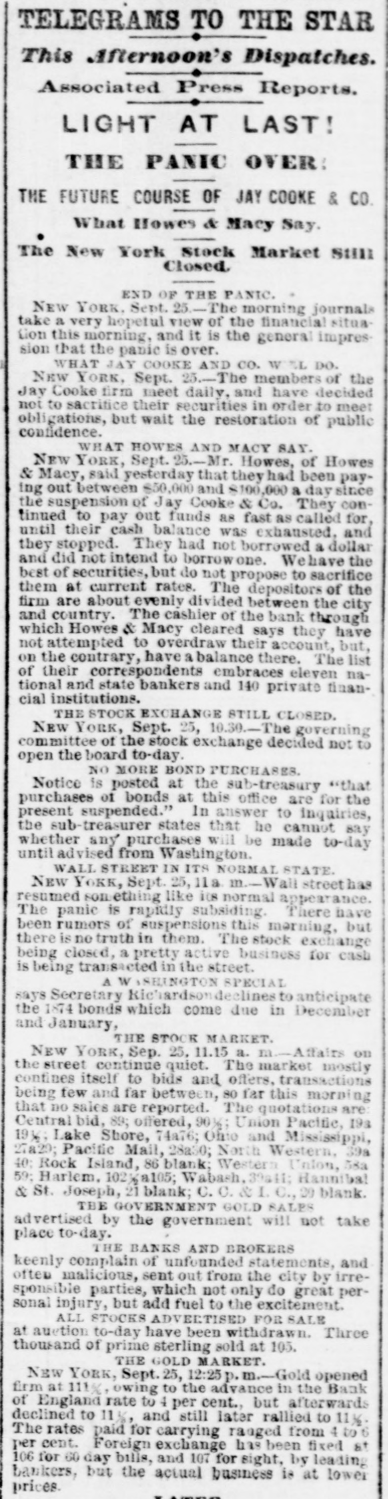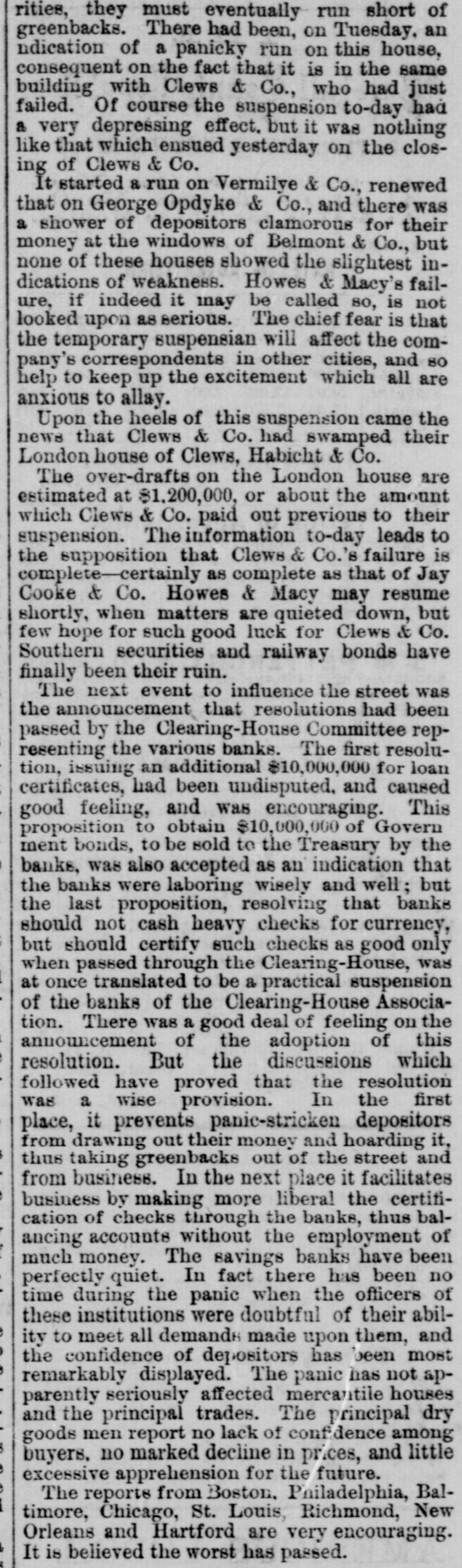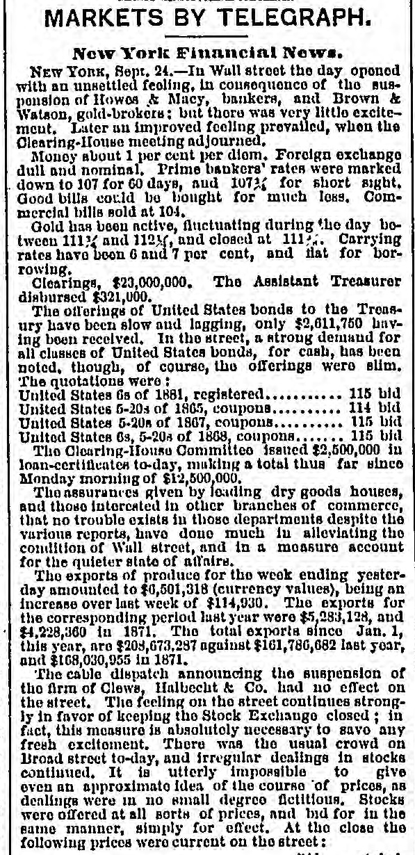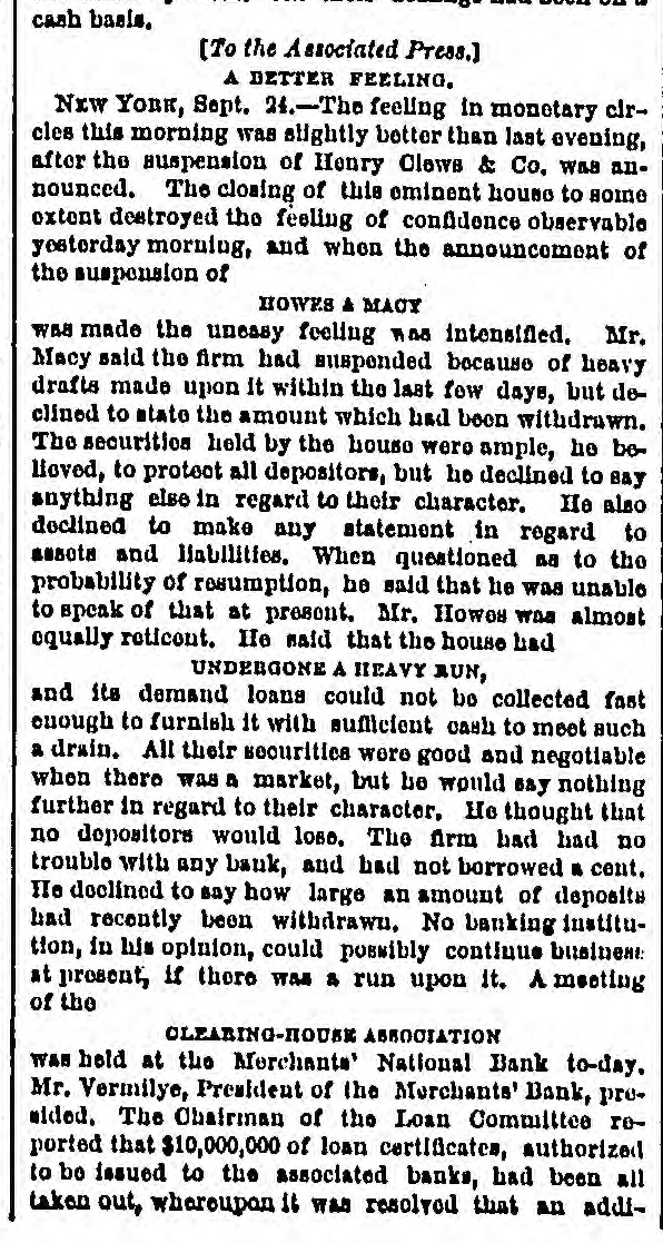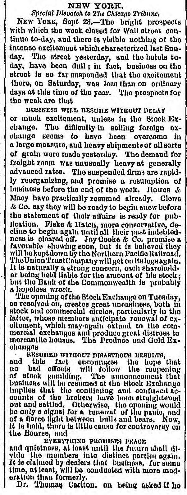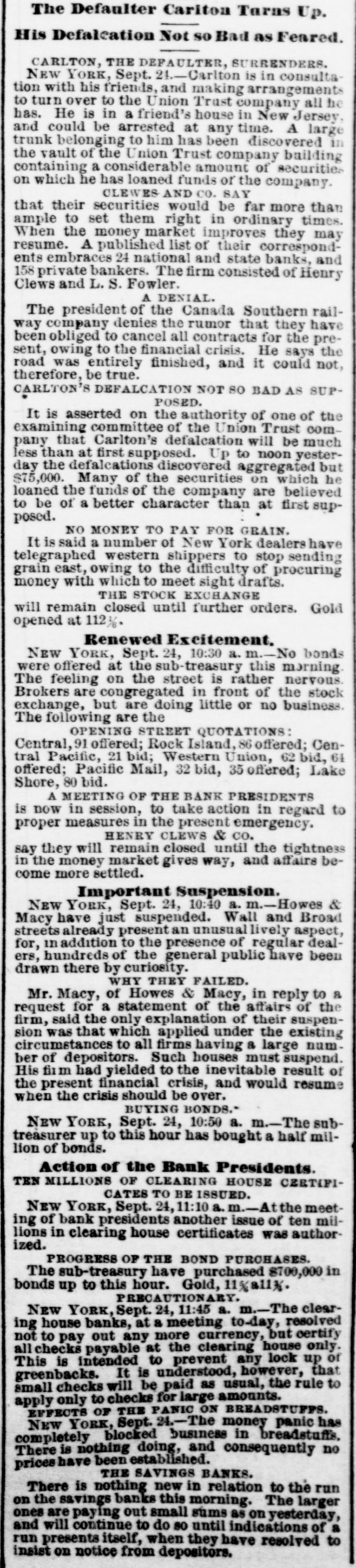 The Defaulter Cariton Taras Up. His Defalcation Not so Bad as Feared. CARLTON, THE DEFAULTER, SURRENDERS. NEW YORK, Sept. 21. Carlton is in consulta tion with his friends, and making arrangements to turn over to the Union Trust company all he has. He is in a friend's house in New Jersey, and could be arrested at any time. A large trunk belonging to him has been discovered in the vault of the Union Trust company building containing a considerable amount of securities on which he has loaned funds or the company. CLEWES AND CO. SAY that their securities would be far more than ample to set them right in ordinary times. When the money market improves they may resume. A published list of their correspondents embraces 24 national and state banks, and 158 private bankers. The firm consisted of Henry Clews and L.S. Fowler. A DENIAL. The president of the Canada Southern railway company denies the rumor that they have been obliged to cancel all contracts for the present, owing to the financial crisis. He says the road was entirely finished, and it could not, therefore, be true. CARLTON'S DEFALCATION NOT so BAD AS SUPPOSED. It is asserted on the authority of one of the examining committee of the Union Trust company that Carlton's defalcation will be much less than at first supposed. Up to noon yesterday the defalcations discovered aggregated but $75,000. Many of the securities on which he loaned the funds of the company are believed to be of a better character than at first supposed. NO MONEY TO PAY FOR GRAIN. It is said a number of New York dealers have telegraphed western shippers to stop sending grain east, owing to the difficulty of procuring money with which to meet sight drafts. THE STOCK EXCHANGE will remain closed until further orders. Gold opened at 112 Renewed Excitement, NEW YORK, Sept. 24, 10:30 a. m. No bonds were offered at the sub-treasury this morning The feeling on the street is rather nervous. Brokers are congregated in front of the stock exchange, but are doing little or no business. The following are the OPENING STREET QUOTATIONS: Central, 91 offered; Rock Island, 86 offered; Central Pacific, 21 bid; Western Union, 62 bid, 61 offered; Pacific Mail, 32 bid, 35 offered; Lake Shore, 80 bid. A MEETING OF THE BANK PRESIDENTS is DOW in session, to take action in regard to proper measures in the present emergency. HENRY CLEWS & CO. say they will remain closed until the tightness in the money market gives way, and affairs become more settled. Important Suspension. NEW YORK, Sept. 24, 10:40 a. m.-Howes & Macy have just suspended. Wall and Broad streets already present an unusual lively aspect, for, in addition to the presence of regular dealers, hundreds of the general public have been drawn there by curiosity. WHY THEY FAILED. Mr. Macy, of Howes & Macy, in reply to a request for a statement of the affairs of the firm, said the only explanation of their suspension was that which applied under the existing circumstances to all firms having a large num. ber of depositors. Such houses must suspend. His firm had yielded to the inevitable result of the present financial crisis, and would resume when the crisis should be over. BUYING BONDS. NEW YORK, Sept. 24, 10:50 a. m.-The subtreasurer up to this hour has bought a half million of bonds. Action of the Bank Presidents. TEN MILLIONS OF CLEARING HOUSE CERTIFICATES TO BE ISSUED. NEW YORK, Sept. 24, 11:10 a. m.-Atthe meeting of bank presidents another issue of ten millions in clearing house certificates was authorized. PROGRESS OF THE BOND PURCHASES. The sub-treasury have purchased $700,000 in bonds up to this hour. Gold, 11%all% PRECAUTIONARY. NEW YORK, Sept. 24, 11:45 a. -The clearing house banks, at a meeting to-day, resolved not to pay out any more currency, but certify all checks payable at the clearing house only. This is intended to prevent any lock up of greenbacks. It is understood, however, that small checks will be paid as usual, the rule to apply only to checks for large amounts. EFFECTS OF THE PANIC ON BREADSTUFFS. NEW YORK, Sept. 24.-The money panic has completely blocked business in breadstuffs. There is nothing doing, and consequently no prices have been established. THE SAVINGS BANKS. There is nothing new in relation to the run on the savings banks this morning. The larger ones are paying out small sums as on yesterday, and will continue to do so until indications of a run presents itself, when they have resolved to insist on notice from depositors.