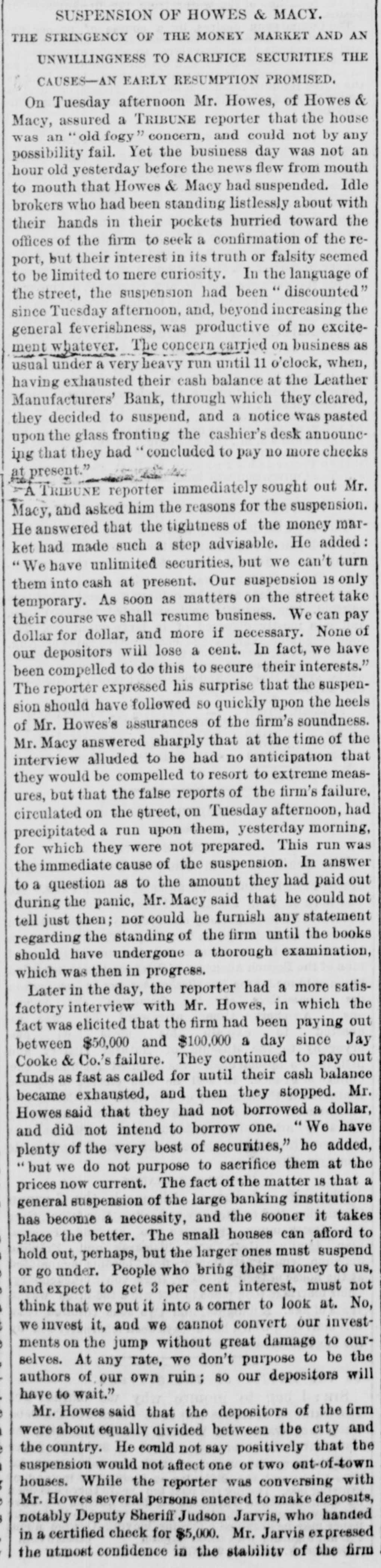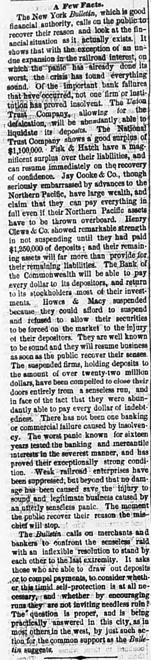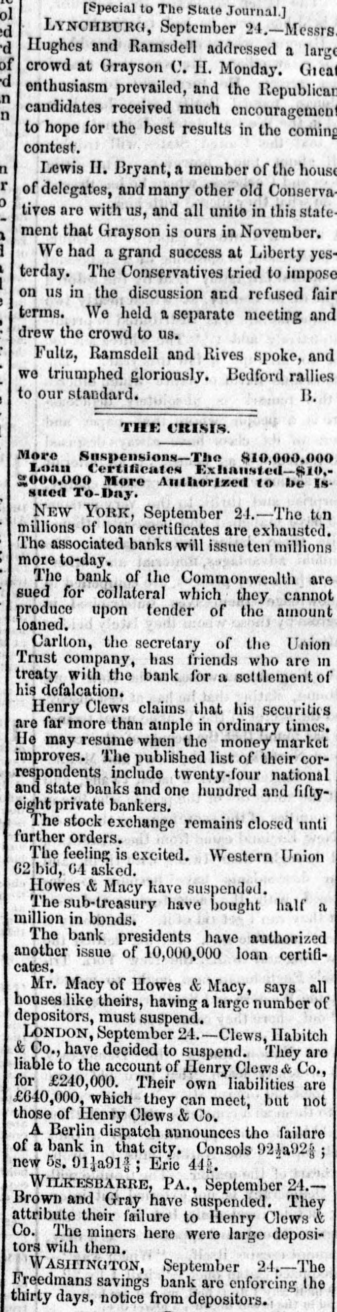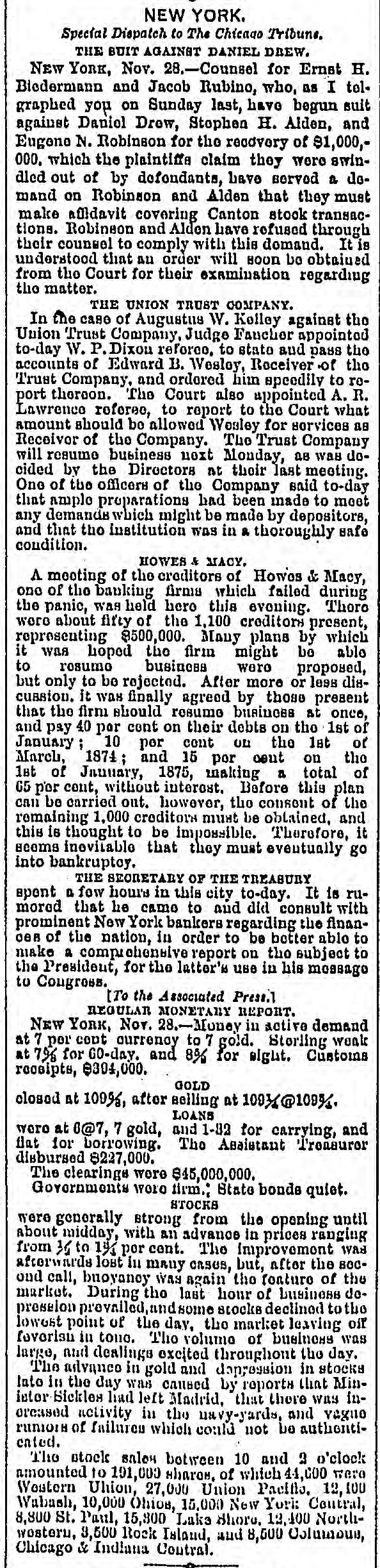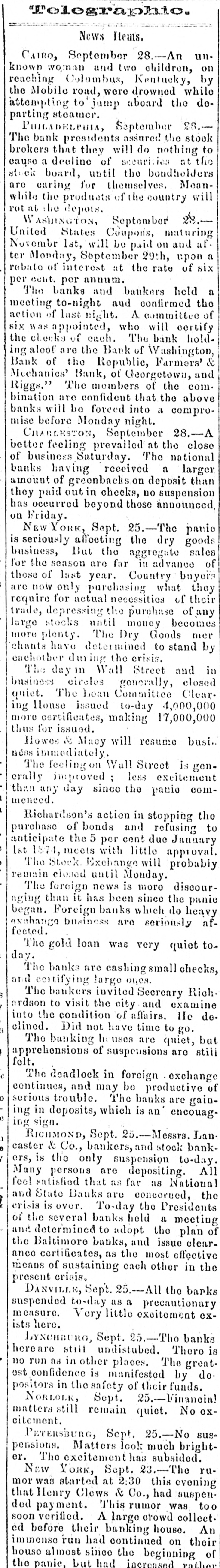 The Defaulter Cariton Taras Up. His Defalcation Not so Bad as Feared. CARLTON, THE DEFAULTER, SURRENDERS. NEW YORK, Sept. 21. Carlton is in consulta tion with his friends, and making arrangements to turn over to the Union Trust company all he has. He is in a friend's house in New Jersey, and could be arrested at any time. A large trunk belonging to him has been discovered in the vault of the Union Trust company building containing a considerable amount of securities on which he has loaned funds or the company. CLEWES AND CO. SAY that their securities would be far more than ample to set them right in ordinary times. When the money market improves they may resume. A published list of their correspondents embraces 24 national and state banks, and 158 private bankers. The firm consisted of Henry Clews and L.S. Fowler. A DENIAL. The president of the Canada Southern railway company denies the rumor that they have been obliged to cancel all contracts for the present, owing to the financial crisis. He says the road was entirely finished, and it could not, therefore, be true. CARLTON'S DEFALCATION NOT so BAD AS SUPPOSED. It is asserted on the authority of one of the examining committee of the Union Trust company that Carlton's defalcation will be much less than at first supposed. Up to noon yesterday the defalcations discovered aggregated but $75,000. Many of the securities on which he loaned the funds of the company are believed to be of a better character than at first supposed. NO MONEY TO PAY FOR GRAIN. It is said a number of New York dealers have telegraphed western shippers to stop sending grain east, owing to the difficulty of procuring money with which to meet sight drafts. THE STOCK EXCHANGE will remain closed until further orders. Gold opened at 112 Renewed Excitement, NEW YORK, Sept. 24, 10:30 a. m. No bonds were offered at the sub-treasury this morning The feeling on the street is rather nervous. Brokers are congregated in front of the stock exchange, but are doing little or no business. The following are the OPENING STREET QUOTATIONS: Central, 91 offered; Rock Island, 86 offered; Central Pacific, 21 bid; Western Union, 62 bid, 61 offered; Pacific Mail, 32 bid, 35 offered; Lake Shore, 80 bid. A MEETING OF THE BANK PRESIDENTS is DOW in session, to take action in regard to proper measures in the present emergency. HENRY CLEWS & CO. say they will remain closed until the tightness in the money market gives way, and affairs become more settled. Important Suspension. NEW YORK, Sept. 24, 10:40 a. m.-Howes & Macy have just suspended. Wall and Broad streets already present an unusual lively aspect, for, in addition to the presence of regular dealers, hundreds of the general public have been drawn there by curiosity. WHY THEY FAILED. Mr. Macy, of Howes & Macy, in reply to a request for a statement of the affairs of the firm, said the only explanation of their suspension was that which applied under the existing circumstances to all firms having a large num. ber of depositors. Such houses must suspend. His firm had yielded to the inevitable result of the present financial crisis, and would resume when the crisis should be over. BUYING BONDS. NEW YORK, Sept. 24, 10:50 a. m.-The subtreasurer up to this hour has bought a half million of bonds. Action of the Bank Presidents. TEN MILLIONS OF CLEARING HOUSE CERTIFICATES TO BE ISSUED. NEW YORK, Sept. 24, 11:10 a. m.-Atthe meeting of bank presidents another issue of ten millions in clearing house certificates was authorized. PROGRESS OF THE BOND PURCHASES. The sub-treasury have purchased $700,000 in bonds up to this hour. Gold, 11%all% PRECAUTIONARY. NEW YORK, Sept. 24, 11:45 a. -The clearing house banks, at a meeting to-day, resolved not to pay out any more currency, but certify all checks payable at the clearing house only. This is intended to prevent any lock up of greenbacks. It is understood, however, that small checks will be paid as usual, the rule to apply only to checks for large amounts. EFFECTS OF THE PANIC ON BREADSTUFFS. NEW YORK, Sept. 24.-The money panic has completely blocked business in breadstuffs. There is nothing doing, and consequently no prices have been established. THE SAVINGS BANKS. There is nothing new in relation to the run on the savings banks this morning. The larger ones are paying out small sums as on yesterday, and will continue to do so until indications of a run presents itself, when they have resolved to insist on notice from depositors.