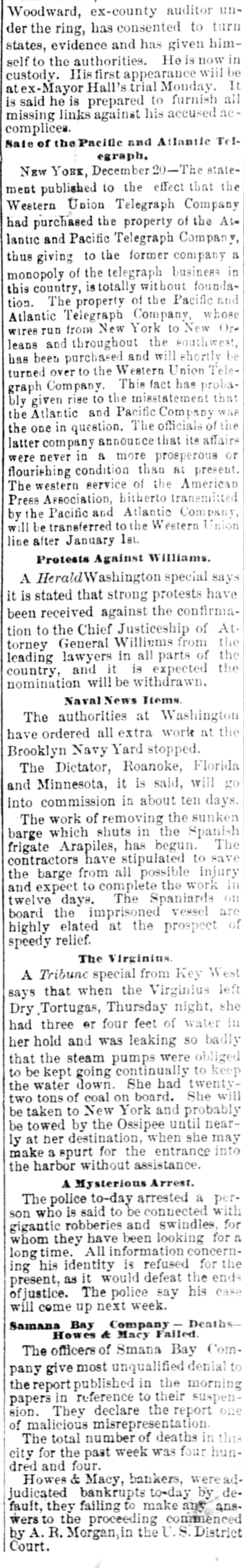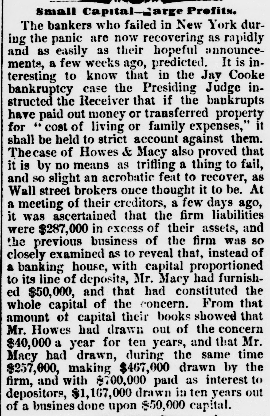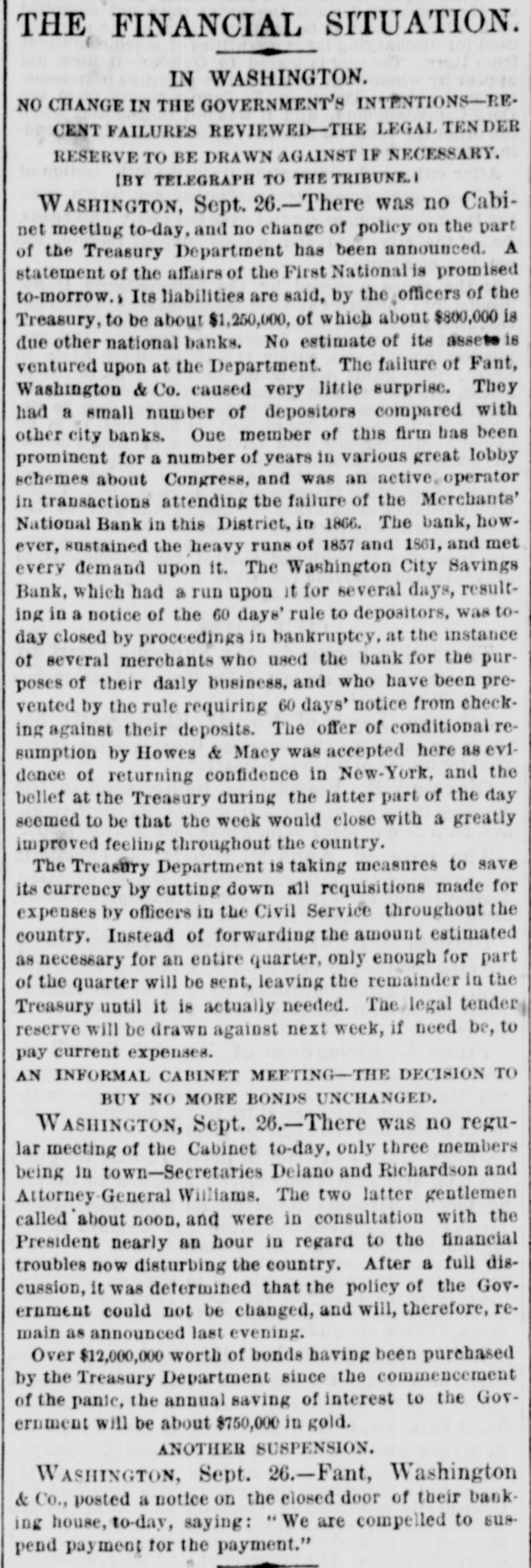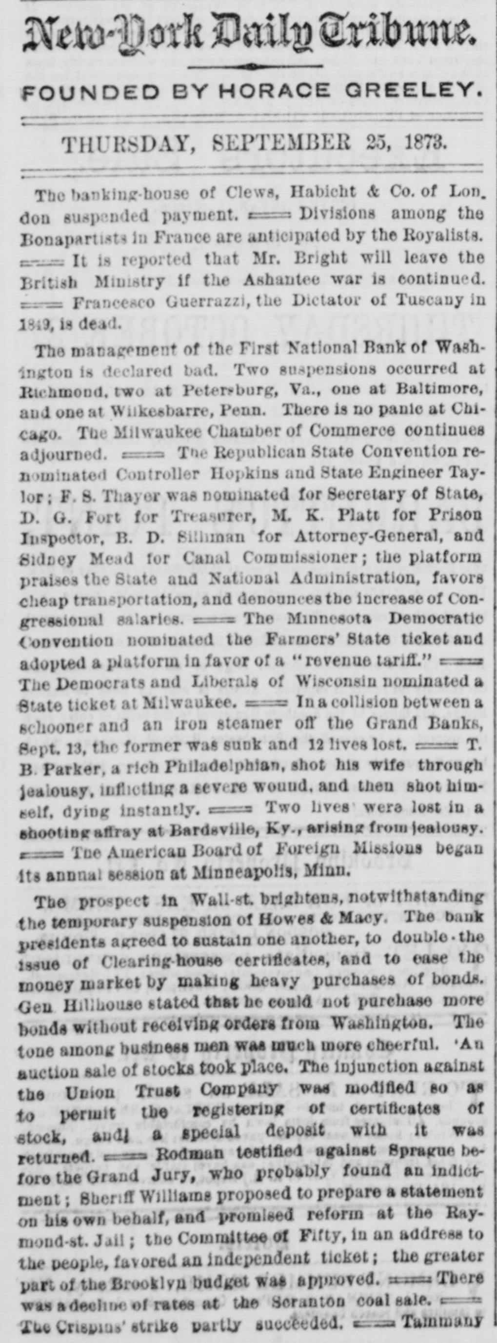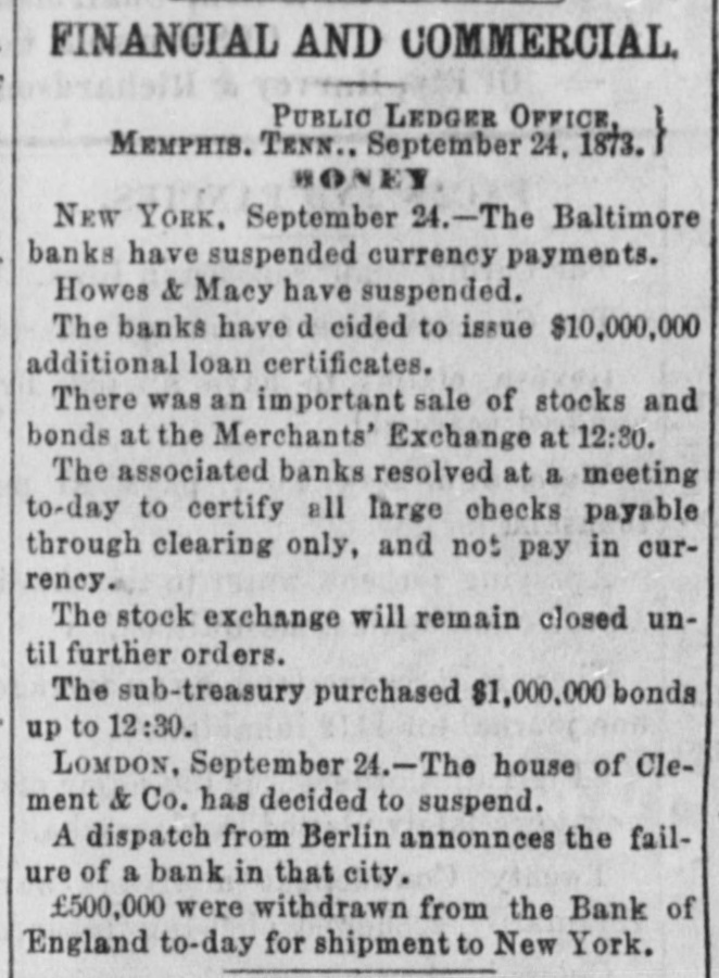 The Defaulter Cariton Taras Up. His Defalcation Not so Bad as Feared. CARLTON, THE DEFAULTER, SURRENDERS. NEW YORK, Sept. 21. Carlton is in consulta tion with his friends, and making arrangements to turn over to the Union Trust company all he has. He is in a friend's house in New Jersey, and could be arrested at any time. A large trunk belonging to him has been discovered in the vault of the Union Trust company building containing a considerable amount of securities on which he has loaned funds or the company. CLEWES AND CO. SAY that their securities would be far more than ample to set them right in ordinary times. When the money market improves they may resume. A published list of their correspondents embraces 24 national and state banks, and 158 private bankers. The firm consisted of Henry Clews and L.S. Fowler. A DENIAL. The president of the Canada Southern railway company denies the rumor that they have been obliged to cancel all contracts for the present, owing to the financial crisis. He says the road was entirely finished, and it could not, therefore, be true. CARLTON'S DEFALCATION NOT so BAD AS SUPPOSED. It is asserted on the authority of one of the examining committee of the Union Trust company that Carlton's defalcation will be much less than at first supposed. Up to noon yesterday the defalcations discovered aggregated but $75,000. Many of the securities on which he loaned the funds of the company are believed to be of a better character than at first supposed. NO MONEY TO PAY FOR GRAIN. It is said a number of New York dealers have telegraphed western shippers to stop sending grain east, owing to the difficulty of procuring money with which to meet sight drafts. THE STOCK EXCHANGE will remain closed until further orders. Gold opened at 112 Renewed Excitement, NEW YORK, Sept. 24, 10:30 a. m. No bonds were offered at the sub-treasury this morning The feeling on the street is rather nervous. Brokers are congregated in front of the stock exchange, but are doing little or no business. The following are the OPENING STREET QUOTATIONS: Central, 91 offered; Rock Island, 86 offered; Central Pacific, 21 bid; Western Union, 62 bid, 61 offered; Pacific Mail, 32 bid, 35 offered; Lake Shore, 80 bid. A MEETING OF THE BANK PRESIDENTS is DOW in session, to take action in regard to proper measures in the present emergency. HENRY CLEWS & CO. say they will remain closed until the tightness in the money market gives way, and affairs become more settled. Important Suspension. NEW YORK, Sept. 24, 10:40 a. m.-Howes & Macy have just suspended. Wall and Broad streets already present an unusual lively aspect, for, in addition to the presence of regular dealers, hundreds of the general public have been drawn there by curiosity. WHY THEY FAILED. Mr. Macy, of Howes & Macy, in reply to a request for a statement of the affairs of the firm, said the only explanation of their suspension was that which applied under the existing circumstances to all firms having a large num. ber of depositors. Such houses must suspend. His firm had yielded to the inevitable result of the present financial crisis, and would resume when the crisis should be over. BUYING BONDS. NEW YORK, Sept. 24, 10:50 a. m.-The subtreasurer up to this hour has bought a half million of bonds. Action of the Bank Presidents. TEN MILLIONS OF CLEARING HOUSE CERTIFICATES TO BE ISSUED. NEW YORK, Sept. 24, 11:10 a. m.-Atthe meeting of bank presidents another issue of ten millions in clearing house certificates was authorized. PROGRESS OF THE BOND PURCHASES. The sub-treasury have purchased $700,000 in bonds up to this hour. Gold, 11%all% PRECAUTIONARY. NEW YORK, Sept. 24, 11:45 a. -The clearing house banks, at a meeting to-day, resolved not to pay out any more currency, but certify all checks payable at the clearing house only. This is intended to prevent any lock up of greenbacks. It is understood, however, that small checks will be paid as usual, the rule to apply only to checks for large amounts. EFFECTS OF THE PANIC ON BREADSTUFFS. NEW YORK, Sept. 24.-The money panic has completely blocked business in breadstuffs. There is nothing doing, and consequently no prices have been established. THE SAVINGS BANKS. There is nothing new in relation to the run on the savings banks this morning. The larger ones are paying out small sums as on yesterday, and will continue to do so until indications of a run presents itself, when they have resolved to insist on notice from depositors.