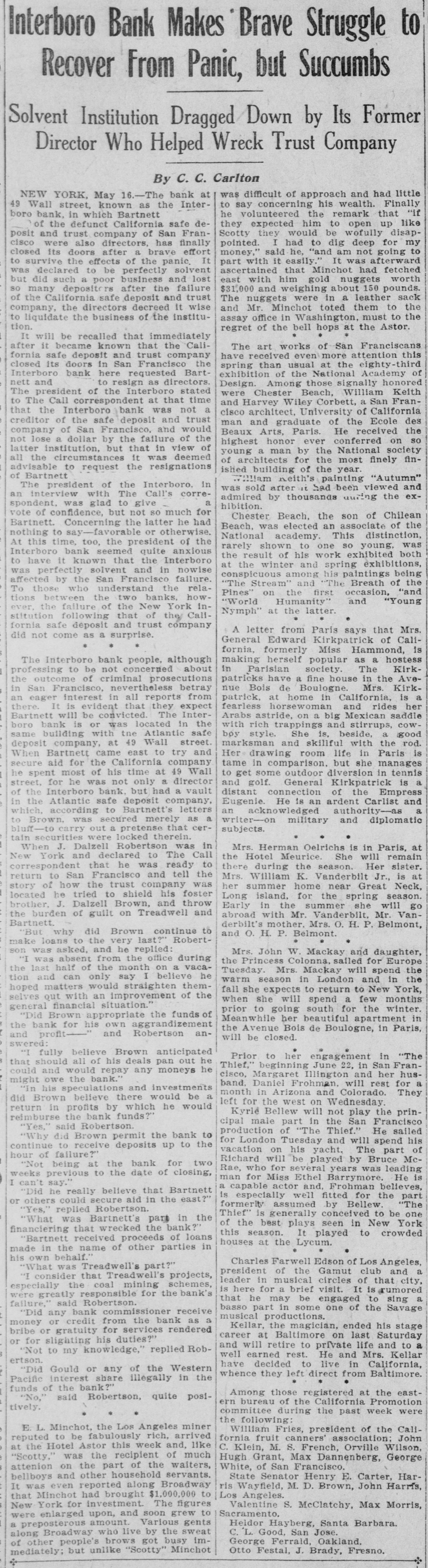 Interboro Bank Makes Brave Struggle to Recover From Panic, but Succumbs Solvent Institution Dragged/Down by Its Former Director Who Helped Wreck Trust Company By C. Carlton was difficult of approach and had little NEW YORK, May 16.-The bank at to say concerning his wealth. Finally 49 Wall street, known as the Interhe volunteered the remark that "If boro bank, in which Bartnett of the defunct California safe dethey expected him to open up like Scotty they would be wofully disapposit and trust company of San Francisco were also directors, has finally pointed. I had to dig deep for my closed its doors after a brave effort money." said he, "and am not going to to survive the effects of the panic. It part with it easily. It was afterward ascertained that Minchot had fetched was declared to be perfectly solvent east with him gold nuggets worth but did such a poor business and lost $31,000 and weighing about 150 pounds. so many depositors after the failure The nuggets were in a leather sack of the California safe deposit and trust and Mr. Minchot toted them to the company, the directors decreed it wise to liquidate the business of the instituassay office in Washington, must to the tion. regret of the bell hops at the Astor. It will be recalled that immediately after it became known that the CaliThe art works of San Franciscans fornia safe deposit and trust company have received even more attention this closed its doors in San Francisco the spring than usual at the eighty-third Interboro bank here requested Bartexhibition of the National Academy of nett and to resign as directors. Design. Among those signally honored The president of the Interboro stated were Chester Beach, William Keith to The Call correspondent at that time and Harvey Wiley Corbett, a San Franthat the Interboro bank was not a cisco architect. University of California creditor of the safe deposit and trust man and graduate of the Ecole des company of San Francisco. and would Beaux Arts, Paris. He received the not lose a dollar by the failure of the highest honor ever conferred on so latter institution, but that in view of young a man by the National society all the circumstances it was deemed of architects for the most finely finadvisable to request the resignations ished building of the year. of Bartnett miam neith's painting "Autumn" The president of the Interboro, in was sold after it had been viewed and an interview with The Call's correadmired by thousands uning the exa spondent. was glad to give hibition. vote of confidence, but not so much for Chester Beach, the son of Chilean Bartnett. Concerning the latter he had Beach, was elected an associate of the nothing to say-favorable or otherwise. National academy. This distinction, At this time, too, the president of the rarely shown to one so young, was Interboro bank seemed quite anxious the result of his work exhibited both to have it known that the Interboro at the winter and spring exhibitions, was perfectly solvent and in nowise conspicuous among his paintings being affected by the San Francisco failure "The Stream" and "The Breath of the To those who understand the relaPines' on the first occasion, "and tions between the two banks, how"World Humanity" and "Young ever. the failure of the New York inNymph" at the latter. stitution following that of the Callfornia safe deposit and trust company A letter from Paris says that Mrs. did not come as a surprise. General Edward Kirkpatrick of California, formerly Miss Hammond, is The Interboro bank people, although making herself popular as a hostess in Parisian society. The Kirkprofessing to be not concerned about patricks have a fine house in the Avethe outcome of criminal prosecutions nue Bois de Boulogne. Mrs. Kirkin San Francisco, nevertheless betray patrick, at home in California, is a an eager interest in all reports from fearless horsewoman and rides her there. It is evident that they expect Bartnett will be convicted. The InterArabs astride, on a big Mexican saddle boro bank is or was located in the with rich trappings and stirrups, cowsame building with the Atlantic safe boy style. She is, beside, a good marksman and skillful with the rod. deposit company, at 49 Wall street. When Bartnett came east to try and Her drawing room life in Paris is secure aid for the California company tame in comparison, but she manages to get some outdoor diversion in tennis he spent most of his time at 49 Wall street, for he was not only a director and golf. General Kirkpatrick is a of the Interboro bank. but had a vault distant connection of the Empress in the Atlantic safe deposit company Eugenie. He is an ardent Carlist and a which. according to Bartnett's letters an acknowledged authorityto Brown. was secured merely as a writer-on military and diplomatic bluff-to carry out a pretense that cersubjects. tain securities were locked therein. When J. Dalzell Robertson was in Mrs. Herman Oelrichs is in Paris, at New York and declared to The Call the Hotel Meurice. She will remain correspondent that he was ready to there during the season. Her sister. return to San Francisco and tell the Mrs. William K. Vanderbilt Jr., is at her summer home near Great Neck, story of how the trust company was located he tried to shield his foster Long island. for the spring season. brother. J. Dalzell Brown, and throw Early in the summer she will go the burden of guilt on Treadwell and abroad with Mr. Vanderbilt, Mr. VanBartnett. derbilt's mother. Mrs. O. H. P. Belmont, "But why did Brown continue to and O. H. P. Belmont. make loans to the very last?" Robertson was asked, and he replied: Mrs. John W. Mackay and daughter, "I was absent from the office during the Princess Colonna, sailed for Europe the last half of the month on a vacaTuesday. Mrs. Mackay will spend the tion and can only say I believe he warm season in London and in the hoped matters would straighten them fall she expects to return to New York, selves out with an improvement of the when she will