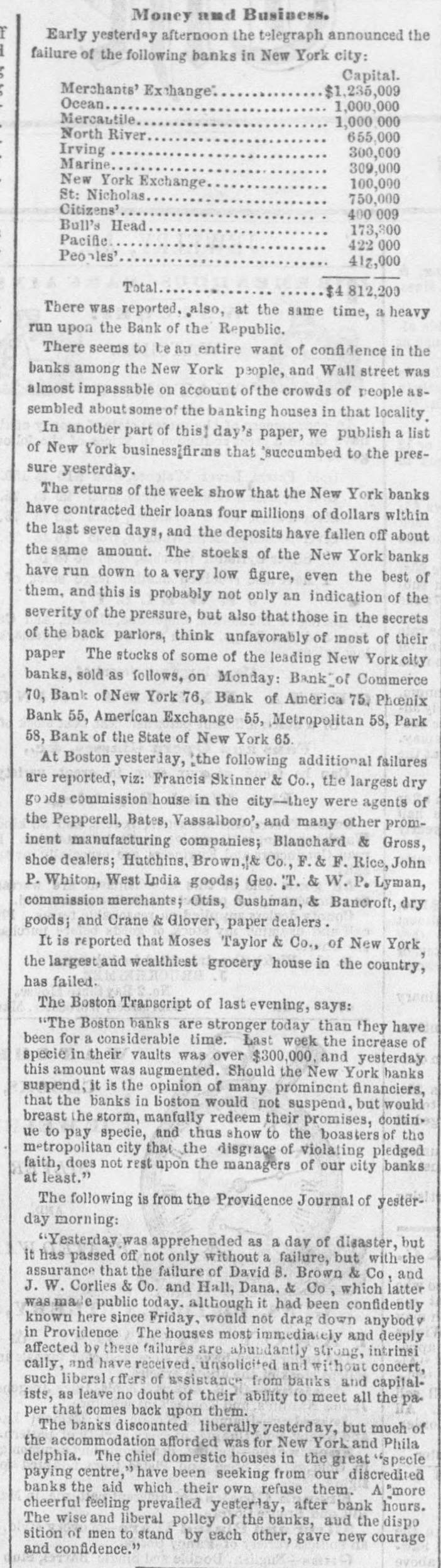 Money and Business. Early yesterday afternoon the telegraph announced the failure of the following banks in New York city: Capital. $1,235,009 Merchants' Exchange: Ocean 1,000,000 Mercautile 1,000,000 North River 655,000 Irving 300,000 Marine 309,000 New York Exchange 100,000 St: Nicholas 750,000 Citizens' 400 009 Bull's Head 173,800 Pacific 422 000 Peoples' 412,000 Total 812,200 There was reported. also, at the same time, a heavy run upon the Bank of the Republic. There seems to be an entire want of confidence in the banks among the New York people, and Wall street was almost impassable on account of the crowds of people assembled aboutsome of the banking houses in that locality. In another part of this] day's paper, we publish a list of New York business[firms that "succumbed to the pressure yesterday. The returns of the week show that the New York banks have contracted their loans four millions of dollars within the last seven days, and the deposits have fallen off about the same amount. The stoeks of the New York banks have run down to a very low figure, even the best of them, and this is probably not only an indication of the severity of the pressure, but also that those in the secrets of the back parlors, think unfavorably of most of their paper The stocks of some of the leading New York city banks, sold as follows, on Monday: Bank of Commerce 70, Bank of New York 76, Bank of America 75. Phoenix Bank 55, American Exchange 55, Metropolitan 58, Park 58, Bank of the State of New York 65. At Boston yesterday, the following additional failures are reported, viz: Francis Skinner & Co., the largest dry go ds commission house in the city-they were agents of the Pepperell, Bates, Vassalboro', and many other prominent manufacturing companies; Blanchard & Gross, shoe dealers; Hutchins, Brown Co., F. & F. Rice, John P. Whiton, West India goods; Geo. T. & W.P. Lyman, commission merchants; Otis, Cushman, & Bancroft, dry goods; and Crane & Glover, paper dealers It is reported that Moses Taylor & Co., of New York the largest and wealthiest grocery house in the country, has failed. The Boston Transcript of last evening, says: "The Boston banks are stronger today than they have been for a considerable time. Last week the increase of specie in their vaults was over $300,000. and yesterday this amount was augmented. Should the New York banks suspend, it is the opinion of many prominent financiers, that the banks in Boston would not suspend, but would breast the storm, manfully redeem their promises, continue to pay specie, and thus show to the boasters of the metropolitan city that the disgrace of violating pledged faith, does not rest upon the managers of our city banks at least." The following is from the Providence Journal of yesterday morning: "Yesterday was apprehended as a day of disaster, but it has passed off not only without a failure, but with the assurance that the failure of David B. Brown & Co, and J. W. Corlies & Co. and Hall, Dana, & Co, which latter was made public today. although it had been confidently known here since Friday, would not drag down anybod in Providence The houses most immediately and deeply affected by these failures are abundantly strong, intrinsi cally, and have received, unsolicited and without concert, such liberal ffers of assistance from banks and capitalists, as leave no doubt of their ability to meet all the paper that comes back upon them. The banks discounted liberally yesterday, but much of the accommodation afforded was for New York and Phila delphia. The chief domestic houses in the great "specte paying centre," have been seeking from our discredited banks the aid which their own refuse them. Al'more cheerful feeling prevailed yesterday, after bank hours. The wise and liberal pollcy of the banks, and the dispo sition of men to stand by each other, gave new courage and confidence."