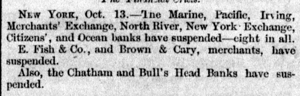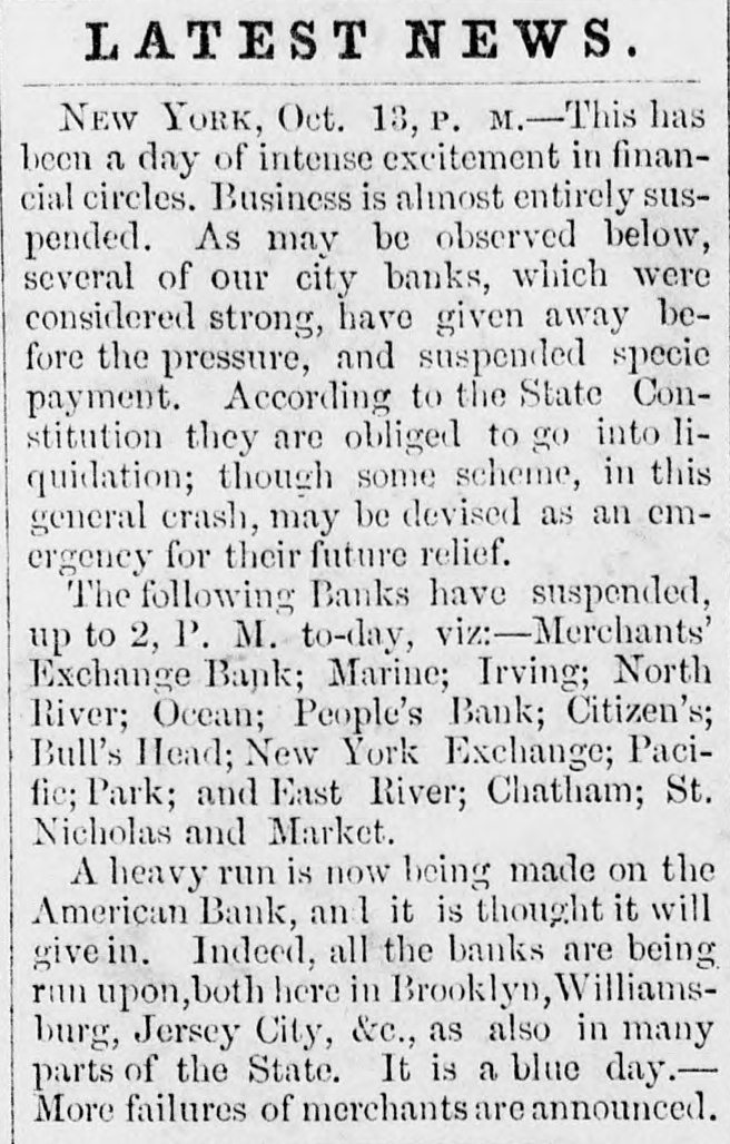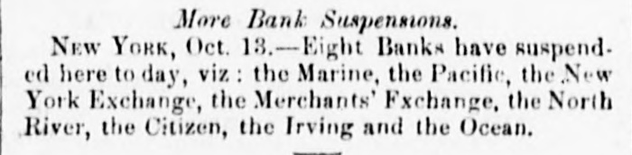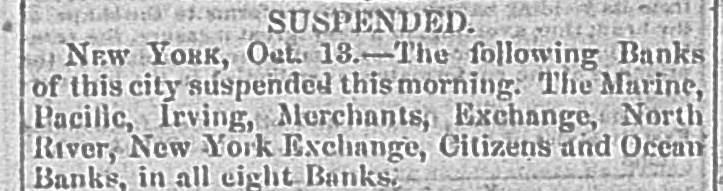 Bank Failures NEW YORK, Oct. 13. To day has been a very exciting one on financial' matters. Up to 2 o'clock, 15 City Banks had suspended. The following is a revised list: Bank of New York, St. Nicholas, Chatham, Ocean, Market, Butchers' and Drovers', Merchant's Exchange, Irving, Citizens, Tradesman, Bullshead, North River and Marine. The latter, it is said, was stopped by an injunction precured by one of its customers, and it is presumed other banks have been stopped in the same way, as by this means the penalty of winding up which is attached to suspension in most cases of affairs, when generally known, will undoubtedly serve to allay the present undue excitement. Wall street at two o'clock was crowded with an anxious crowd of people. The steps of all the Banks were also blocked up by people, forcing their way into the Banks, At the American Exchange, David Leavitt addressed the crowd, assuring them that all the banks would pay all to the last dollar. He also announced thrt an arrangement had been made with several of the strongest banks to go through without suspension. It is believed, however, in the street, that the suspension will be general. It is understood that some of our heaviest houses have withdrawn their gold from the banks and replaced it as specię deposts. There were rumors during the morning affecting nearly all the banks in the city, but the list gives all that had certainly suspended up to 3 P. M., The others, it is believed, continued to meet their liabilities tothe close of business hours. The sales of Railroad stocks at the first board were small at a general decline.— In State stocks business was large at a decline, excepting in Virginia's and Missouri's. Bank stock all sold at a decline. The run on the Brooklyn Savings Bank was renewed to-day with less vigor, the Bank paying promptly. Several failures in the dry goods line are announced, but none of very prominent firms. LATEST.-Tne run upon the Mechanics & Merchants Bank of America, Manhattan and American Exchange Banks was severe, and continued up to close of business.