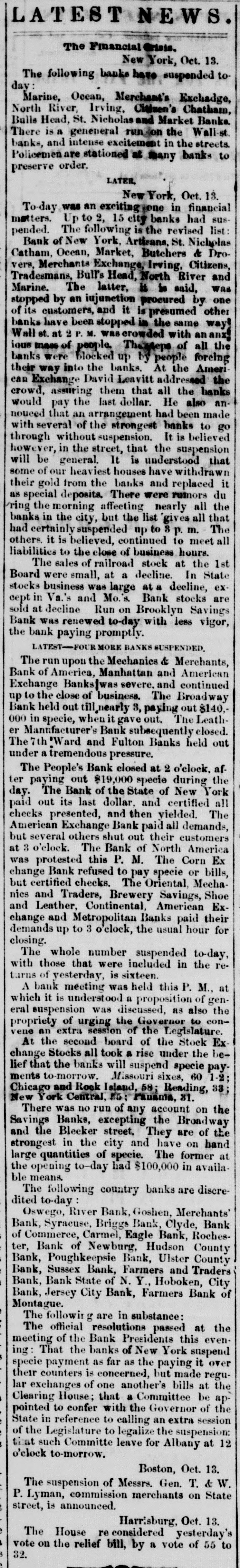 LATEST NEWS. The Financial Crisis. New York, Oct. The following banke have suspended today Ocean, Merchant's Exchadge, Chatham, Marine, River, Irving. Citizen's Banks North St. Nicholas and Market Wall-st. Bulls Head, geneneral runson the the streets. There is and a intense excitement in banks to Policemen are banks, stationed at many preserve order. LATER. New York, Oct. 13. was an exciting in had financial susToday 15 city banks list matters. The following is the revised New York, Artirans. St. & Dropended. of Butchers Nicholas Bank Ocean, Market, Citizens, Catham, Merchants Exchange, Irving, River and vers, Bull's Head, North said, was The latter, it is stopped and it Marine. an injunction other Tradesmans, customers, by is presumed procured by way! one of banks its have been stopped in the with same an anx Wall st. at 2 P. M. was crowded of all mass blocked up by banks into the banks. At addressed way David Leavitt them that all also anious can their Exchange were assuring of people. people He the the forcing Ameri banks the the crowd, the last dollar. been made would pay an arrangement had to go of the strongest It is without suspension. nouced through with several that the banks suspension believed however, in the street, that is understood that will be general. heaviest It houses have replaced withdrawn it some of our from the banks and rumors du their special gold deposits. There were nearly all the ring the morning city, affecting but the list 'gives all that The banks certainly in the suspended up to 8 to p. m. meet all had it is believed, continued hours. others. to the close of business at the liabilities sales of railroad stock In State 1st The were small, at a decline. decline, exMo. stocks Board business was large at Bank a stocks are cept in Va.'s and Run on Brooklyn Savings vigor, sold Bank at was decline renewed to-day with less the bank paying promptly. LATEST-FOUR MORE SUSPENDED. run upon the Mechanics and & Merchants, American The of America, Manhattan and continued Bank Banks severe. Broadway Exchange close of business. The out $140, up to the held out till nearly 3, paying The LeathBank when it gave out. 000 in Bank held er and Fulton Banks a tremendous The7th under Manufacturer's specie, 'Ward pressure. subsequently o'clock. closed. out afBank closed at 2 during the The People's out $19,000 specie New York ter paying Bank of the State of certified day. The dollar, and The paid checks out presented, and Bank then paid all demands, its Exchange last yielded. customers all American others shut out their North America but several The Bank of Corn Ex at was 3 o'clock. protested this P. pay M. specie The or bills, change Bank checks. refused to The Oriental, Mecha- Shoe but certified Traders, Brewery American Savings, Exand nics and Leather, Continental, Banks paid their change demands and up to Metropolitan 3 o'clock, the usual hour for closing. number suspended to-day, the The those whole that were included in returns with of yesterday, meeting was is sixteen. held this P. of M., gen- at which A bank it is understood discussed, a proposition as also the propriety eral suspension of urging was the of Governor the Legislature. to conan second board of under the At the all took a rise paychange banks will suspend 60 that the Missouri sixes, lief vene to-morrow. Stocks extra session the Reading, specie Stock 1-2; 33; Ex be- the ments Chicago and Central, Rock Island, F5: Panama, 58; 31. on New There York was no run of any account the Broadway Savings Banks, Blecker excepting street. They are of hand the and the in the city and The have former on at strongest of specie. availathe large opening quantities -day had $100,000 in dited ble The means following country banks are discreto-day River Bank, Goshen, Clyde, Merchants Bank Bank, Oswego, Syracuse. Carmel, Briggs Eagle Bank, Bank, Rochesof Commerce, Hudson County ter, Bank Poughkeepsie Farmers Bank, and Traders Bank, of Bank, Newburg, Ulster County City Bank, Bank, Sussex State of N. Y., Hoboken, Bank of Bank, Jersey Bank City Bank, Farmers the Montague. following are in substance: The resolutions passed this at of the New York meeting The That official the banks Bank Presidents of the paying suspend it even- over specie payment is as concerned, but bills made at of one Committee be aping: lar their exchanges counters that far another's as u of regu- the the Clearing to House; confer with the Governor an extra session State pointed in reference to calling legalize the suspension: 12 o'clock to-morrow. that of the such Legislature Committe to leave for Albany at Boston, Oct. 13. & W. Lyman, The suspension commission of Messrs. merchants Gen. on T. State street, P. is announced. considered Harrisburg, yesterday's Oct. 13. 32. vote The on the House relief re bill, by a vote of 55 to