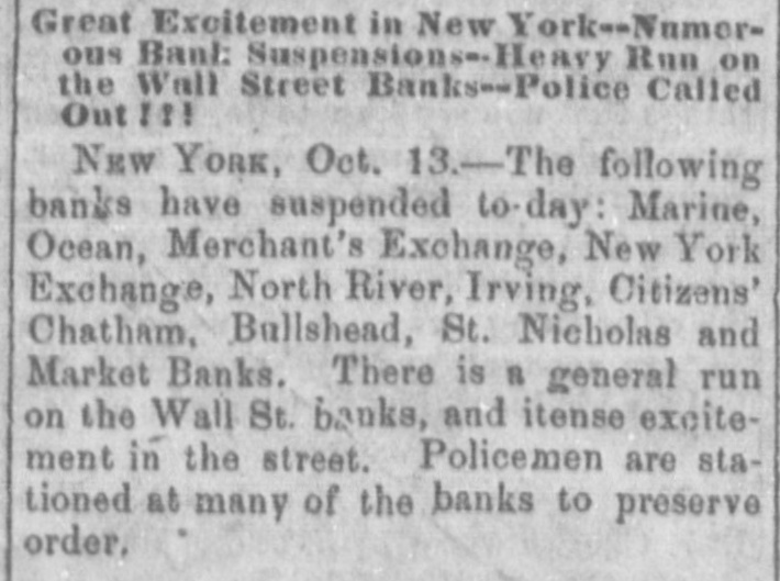 Great Excitement in New York--Numerous Bank Suspensions--Heayy Run on the Wall Street Banks-Police Called Out!!! NEW YORK, Oct. 13.-The following banks have suspended to-day: Marine, Ocean, Merchant's Exchange, New York Exchange, North River, Irving, Citizens' Chatham, Bullshead, St. Nicholas and Market Banks. There is R general run on the Wall St. banks, and itense excitement in the street. Policemen are stationed at many of the banks to preserve order.