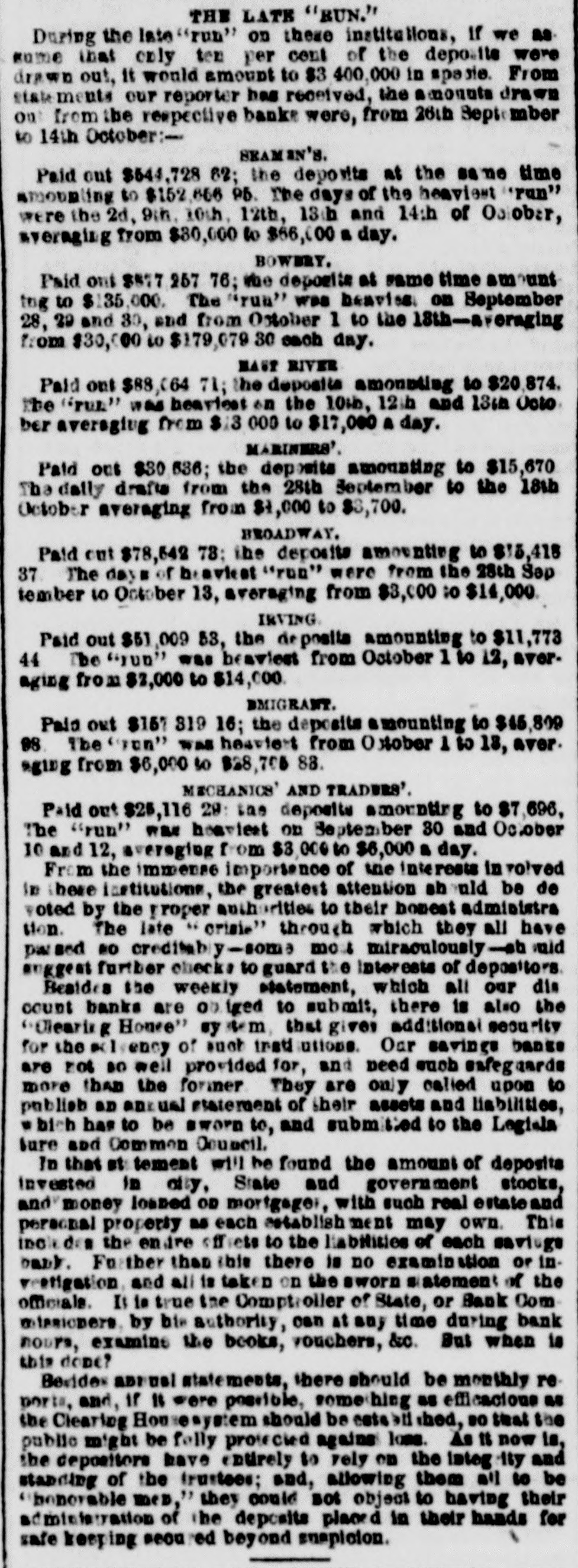 THE LATE "RUN." During the "run" on these institutions, If we as sume that only ten per cent of the deposite were drawn out, It would amount to $3 400,000 in spacie. From statements our reporter has received, the amounts drawn on from the respective banks were, from 26th September to 14th October:SEAMEN'S. Paid out $544,728 82; the deposits nt the same time amounting to $152,666 95. The days of the heaviest "run" were the 2d, 9th, 10th, 12th, 13th and 14:h of October, averaging from $80,000 to $66,000 a day. BOWERY. Paid ont $577.2 76; the deposite at same time amount tog to $135,000. The "run" was heavies. on September 28, 20 and 30, and from October 1 to the 18th-averaging from $30,000 to $179,079.30 sach day. HAST RIVER Paid out $88,064 71; the deposits amounting to $20,874. the "run" was heartest on the 10th, 12th and 13th Octo ber averaging from $13 000 to $17,000 a day. MARINERS'. Paid out $30,536; the deposits amounting to $15,670 The daily drafts from the 28th September to the 18th October averaging from $1,000 to $8,700. BROADWAY. Paid out $78,542 78; the deposits amounting to $15,418 37 The days of heaviest "run" were from the 28th Sep tember to October 13, averaging from $3,000 to $14,000. IRVING Paid out $51,009 53, the deposits amounting to $11,773 44 The "IUD" was heaviest from October 1 to 12, averaging from $2,000 to $14,000. BMIGRANT. Paid out $157 319 16; the deposits amounting to $45,809 98. The "Ton" was heaviert from October 1 to 18, aver. aging from $6,000 to $28,705 88. MECHANICS' AND TRADERS'. Paid out $25,116 29: the deposits amounting to $7,696, The "run" was heaviest on September 30 and October 10 and 12, averaging from $3,000 to $6,000 a day. From the immense importance of the interests in volved in here institutions, the greatest attention sh uld be de voted by the proper authorities to their honest administra tion. The late " orisie" through which they all have passed RO creditably-some most miraculously-eb vaid suggent further checks to guard the Interests of depositors. Resides the weekly statement, which all our dis count banks are obliged to submit, there is also the "Clearing House" system, that gives additional security for the acliency of such trati utions. Our savings banks are not so well provided for, and need such oxfeguards more than the former. They are only called upon to publish an annual statement of their assets and liabilities, bich has to be sworn to, and submitted to the Legisla ture and Common Douncil. In that st: tement will be found the amount of deposits invested in city, State and government stocks, and money loaned OD mortgage, with such real estateand personal property as each establish ment may own. This includes the entre officts to the liabilities of each savings bask. Further than this there is no examination or investigation and all is taken on the sworn stement of the officials. It is true the Comptroller of State, or Bank Com missioners, by bin authority, can at any time during bank nours, examine the books, vouchers, &c. But when is this done? Besides annual statements, there should be monthly reports, and, If n were possible, something as efficacious as the Clearing House system should be establi hed, DO that the public might be fully protected agains loss. As It now is, the depositors have entirely to vely on the integ ity and standing of the trustees; and, allowing them all to be "bonorable men," they could not object to having their administration of the deposits placed in their hands for safe keeping secured beyond suspicion.