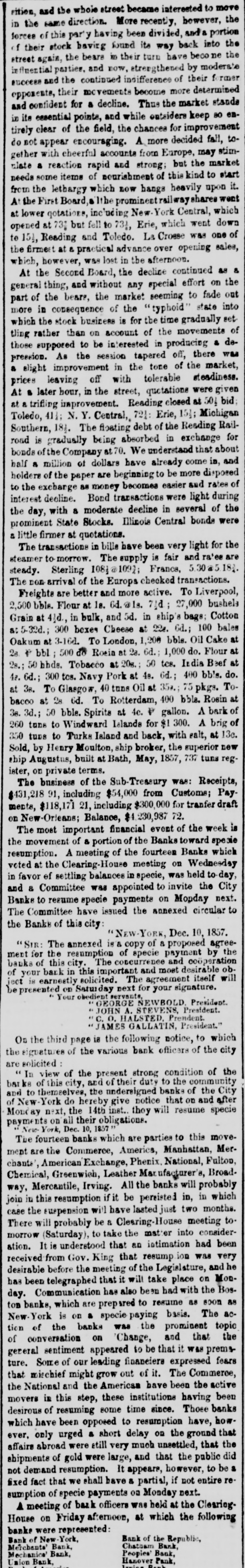 in forces of this party having been divided, and a portion of their stock having found its way back into the street again, the bears in their turn have beco ne the influential parties, and now, strengthened by moderate success and the continued indifference of their rmer opponents, their movements become more determined and confident for a decline. Thus the market stands in its essential points, and while entsiders keep 80 entirely clear of the field, the chances for improvement do not appear encouraging. A more decided fall, together with cheerful accounts from Europe, may stimulate a reaction rapid and strong; but the market needs some items of nourishment of this kind to start from the lethargy which now hangs heavily upon it. At the First Board, lthe went at lower qotations, including New.York Central, which opened at 73% but fell to 731, Erie, which went down to 151, Reading and Toledo. La Crosse was one of the firmest at & practical advance over opening sales, which, however, was lost in the afternoon. At the Second Board, the decline continued as & general thing, and without any special effort on the part of the bears, the market seeming to fade out more in consequence of the "typhoid" state into which the stock business is for the time gradually set thing rather than on account of the movements of those supposed to be interested in producing & depression. As the session tapered off, there was a elight improvement in the tone of the market, prices leaving off with tolerable steadiness. At & later hour, in the street, quotations were given at a trifling improvement. Reading closed at 501 bid; Toledo, 411; N. Y. Central, 721: Erie, 151; Michigan Southern, 181. The floating debt of the Reading Railroad is gradually being absorbed in exchange for bonds of the Company 70. We understand that about half a million of dollars have already come in, and holders of the paper are beginning to be more disposed to the exchange as money becomes easier and rates of interest decline. Bond transactions were light during the day, with a moderate decline in several of the prominent State Stocks. Illinois Central bonds were a little firmer at quotations. The transactions in bills have been very light for the steamer to morrow. The supply is fair and rates are steady. Sterling 108} 1092; Francs, 5.30 181. The non arrival of the Europa checked transactions. Freights are better and more active. To Liverpool, 2,500 bble. Flour at 1s. 6d. 1s. 71d 27,000 bushels Grain at 41d., in bulk, and 5d. in ship's bags; Cotton at 5-32d.; 300 bexes Cheese at 22a. 6d.; 100 bales Oakum at 3-16d. To London, 1,200 bbls. Oil Cake at 2a. P bbl 500 do Rosia at 2a. 6d.; 1,000 do. Flour at 2s.; 50 hhds. Tobacco at 20s.; 50 tes. India Beef at 4a. 6d.; 300 tes. Navy Pork at 4s. 6d.; 400 bbls. do. at 3s. To Glasgow, 40 tuns Oil at 35a.; 75 pkgs. Tobacco at 28 6d. To Rotterdam, 400 bbla. Rosin at 3s. 3d.; 50 bble. Spirits at 4c. P gallon. A bark of 260 tuns to Windward Islands for $1 300. A brig of 350 tuns to Turks Island and back, with salt, at 13c. Sold, by Henry Moulton, ship broker, the superior new ship Augustus, built at Bath, May, 1857, 737 tuns register, on private terms. The business of the Sub-Treasury was: Receipts, $431,218 91, including $54,000 from Customs; Payments, $118,171 21, including $300,000 for tranfer draft on New-Orleans; Balance, $4,230,987 72. The most important financial event of the week is the movement of & portion of the Banks toward specie resumption. A meating of the fourteen Banks which voted at the Clearing-House meeting on Wednesday in favor of settling balances in specie, was held to day, and a Committee was appointed to invite the City Banks to resume specie payments on Monday next. The Committee have issued the annexed circular to the Banks of this city: 'NEW-YORK, Dec. 10, 1857. "SIR: The annexed is a copy of a proposed agreement for the resumption of specie payment by the banks of this city. The concurrence and cooperation of your bank in this important and most desirable ob. ject is earnestly solicited. The agreement itself will be presented on Saturday next for your signature. Your obedient servants, "GEORGE NEWBOLD President. JOHN A. STEVENS, President. C. O. HALSTED. Prendent " JAMES GALLATIN, President." On the third page 18 the following notice, to which the signatures of the various bank officers of the city are solicited In view of the present strong condition of the bar ks of this city, and of their duty to the community and to themselves, the undersigned banks of the City of New-York do hereby give notice that on and after Mond next, the 14th inst. they will resume specie payments on all their obligations. New York, Dec. 10, 1857 The fourteen banks which are parties to this movement are the Commerce, America, Manhattan, Merchants', American Exchange, Phenix, National, Fulton, Chemical, Greenwieh, Leather Manufacturer's, Broadway, Mercantile, Irving. All the banks will probably join in this resumption if it be persisted in, in which case the suspension will have lasted just two months. There will probably be & Clearing-House meeting to morrow (Saturday), to take the matter into consideration. It is understood that an istimation had been received from Gov. King that resump ion was very desirable before the meeting of the Legislature, and he has been telegraphed that it will take place on Monday. Communication has also been had with the Boston banks, which are prepared to resume as soon as New-York is on a specie paying basis. The action of the banks was the prominent topic of conversation on "Change, and that the gereral sentiment appeared to be that it was premature. Some of our leading financiers expressed fears that mischief might grow out of it. The Commerce, the National and the American have been the active movers in this step, these institutions having been desirous of resuming some time since. Those banks which have been opposed to resumption have, however. only urged a short 
