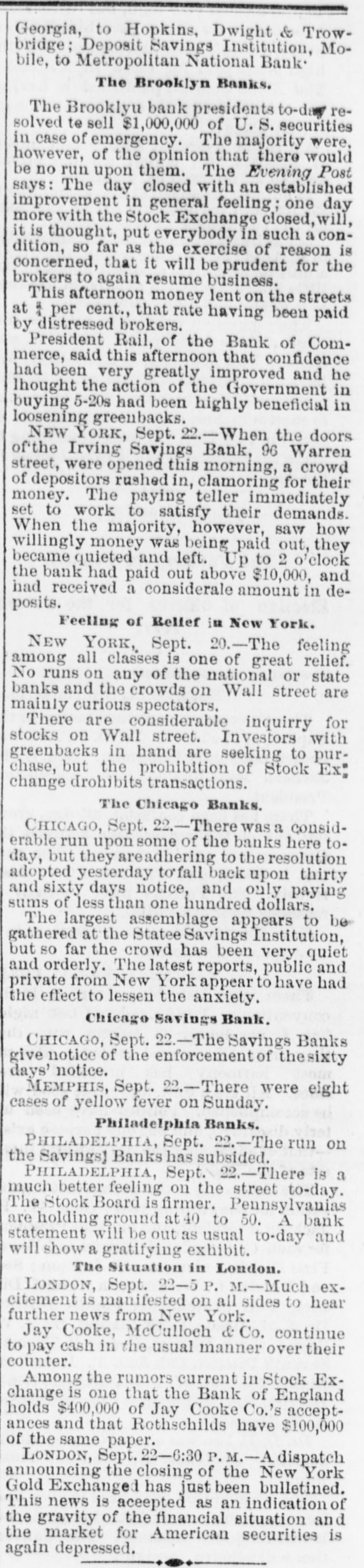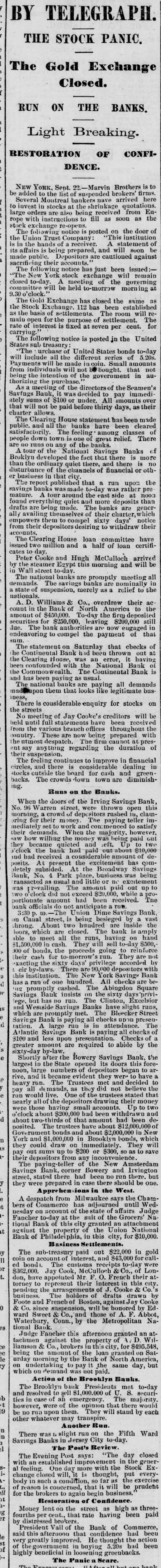 BY TELEGRAPH THE STOCK PANIC. The Gold Exchange Closed. RUN ON THE BANKS. Light Breaking. OF CONFIRESTORATION DENCE. to NEW YORK. Sent 22.- Marvin Brothers added to the list of suspended brokers' arrived here Moutreal bein the the hrinkage quotat from Eu large orders also are with instructions to fill as soon as the in posted on the door of This Trust Company statement prepare will soon prepare are cautioned against their owing notice has just been issued stock exchange will remain the be held will at to-morrow morning Gold Exchange has closed the same as Stock Exchange. 112 has been will The room basis The for the purpose of settlement. for interest is fixed at seven per cent. The followin notice is posted in the United sub treasur, The United States bonds to-day all of the series include Small made h# bought. that the in the the directors of the Seamen immed Bank, decided pay $100 under under. All not be paid before thirty days, as their The Clearing House statement has been made and all the banks have been The feeling There relief. down great of any the if of the Banks that the there quiet there ordinary there, the of financial or that city city that upon the report the side tour quiet being banks The are their notice compel days' their their deposito desiring loan committee have The Clearing House two and issued half million of loan Peter Cooke and Hugh McCulloch arrive will be morning and steamer Egypt street The national ational banks banks are promptly meeting all The savings banks suspension, the merely relief to rdrew their A.D Williams & North the Bauk amount $450,000 To-day the $250,000. leaving $200,000 bank due. avoring The to compel the payment of statement statement Saturday that checks of had Bank been the Clearing error, House an was with Bank National is The the Continent al Bank been has usual. paying been all paving demands - on them that looks like legitimate bus on There is considerable enquiry for stocks streets meeting of Jay Cooke creditors will be been until full have offices country These are now now being prepared pres of anything regarding the duration in feeling financial The improve dealing there stocks board for cash and green diminish backs. The crowds down town are ing. Runs on the Banks When the doors of the Irving Savings Bank were this open rushed dep teller The paying Up paid the has the up The Bank, inside They Savings checks The the insists day Bauk Savings Banks The which met. Savings large Atlantic Bank paying less upou Checks the amount are required required to abide by after the Bowery Savings Bank the doors State the its began numbers The Trustees that One live. their had about been about had The 0.000 000.000 S1 in and draw could They they $200 to $300, sums thei depositor the The teller paying Bank corner and Bowery stated there Savings had there but there be should they were prepared ions in the West. Apprehen until A spatch from Mili says the Wedbers Comm has adjourned the affairs adge Fanche the the at to-day Grocers of this attacht tional Bank this city the of Bank Philade phia this city, for $10,000 Basiness Settlements. in gold The -treasury paid out $22,000 843 000 for account The Co.. $362,000 Jay Cook, this their represeut of Co.'s the & Cooke The of Co Jay Bo French of by Ed o & Sweet Co. those Abbot Conn., by the opolitan Na tional Bank Judge Fancher this afternoon granted against the property liamson tacomen brokers city, for $495,548 the Satmorning being the by the Bank Bank North morning the but day, pay paid. which Action of the Brooklyn Banks. The Brook to-day to-day securiresolved sell $1,000.000 of case an the upon them. They will stand by each other whatever may transpire Another Run. the Fifth Ward There was slight run or City to-day. Jersey Banks Savings The Post's Review closed day 'The The Evening Post says: Stock al ith with the Stock Ex feeling. though put will,1 change closed such be prudent the for of as threehigh the street g fourths per cen Money rate having been paid by President distresse Vail the Bank of Commerce, that had said beeu fidence thought He of : greatly improved mant buying 5.20s had been beneficial highly The Panic Scare bank