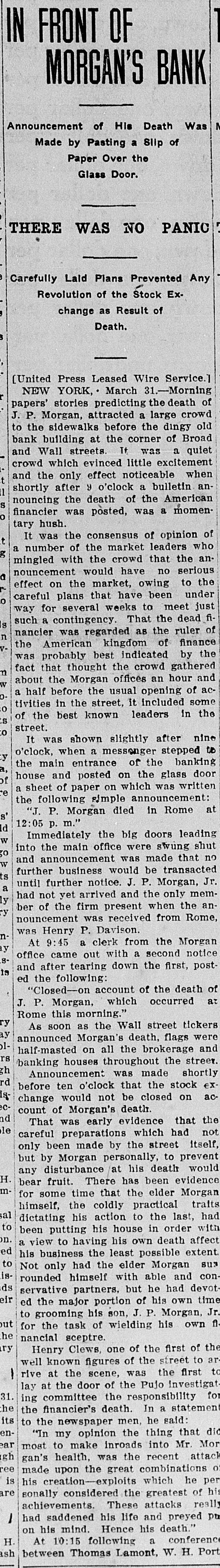 IN FRONT OF MORGAN'S BANK Announcement of His Death Was Made by Pasting a Slip of Paper Over the Glass Door. THERE WAS NO PANIC Carefully Lald Plans Prevented Any Revolution of the Stock Exchange as Result of Death. [United Press Leased Wire Service.] NEW YORK, March 31.-Morning papers' stories predicting the death of J. P. Morgan, attracted a large crowd to the sidewalks before the dingy old bank building at the corner of Broad and Wall streets. Tt was a quiet crowd which evinced little excitement and the only effect noticeable when 1 shortly after y o'clock a bulletin an S nouncing the death of the American financier was posted, was a momen o tary hush. It was the consensus of opinion of t a number of the market leaders who g mingled with the crowd that the anla nouncement would have no serious effect on the market, owing to the lo careful plans that have been under way for several weeks to meet just such a contingency. That the dead Is nancier was regarded as the ruler of vn the American kingdom of finance was probably best indicated by the m fact that thought the crowd gathered w about the Morgan offices an hour and the usual ac o in the street, some a tivities half before it included opening of o of the best known leaders in the S street. to It was shown slightly after nine o'clock, when a messenger stepped to y the main entrance of the banking a, house and posted on the glass door of of on was e simple a the sheet following paper which announcement: written at "J. P. Morgan died in Rome s' 12:05 p. m." Id W Immediately the big doors leading into the main office were swung shut o and announcement was made that no W further business would be transacted ts until further notice. J. P. Morgan, Jr. a had not yet arrived and the only memly ber of the firm present when the any nouncement was received from Rome, was Henry P. Davison. nAt 9:45 a clerk from the Morgan y office came out with a second notice S. and after tearing down the first, post is ed the following: "Closed-on account of the death of at J. P. Morgan, which occurred Rome this morning." ry As soon as the Wall street tickers ay announced Morgan's death, flags were 1half-masted on all the brokerage and rs banking houses throughout the street. h Announcement was made shortly rd before ten o'clock that the stock ex is change would not be closed on ac ccount of Morgan's death d That was early evidence that the le careful preparations which had not only been made by the street itself, but by Morgan personally, to prevent any disturbance at his death would H. fruit. There has been evidence m- time that the the coldly al for bear himself, some practical elder Morgan trafts had dictating his action to the last, to been putting his house in order with n. a view to having his own death affect ed his business the least possible extent. to Not only had the elder Morgan sur isrounded himself with able and con ds servative partners. but he had devot eir ed the major portion of his own time to grooming his son, J. P. Morgan, Jr fl ut for the task of wielding his own he nancial sceptre. ry Henry Clews, one of the first of the well known figures of the street to ar I the scene, was the door of the Pujo the 31. lay rive ing at committee at responsibility the investigat first for to he the financier's death. In a statemen its to the newspaper men, he said en"In my opinion the thing that dió ar most to make inroads into Mr. Mor gh gan's health, was the recent attach ee made upon the great combinations o is his creation-exploits which he per re sonally considered the greatest of his achievements. These attacks really / had saddened his life and preyed pu on his mind. Hence his death.' H At 10:15 following a conferenc sh between Thomas Lamont, W. H. Port