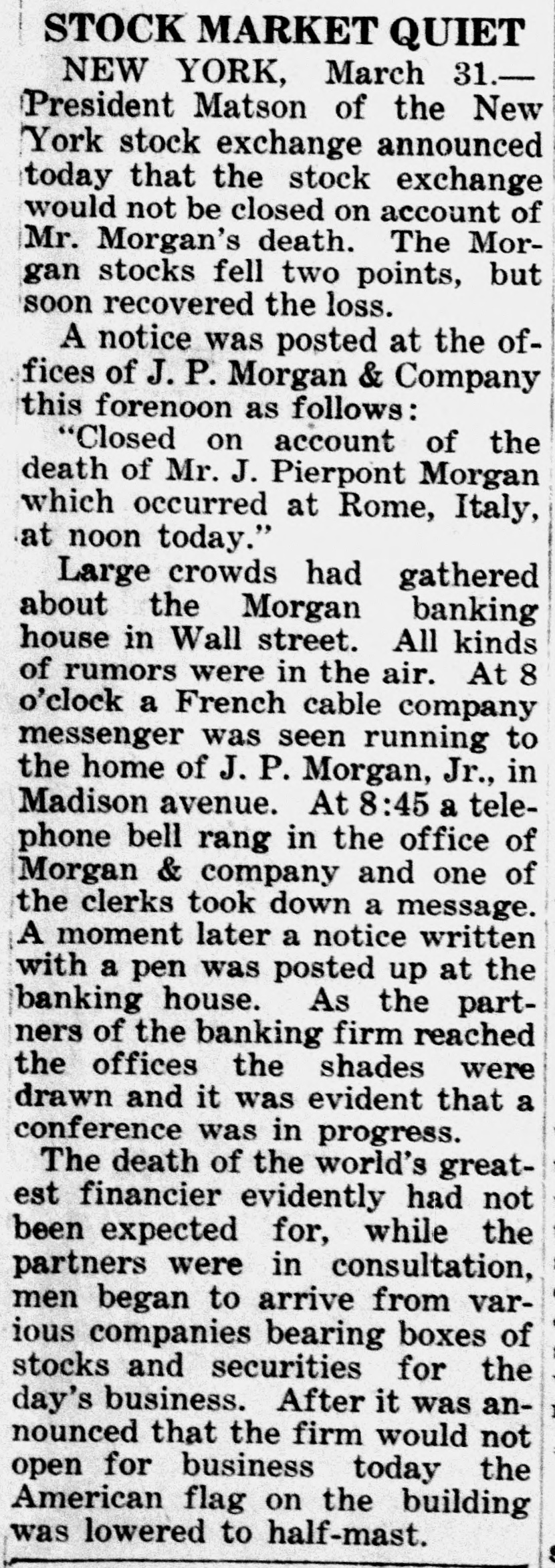 STOCK MARKET QUIET NEW YORK, March 31.President Matson of the New York stock exchange announced today that the stock exchange would not be closed on account of Mr. Morgan's death. The Morgan stocks fell two points, but soon recovered the loss. A notice was posted at the offices of J. P. Morgan & Company this forenoon as follows: "Closed on account of the death of Mr. J. Pierpont Morgan which occurred at Rome, Italy, at noon today." Large crowds had gathered about the Morgan banking house in Wall street. All kinds of rumors were in the air. At 8 o'clock a French cable company messenger was seen running to the home of J. P. Morgan, Jr., in Madison avenue. At 8:45 a telephone bell rang in the office of Morgan & company and one of the clerks took down a message. A moment later a notice written with a pen was posted up at the banking house. As the partners of the banking firm reached the offices the shades were drawn and it was evident that a conference was in progress. The death of the world's greatest financier evidently had not been expected for, while the partners were in consultation, men began to arrive from various companies bearing boxes of stocks and securities for the day's business. After it was announced that the firm would not open for business today the American flag on the building was lowered to half-mast.
