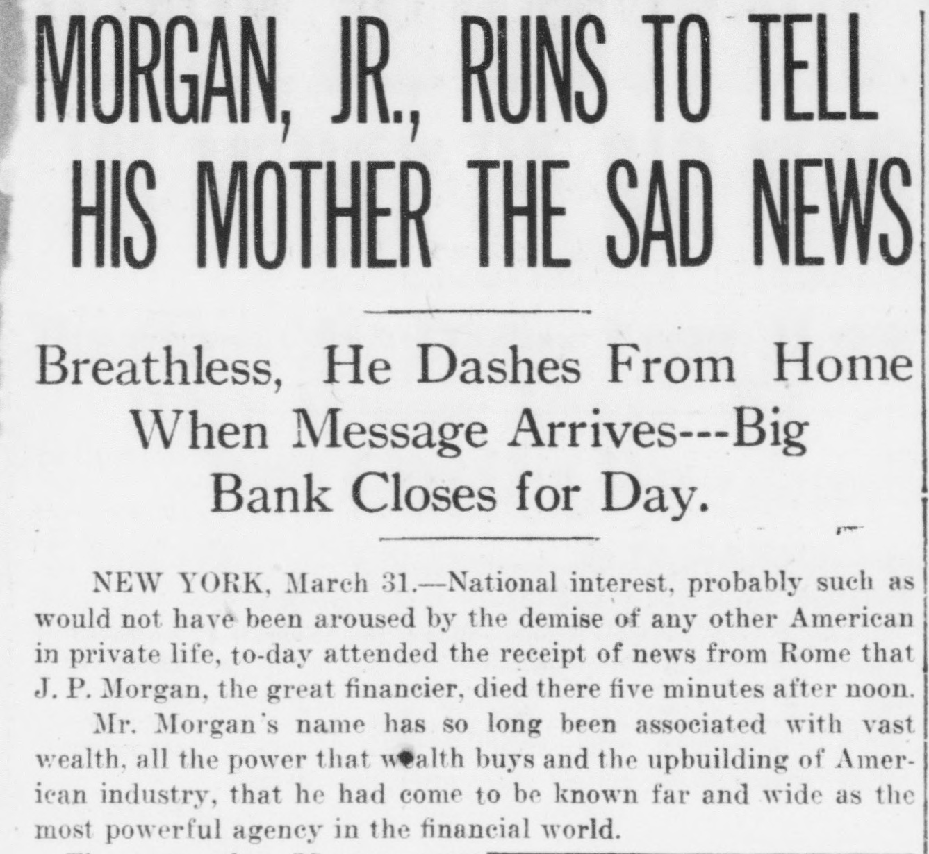 MORGAN, JR., RUNS TO TELL HIS MOTHER THE SAD NEWS Breathless, He Dashes From Home When Message Arrives---Big Bank Closes for Day. NEW YORK, March 31.-National interest, probably such as would not have been aroused by the demise of any other American in private life, to-day attended the receipt of news from Rome that J.P. Morgan, the great financier, died there five minutes after noon. Mr. Morgan's name has so long been associated with vast wealth, all the power that wealth buys and the upbuilding of American industry, that he had come to be known far and wide as the most powerful agency in the financial world.