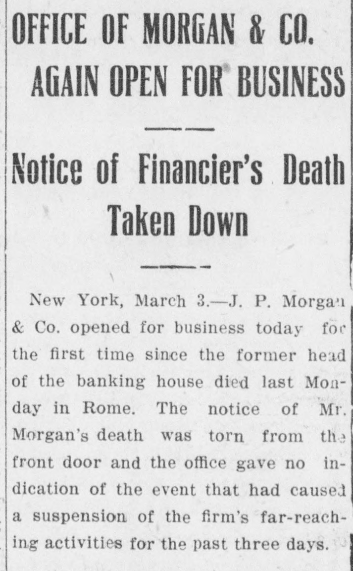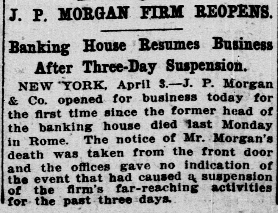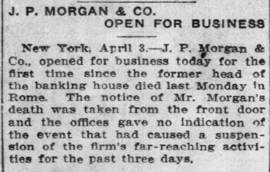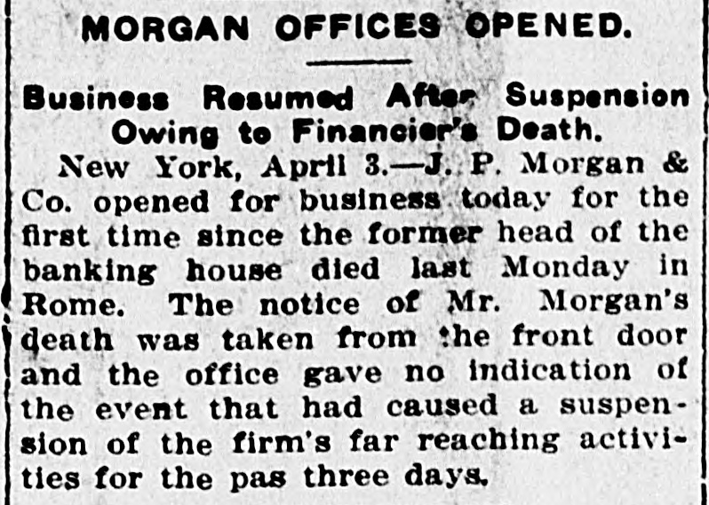 J. P. MORGAN FIRM REOPENS. Banking House Resumes Business After Three-Day Suspension. NEW YORK, April 3.-J. P. Morgan & Co. opened for business today for the first time since the former head of the banking house died last Monday in Rome. The notice of Mr. Morgan's death was taken from the front door and the offices gave no indication of the event that had caused a suspension of the firm's far-reaching activities for the past three days.