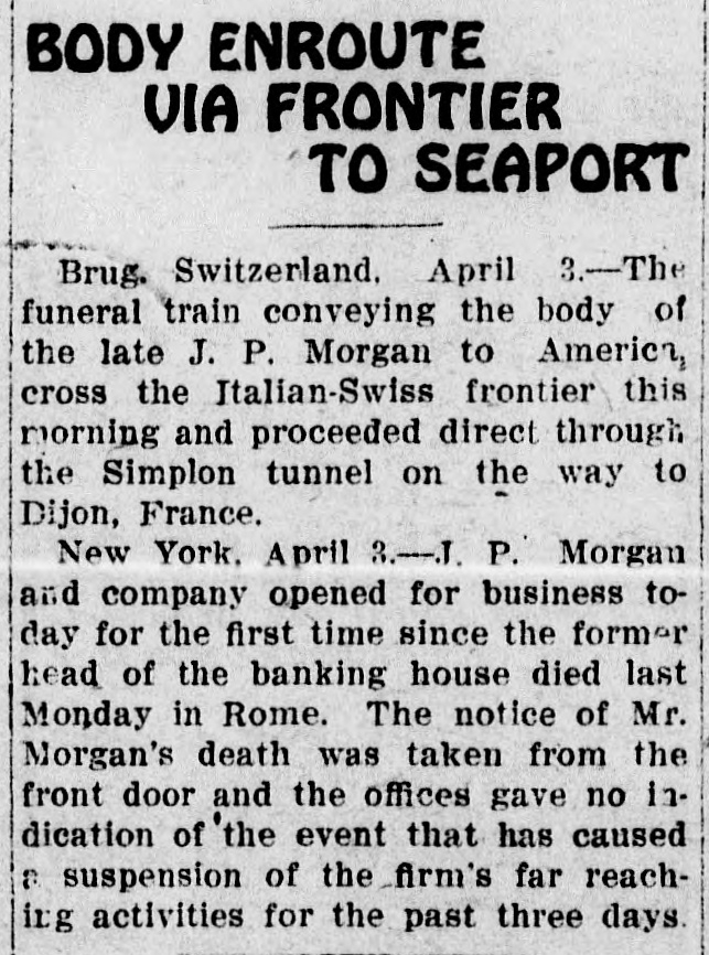 BODY ENROUTE VIA FRONTIER TO SEAPORT Brug. Switzerland. April - -The funeral train conveying the body of the late J. P. Morgan to America, cross the Italian-Swiss frontier this morning and proceeded direct through the Simplon tunnel on the way to Dijon, France. New York. April 3.--.T. P. Morgan and company opened for business today for the first time since the former head of the banking house died last Monday in Rome. The notice of Mr. Morgan's death was taken from the front door and the offices gave no indication of the event that has caused a suspension of the firm's far reachirg activities for the past three days.