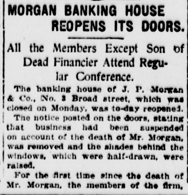 MORGAN BANKING HOUSE REOPENS ITS DOORS. All the Members Except Son of Dead Financier Attend Regular Conference. The banking house of J. P. Morgan & Co., No. 3 Broad street, which was closed on Monday, was to-day reopened. The notice posted on the doors, stating that business had been suspended on account of the death of Mr. Morgan, was removed and the shades behind the windows, which were half-drawn, were raised. For the first time since the death of Mr. Morgan, the members of the firm,